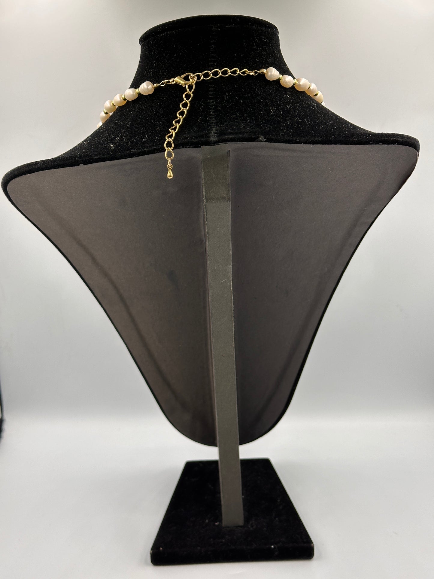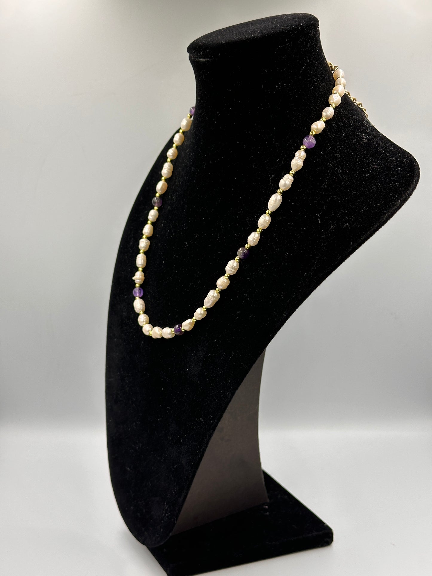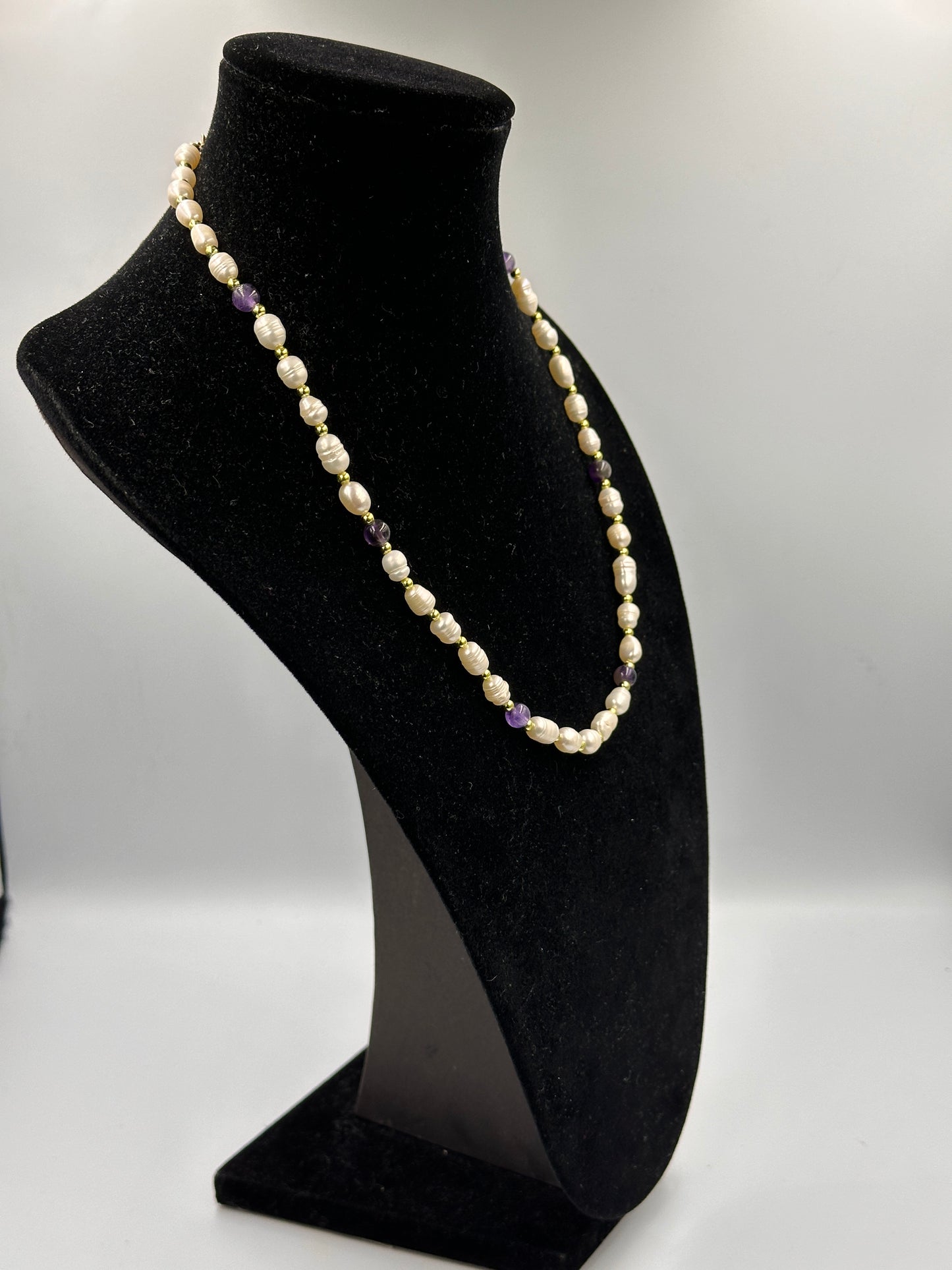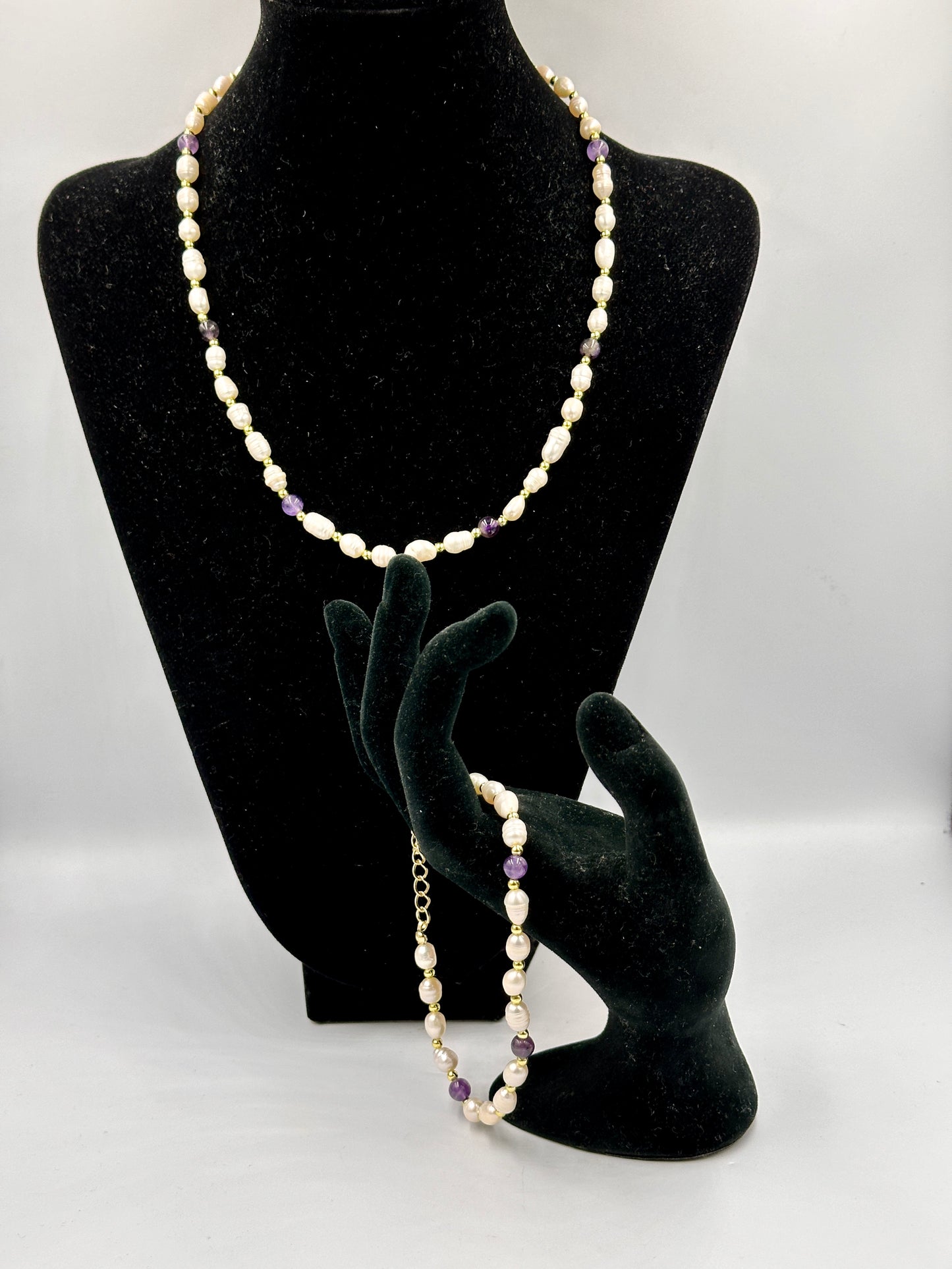 Beschreibung: Diese elegante Perlenkette besticht durch ihre violett schimmernden Kugeln, die von goldfarbenen Akzenten kunstvoll ergänzt werden. Das Set beinhaltet eine passende Perlenarmband.