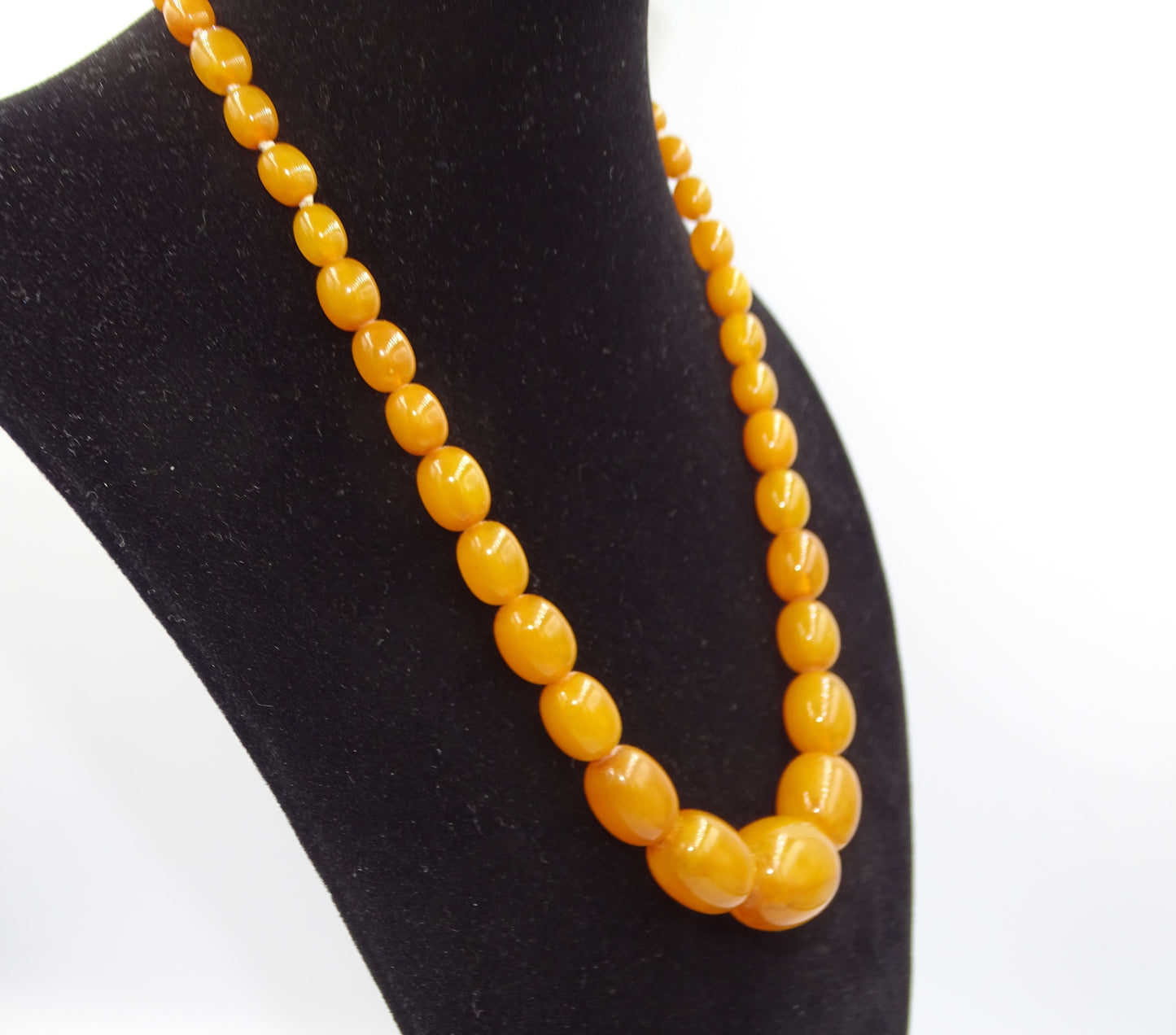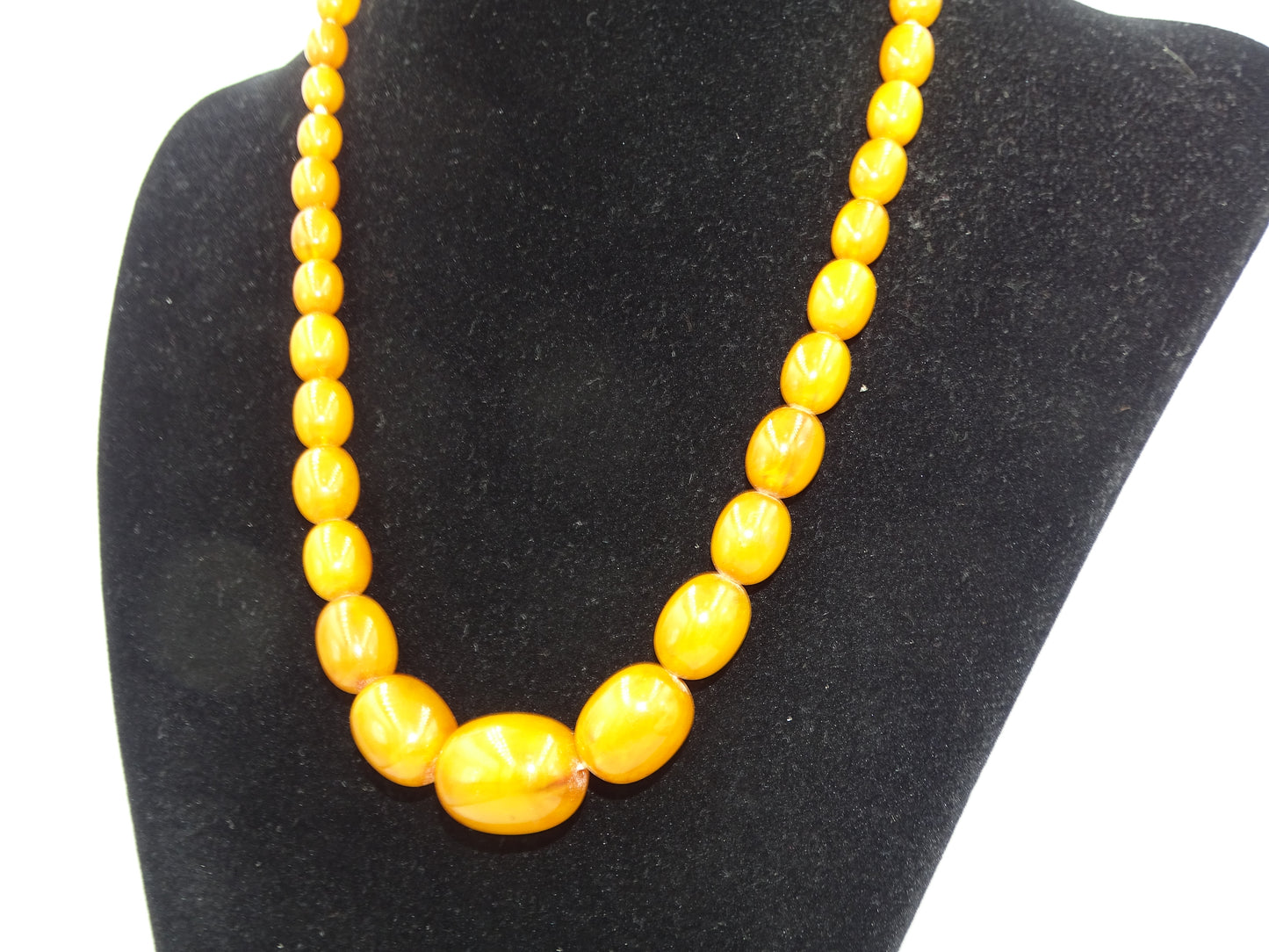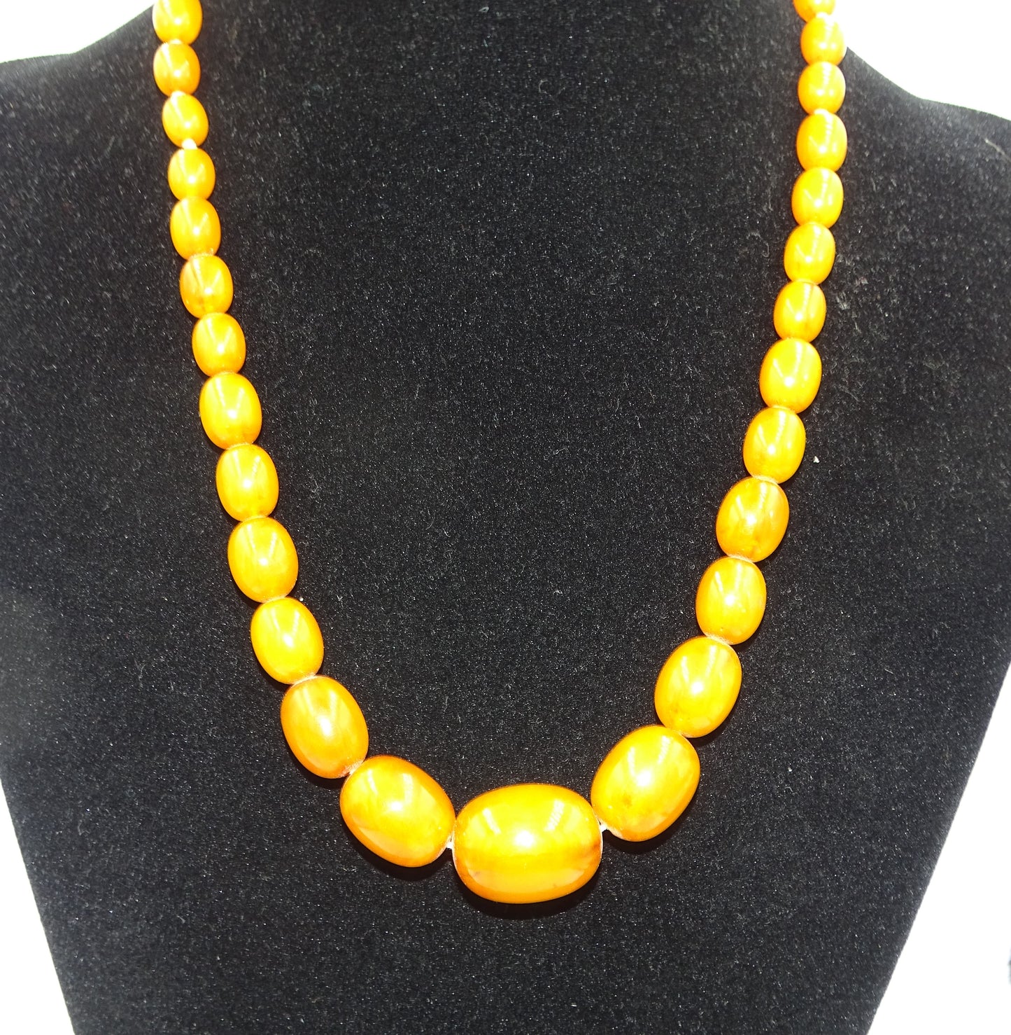 Beschreibung: Tauchen Sie ein in die zeitlose Eleganz mit dieser exquisiten Bakelit-Kette in Olivenform, kunstvoll gestaltet aus edlem Bernsteinimitat. Jede Perle strahlt mit ihrem warmen Farbton und ihrer natürlichen Maserung eine einzigartige Schönheit aus.