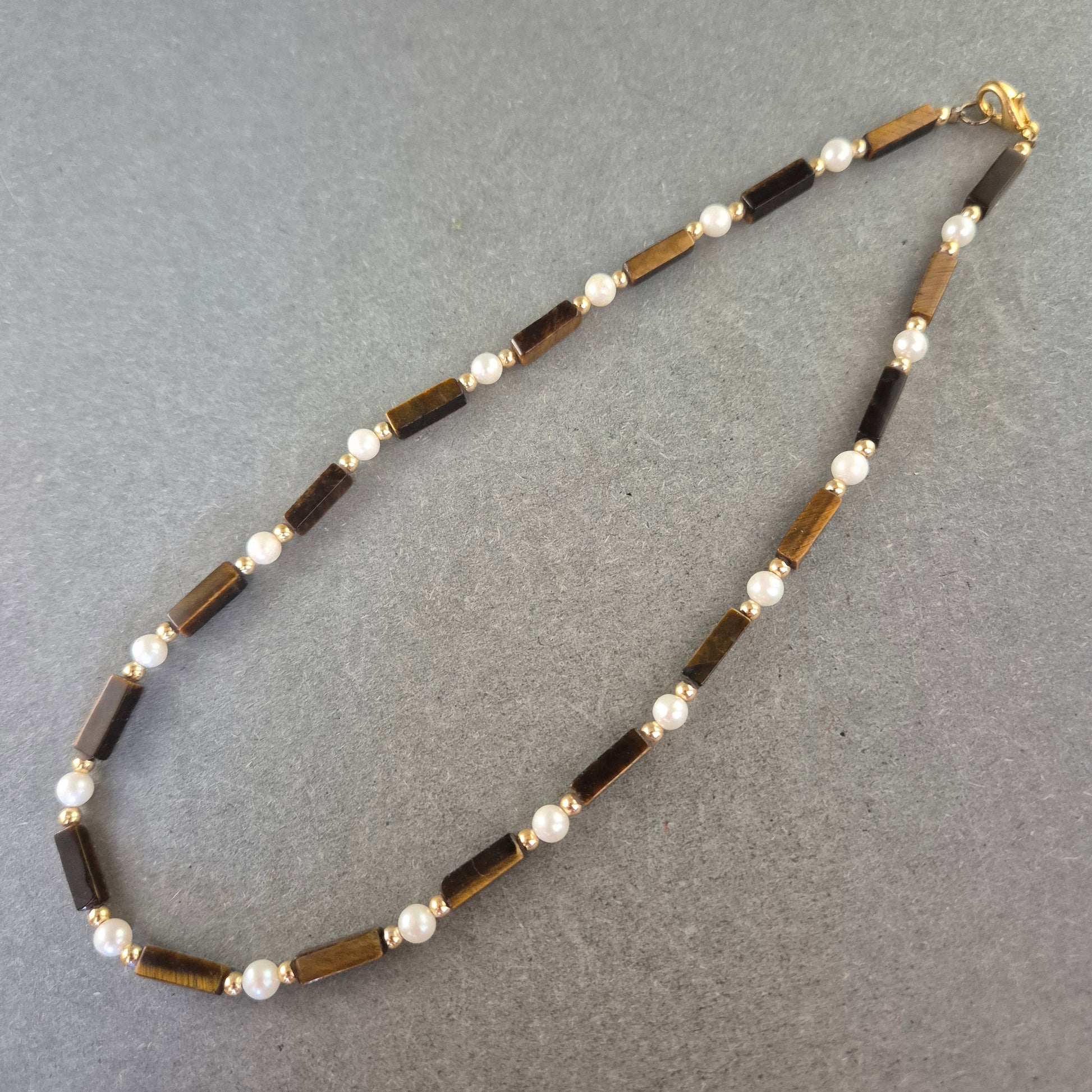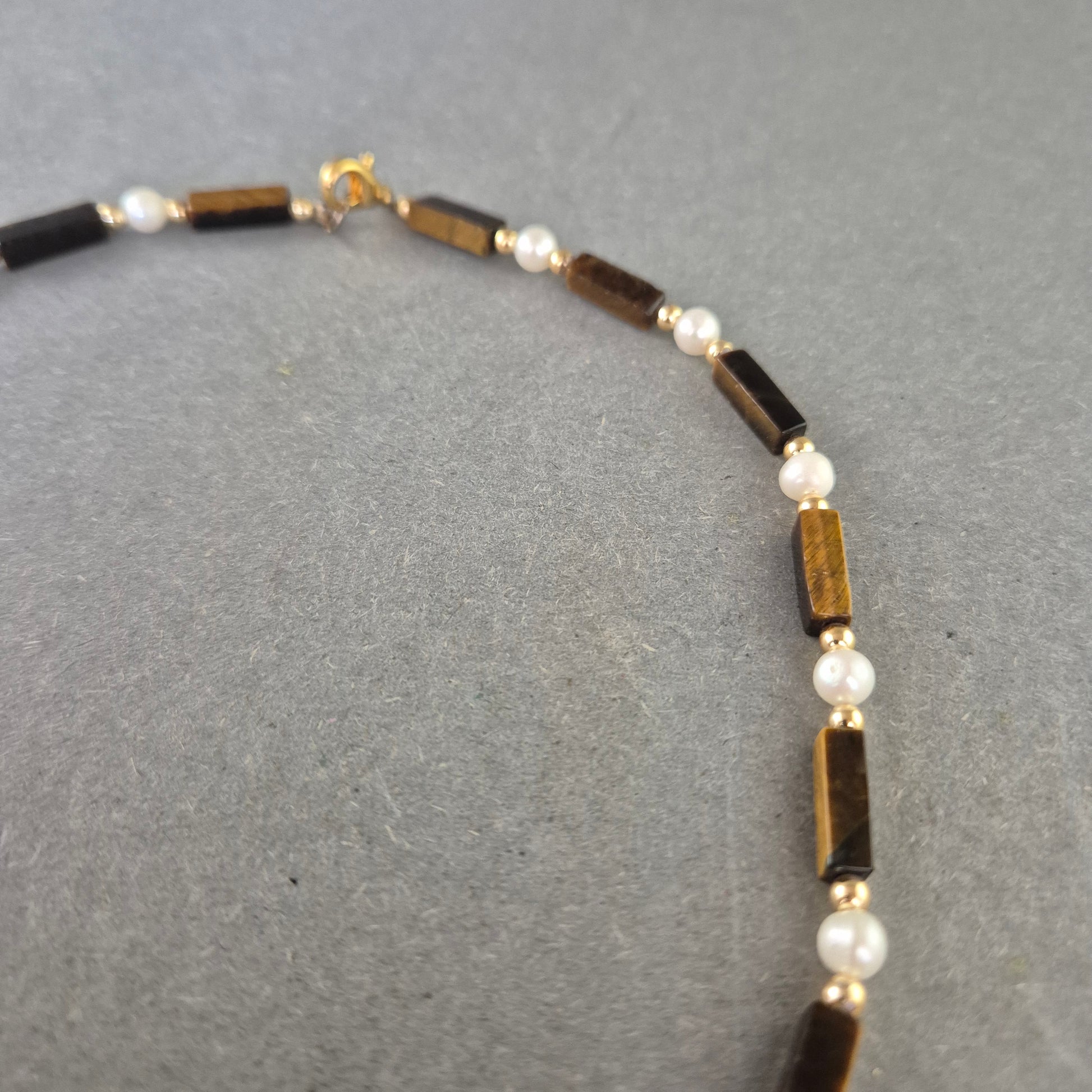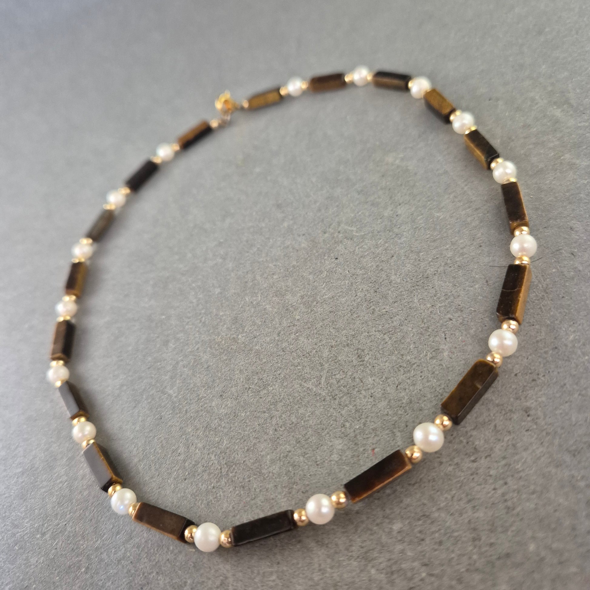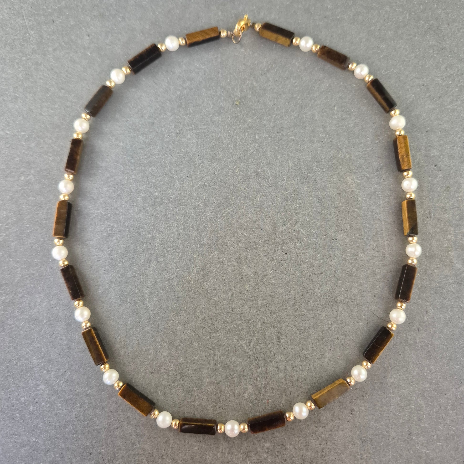 Diese elegante Halskette kombiniert rechteckige Tigerauge-Steine mit glänzenden weißen Perlen. Die warmen Brauntöne des Tigerauges harmonieren perfekt mit dem sanften Schimmer der Perlen und verleihen der Kette einen edlen, zeitlosen Charakter. Goldfarbene Zwischenelemente setzen zusätzliche Akzente und runden das elegante Design ab. Ein Federringverschluss sorgt für sicheren Halt.