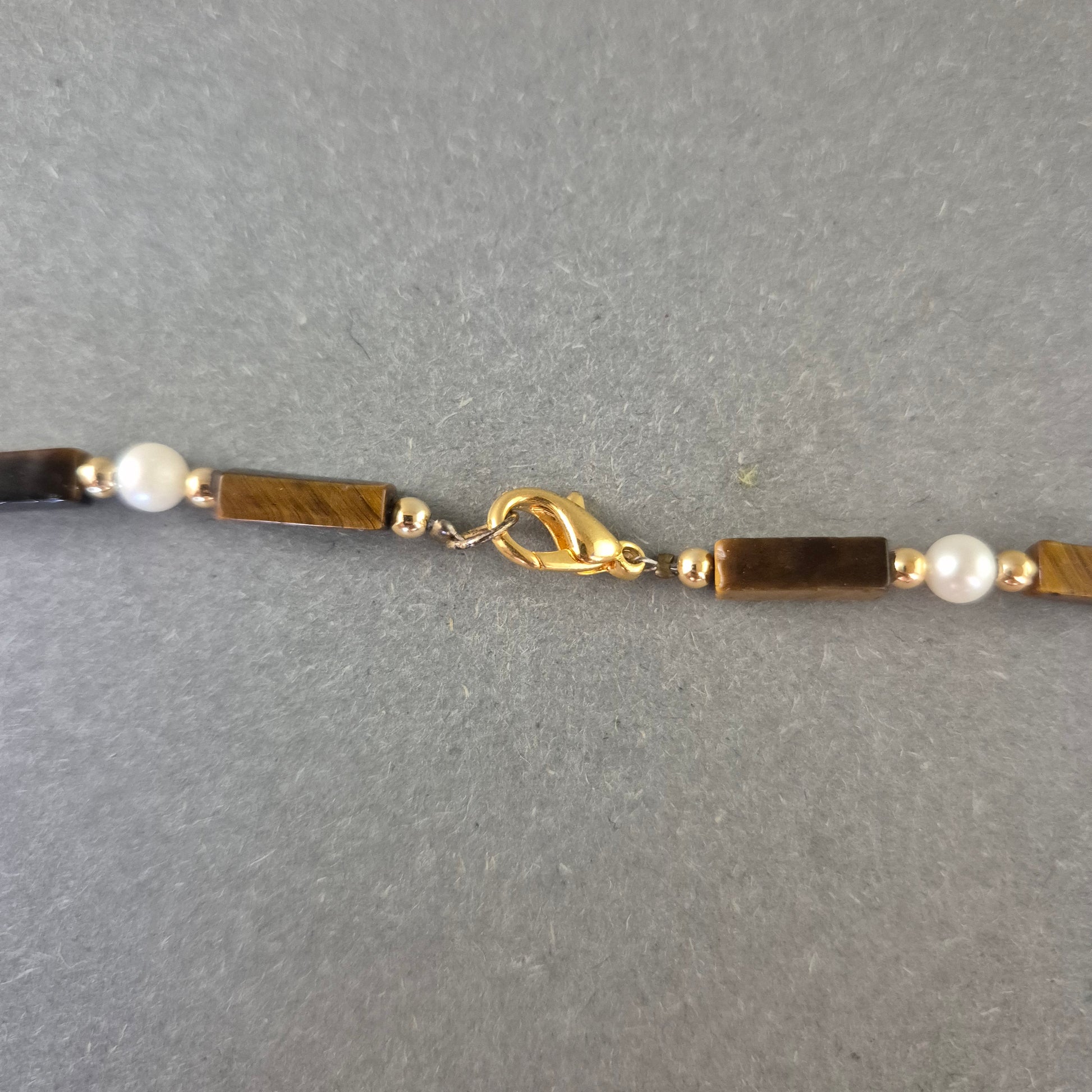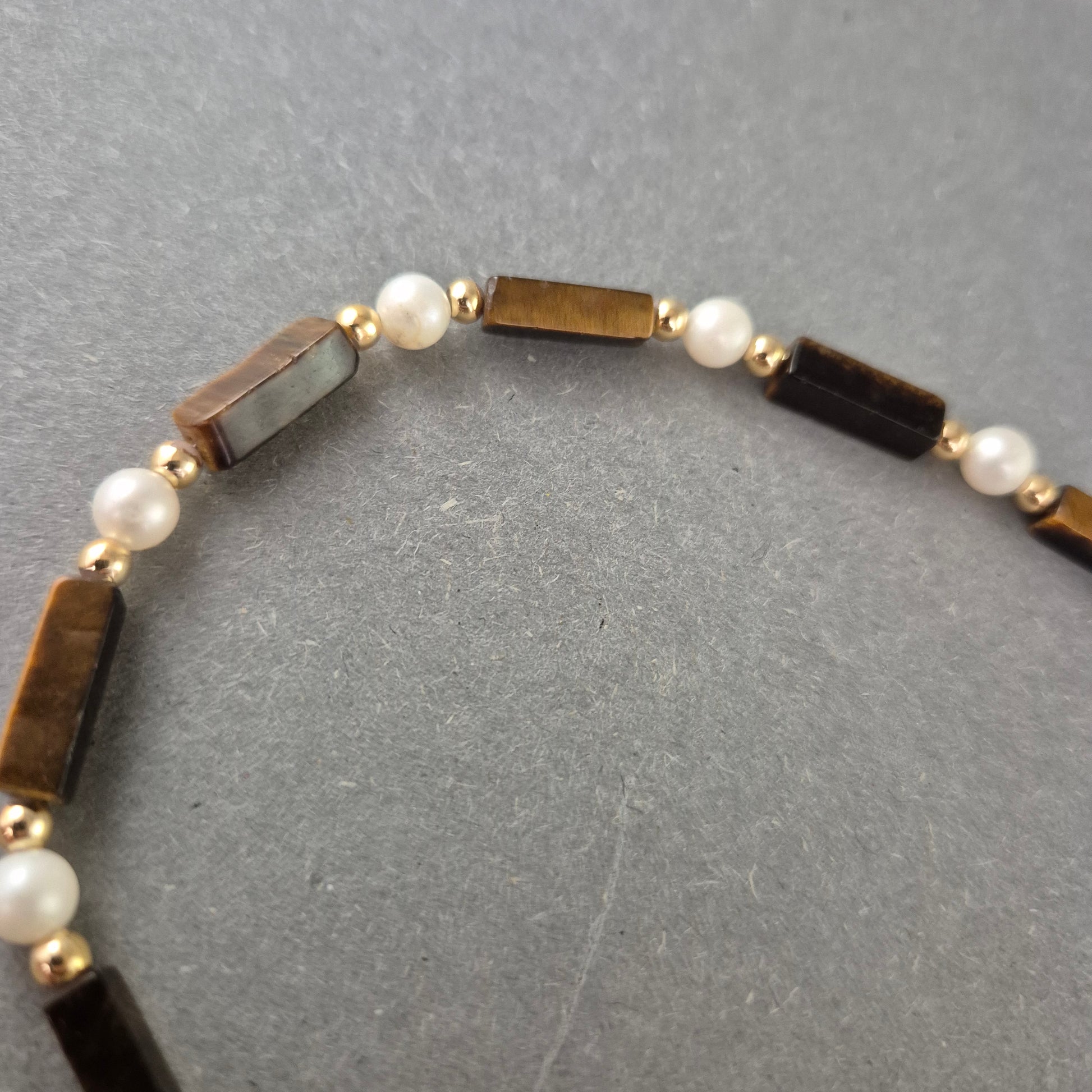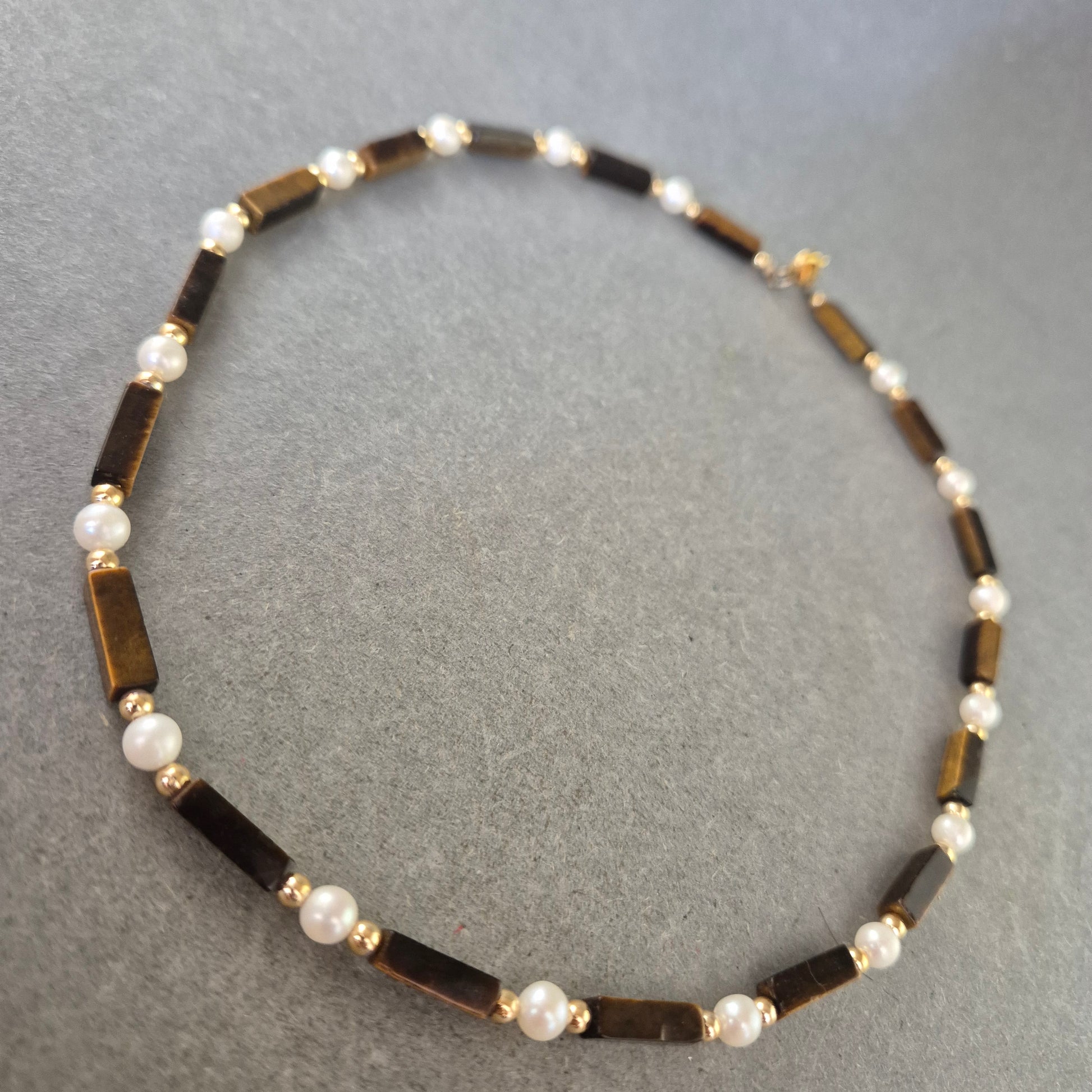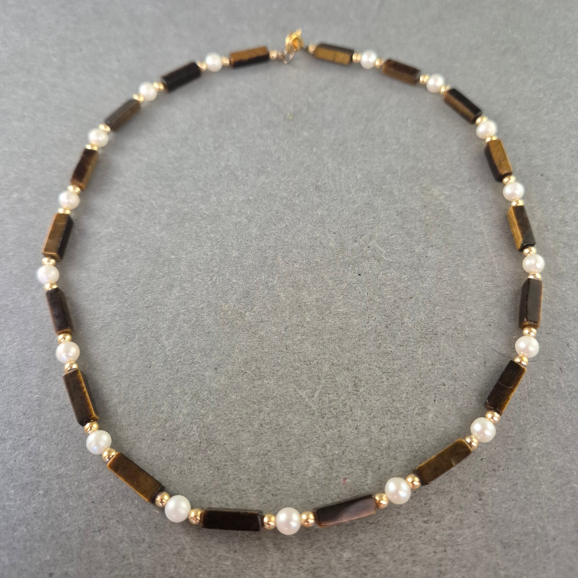 Diese elegante Halskette kombiniert rechteckige Tigerauge-Steine mit glänzenden weißen Perlen. Die warmen Brauntöne des Tigerauges harmonieren perfekt mit dem sanften Schimmer der Perlen und verleihen der Kette einen edlen, zeitlosen Charakter. Goldfarbene Zwischenelemente setzen zusätzliche Akzente und runden das elegante Design ab. Ein Federringverschluss sorgt für sicheren Halt.