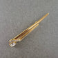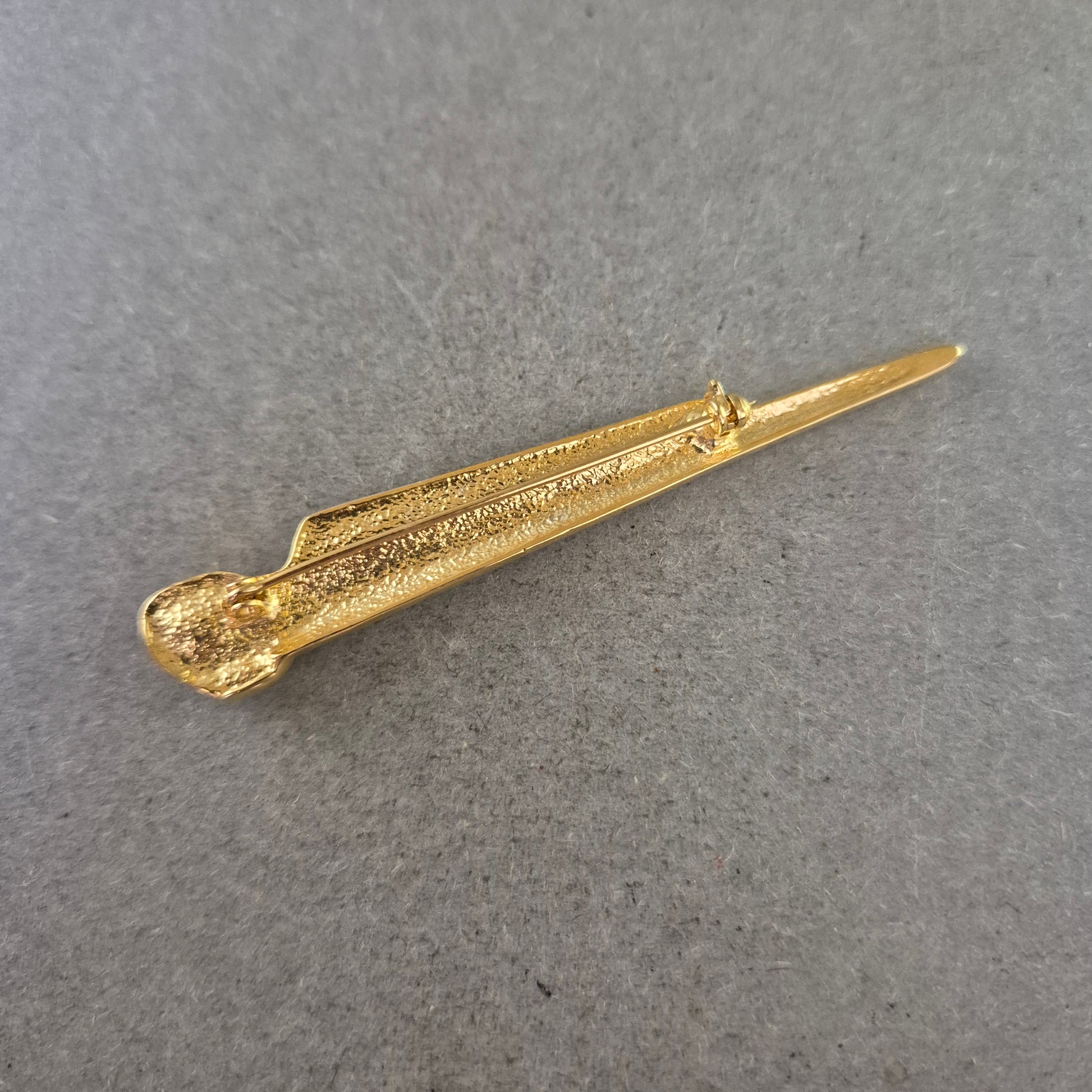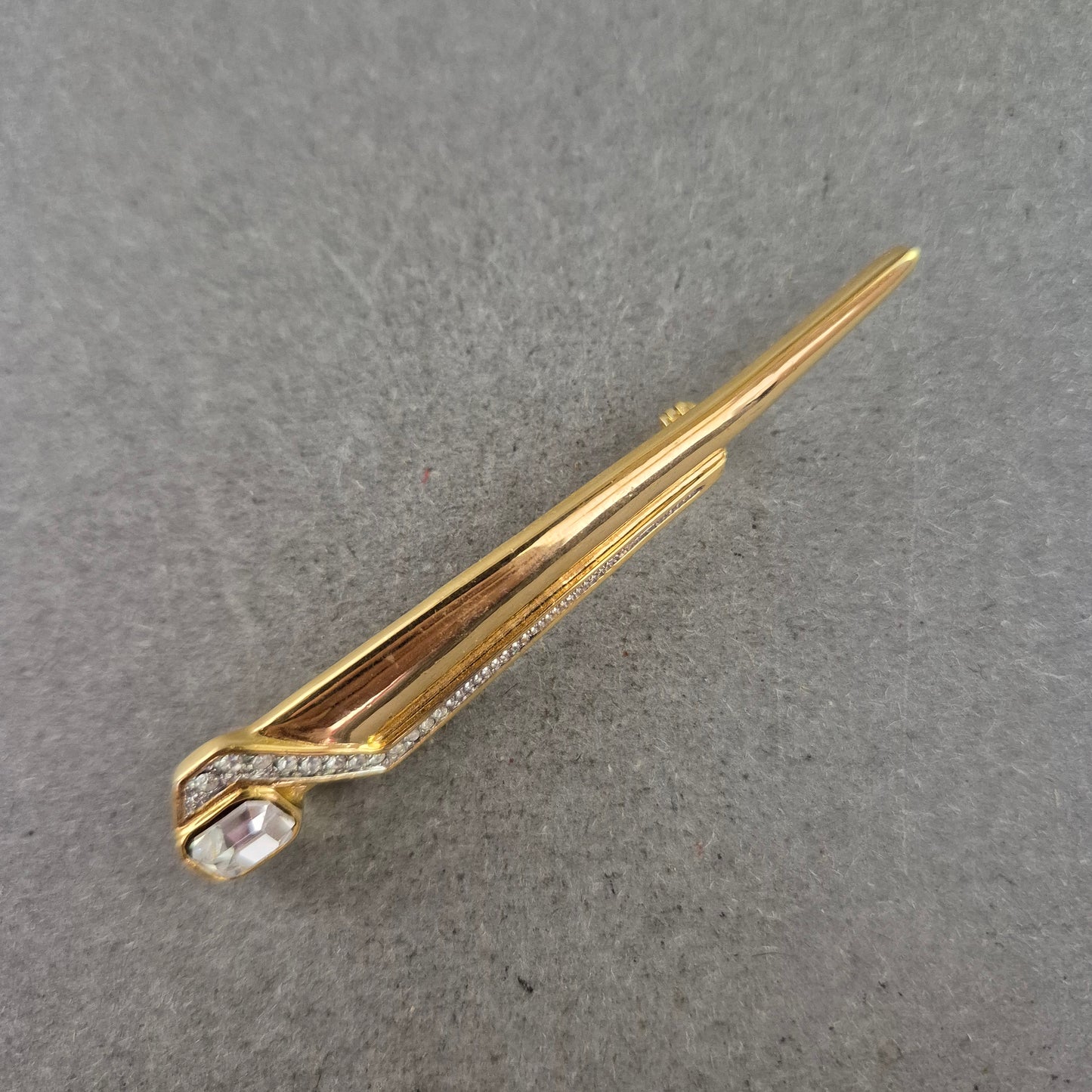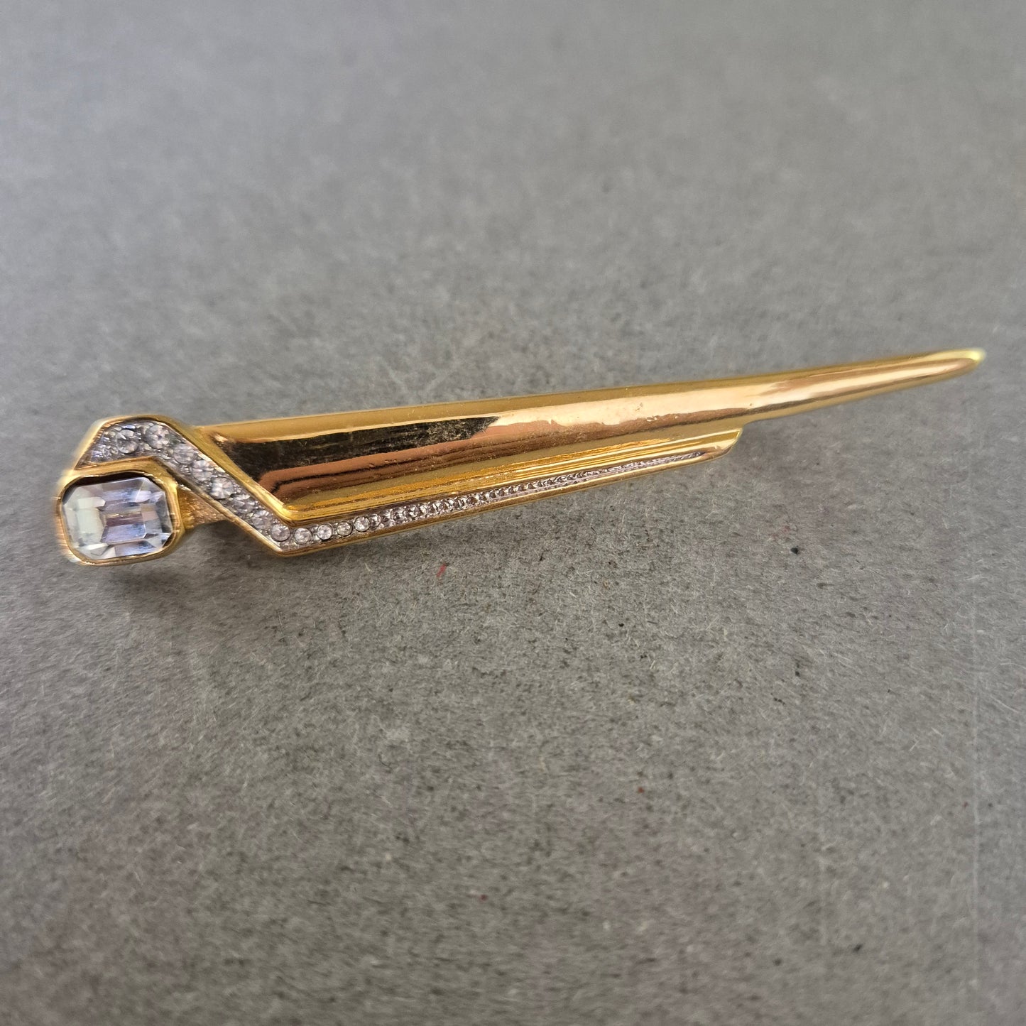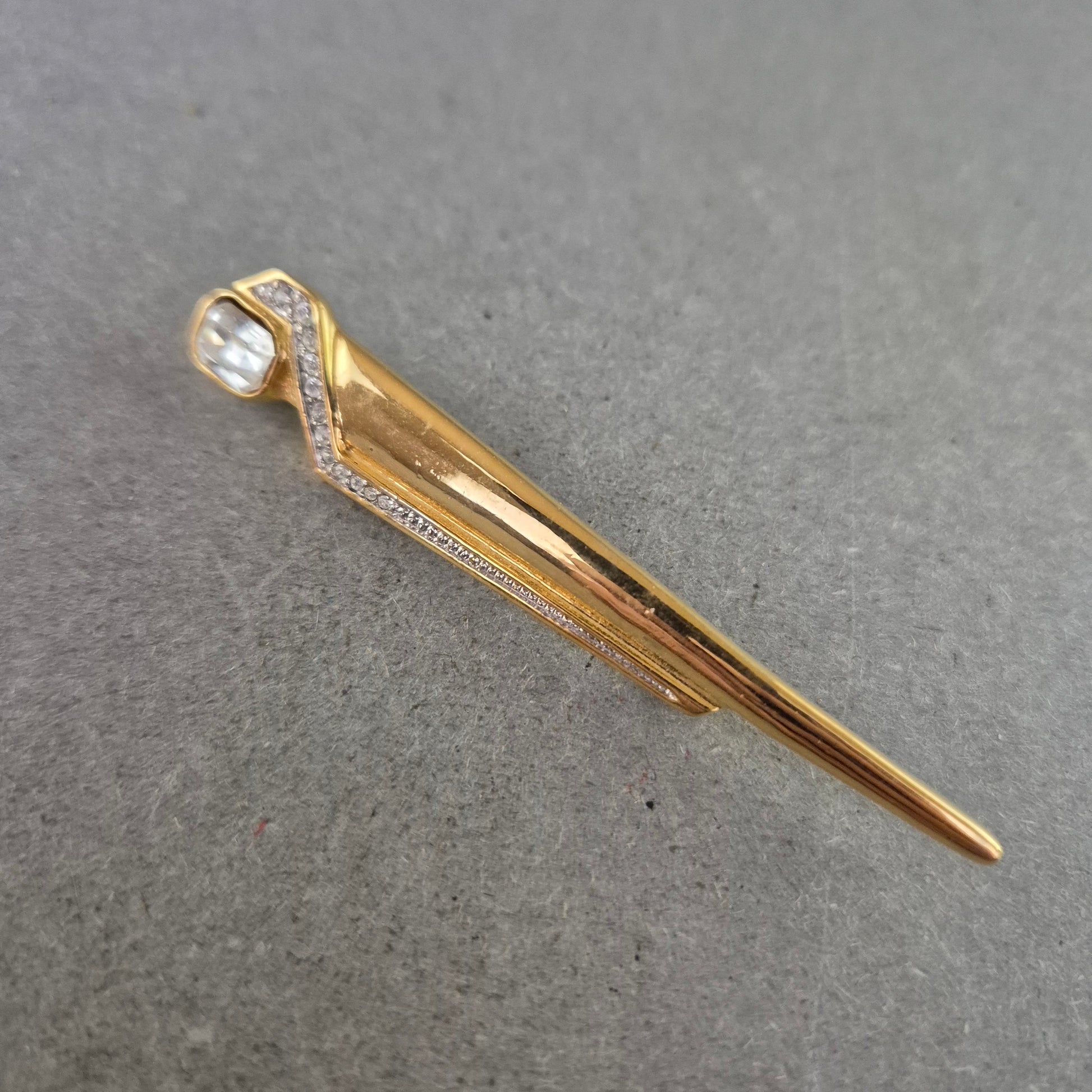 Diese elegante Brosche in Goldoptik vereint klare Linien mit einem Hauch von Glamour. Das längliche, asymmetrische Design ist mit feinen Strasssteinen verziert und wird durch einen funkelnden Glasstein akzentuiert. Das stilvolle Schmuckstück eignet sich ideal als Blickfang auf Blusen, Jacken oder Schals – perfekt für Liebhaberinnen klassischer Eleganz.