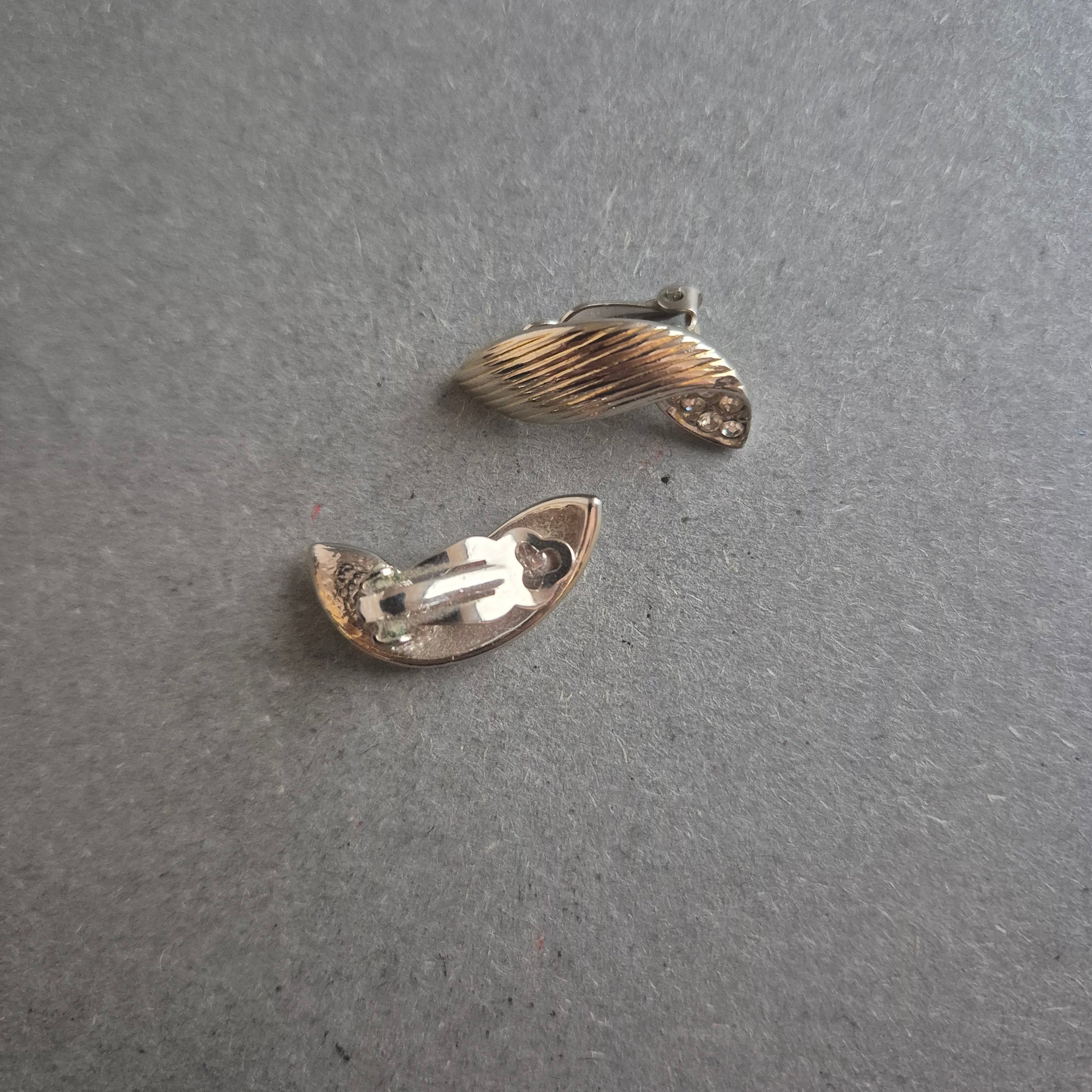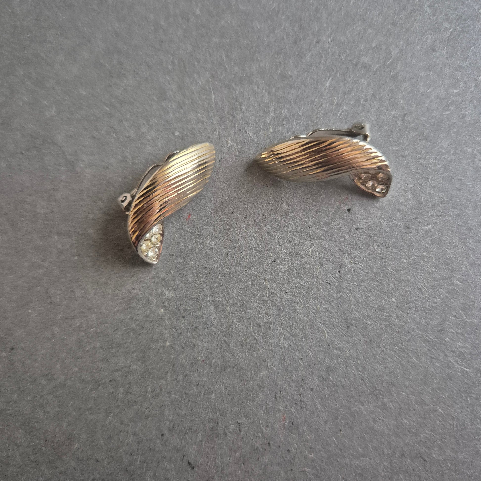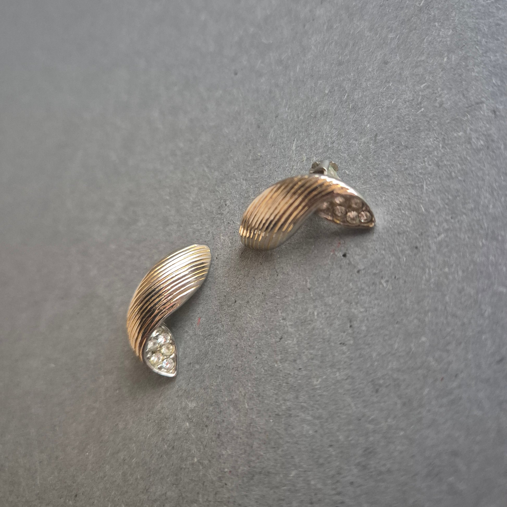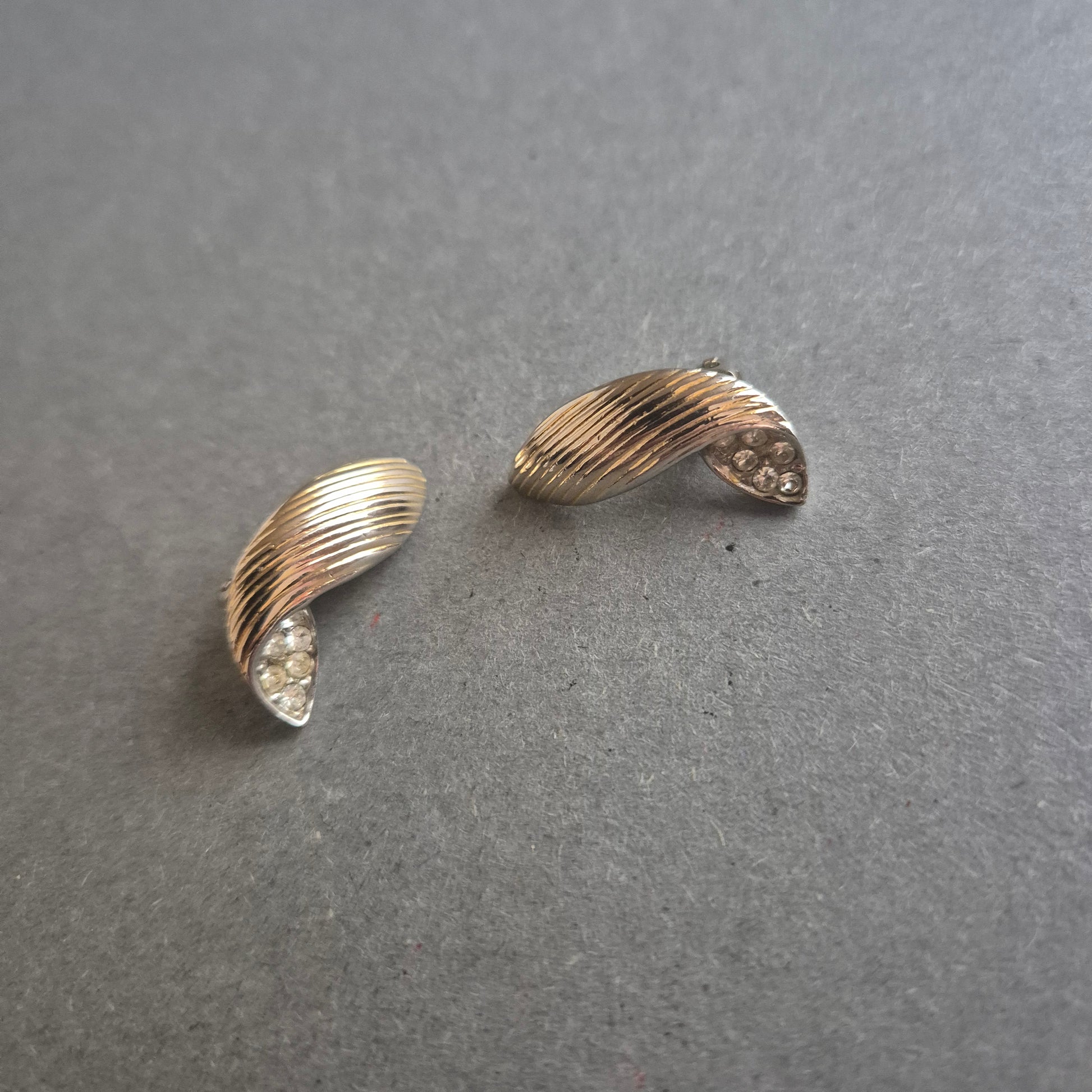 Diese geschwungenen Clip-Ohrringe im Retro-Stil sind ein stilvolles Accessoire für elegante Anlässe. Das goldfarbene, geriffelte Design wird durch ein dezentes Strass-Element im unteren Bereich aufgewertet, das dezent funkelt. Der Clipverschluss sorgt für komfortablen Halt – auch ohne Ohrlöcher tragbar.
