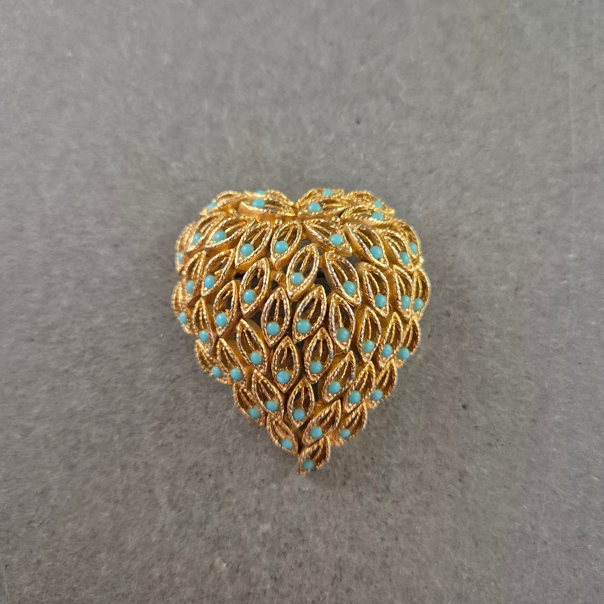 Diese elegante Brosche besticht durch ihr kunstvolles Blattdesign in goldfarbener Optik. Die filigranen Elemente sind mit kleinen türkisfarbenen Steinen verziert, die der Brosche einen edlen, farblichen Kontrast verleihen. Ideal als Accessoire für Blusen, Jacken oder Schals – ein stilvolles Schmuckstück, das jedes Outfit aufwertet.