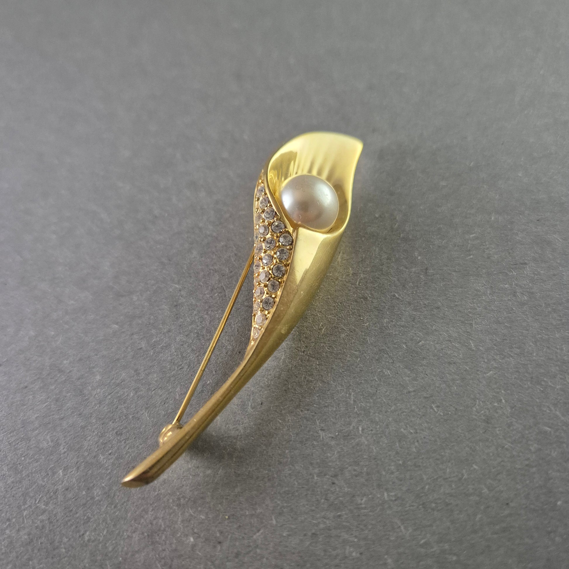 Elegante goldene Calla-Lilie Brosche mit Perle und Strasssteinen