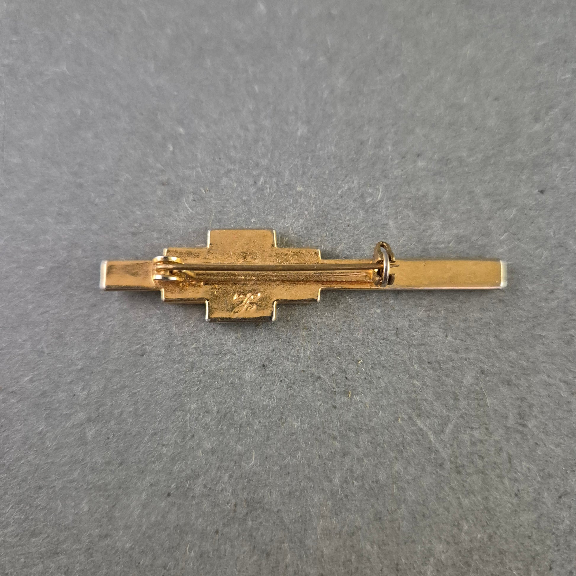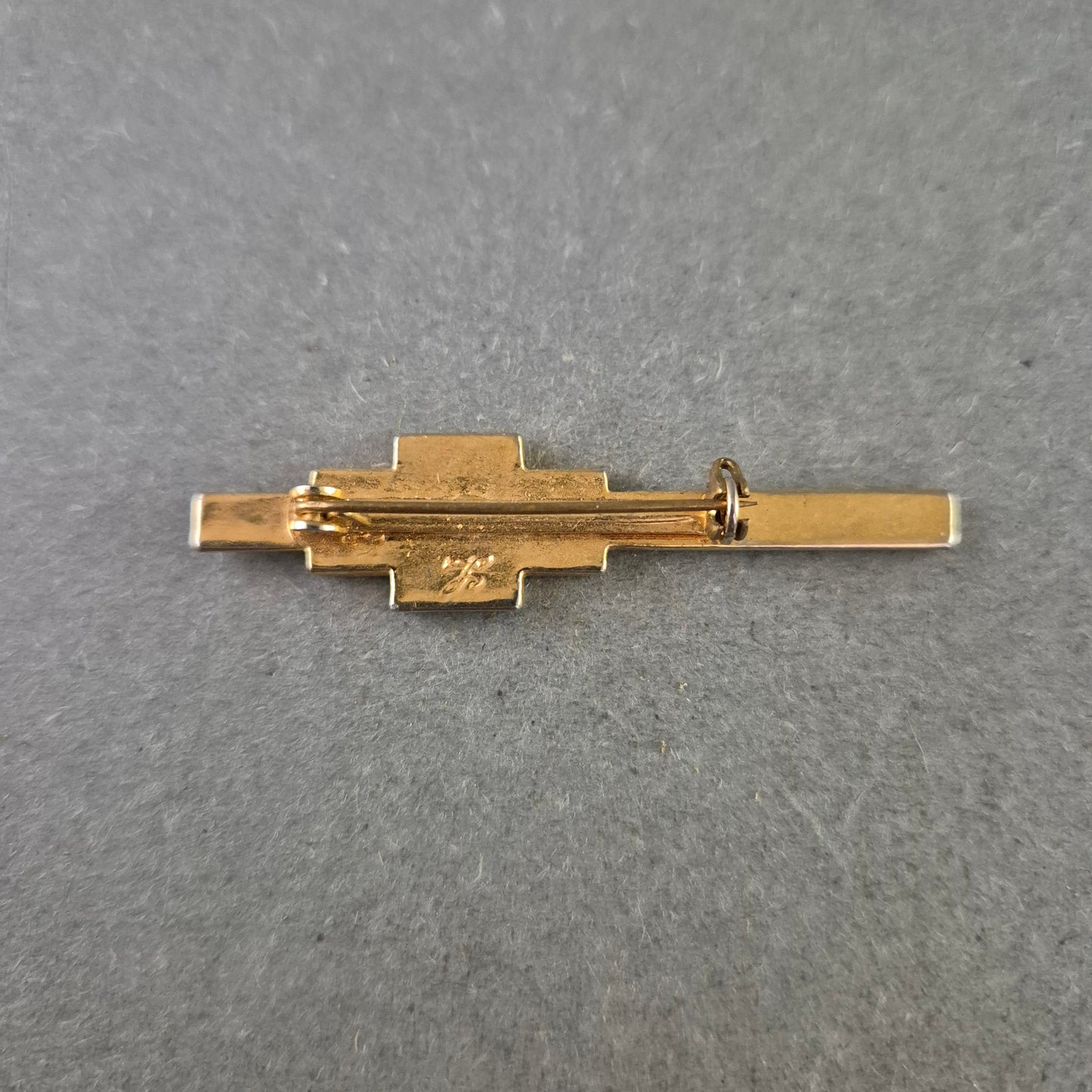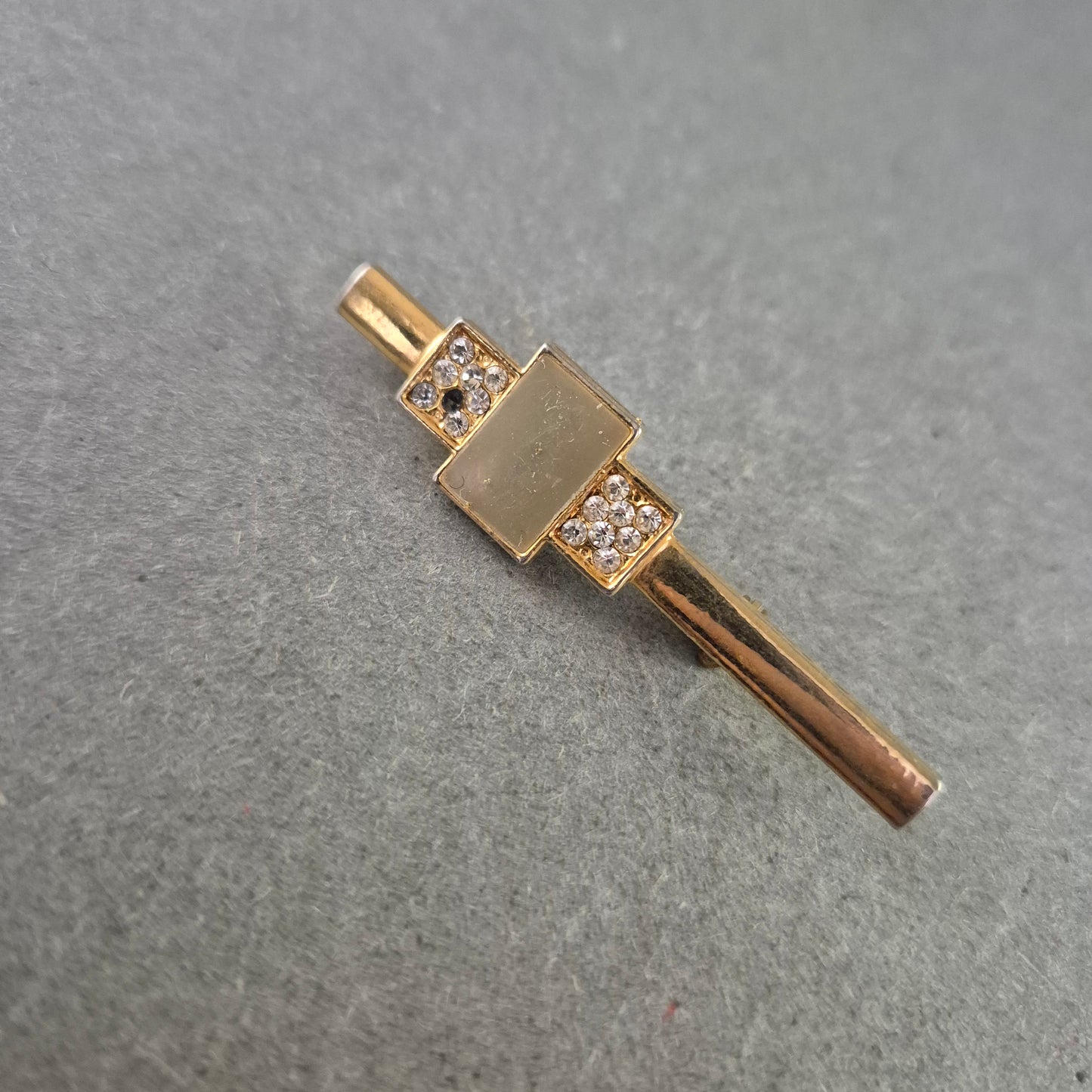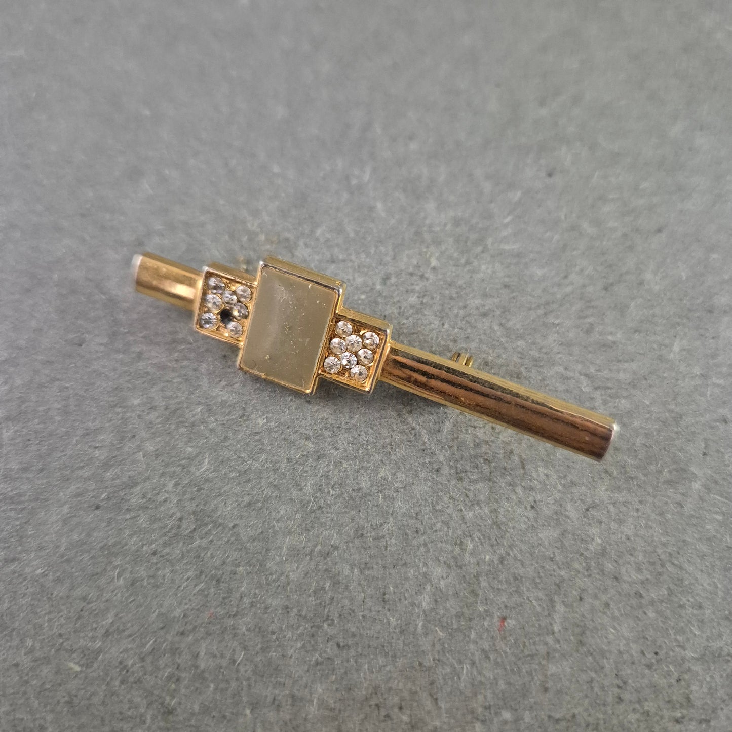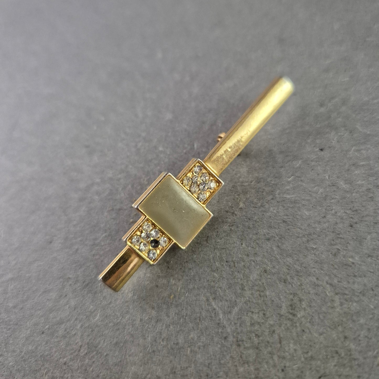 Eine exquisite Brosche in Goldfarbe, verziert mit funkelnden Zirkonia-Steinen und einem zentralen, cremefarbenen Element. Dieses Stück im Art-déco-Stil verleiht jedem Outfit einen Hauch von Glamour.