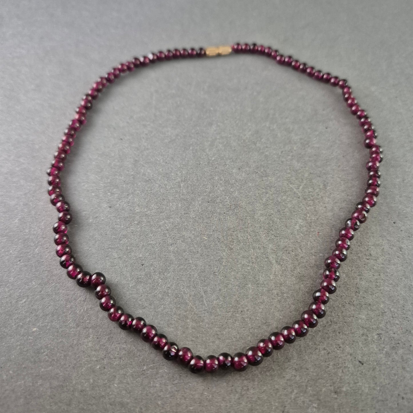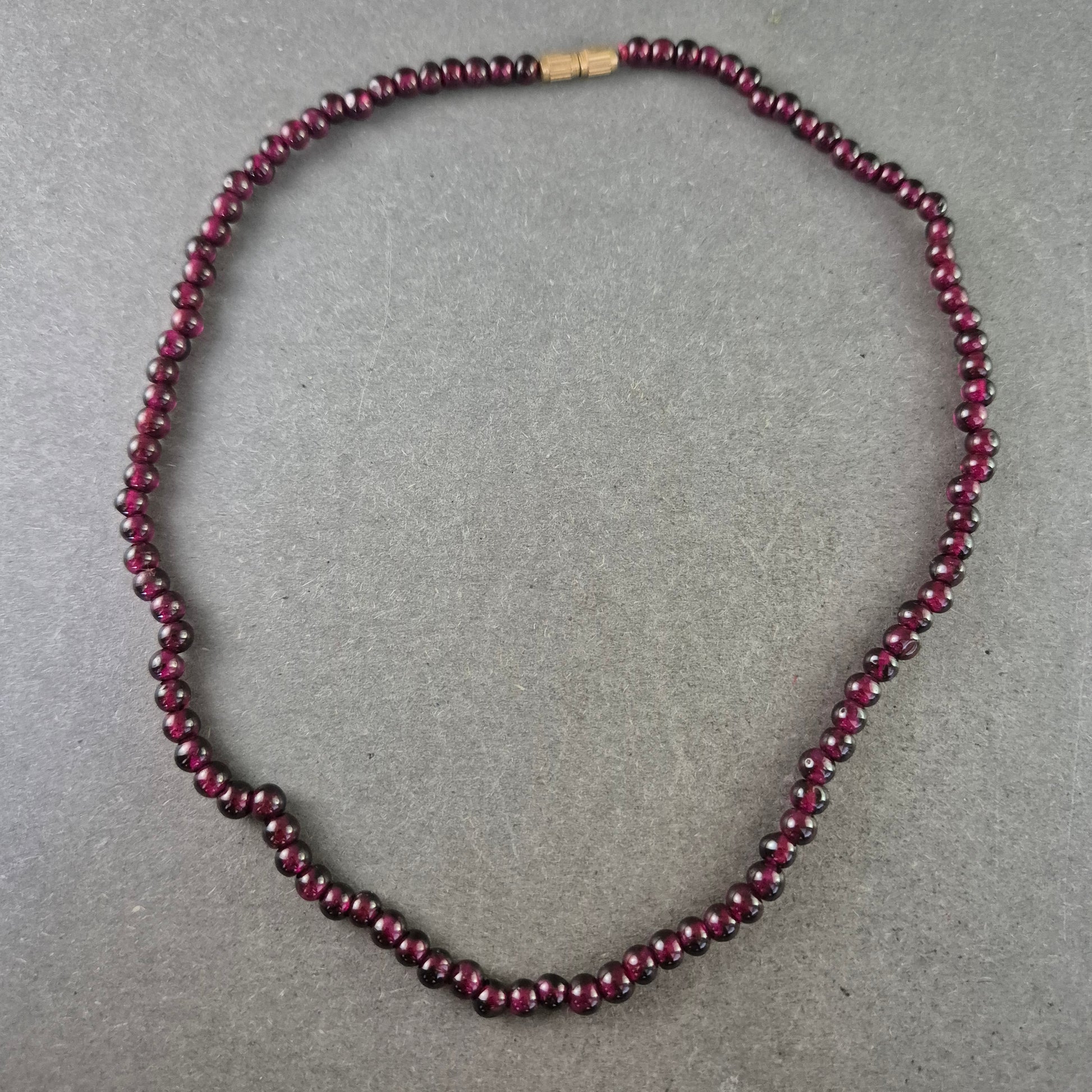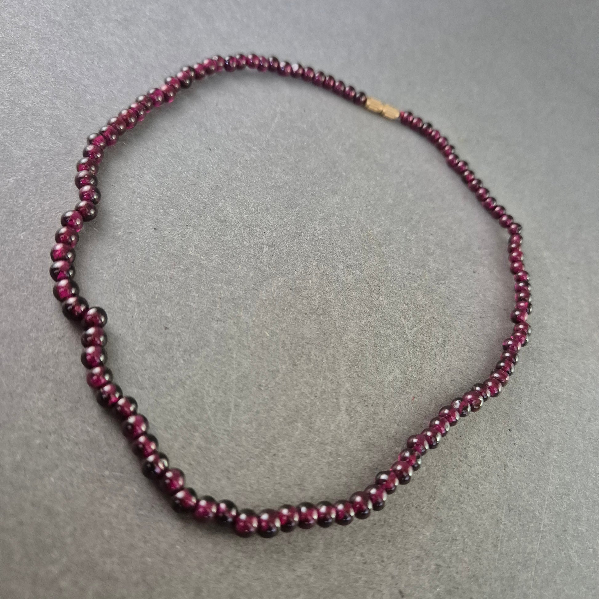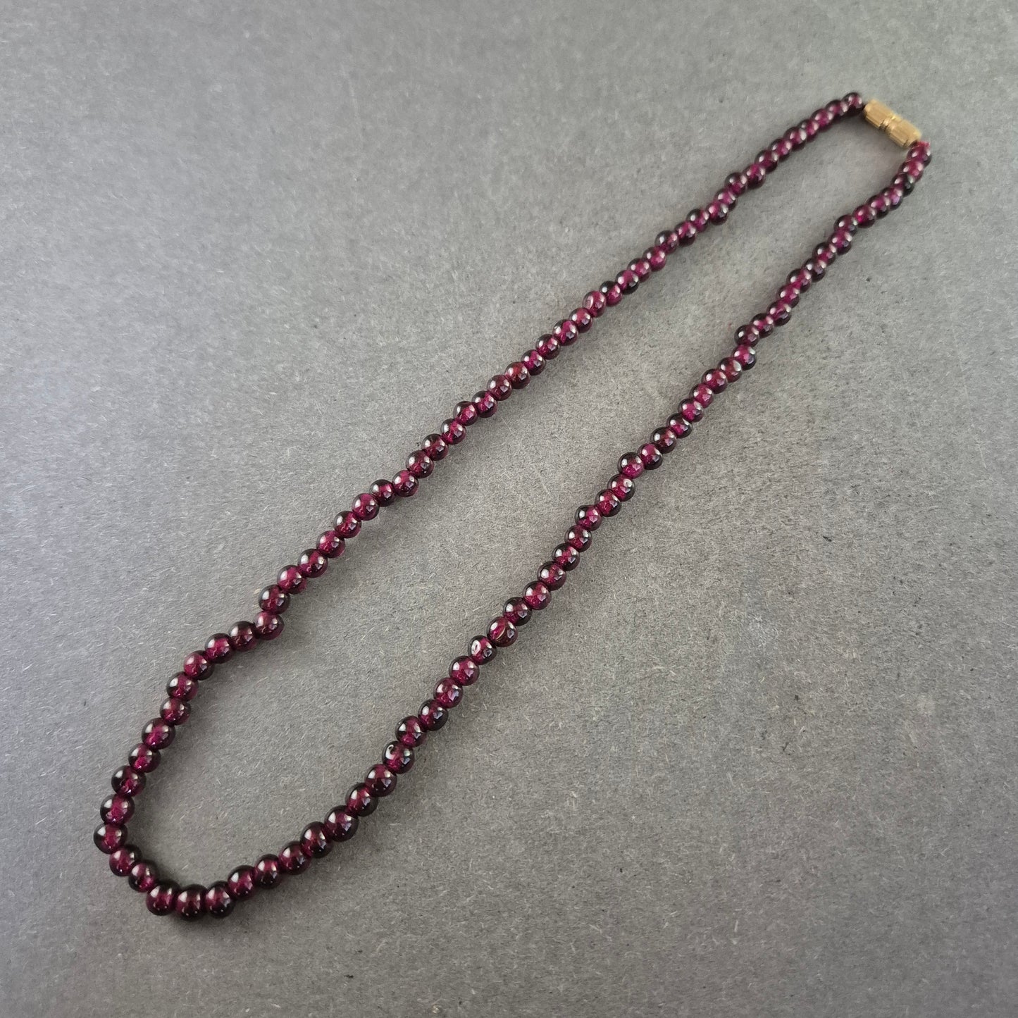 Diese elegante Halskette aus tiefroten Granatperlen strahlt eine klassische Schönheit aus. Die glatten, rund geschliffenen Steine sind gleichmäßig aufgereiht und wirken besonders edel durch ihre glänzende Oberfläche. Ideal für Liebhaberinnen natürlicher Edelsteine und stilvoller Accessoires.