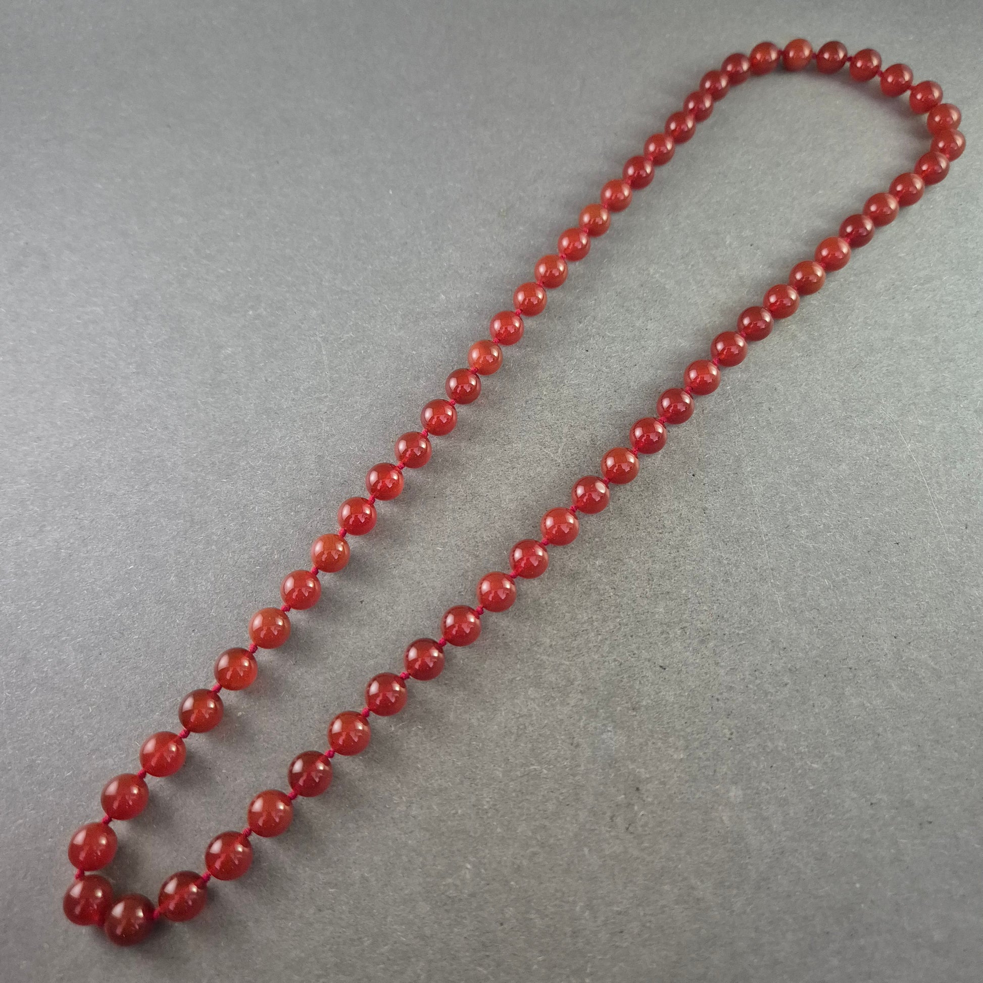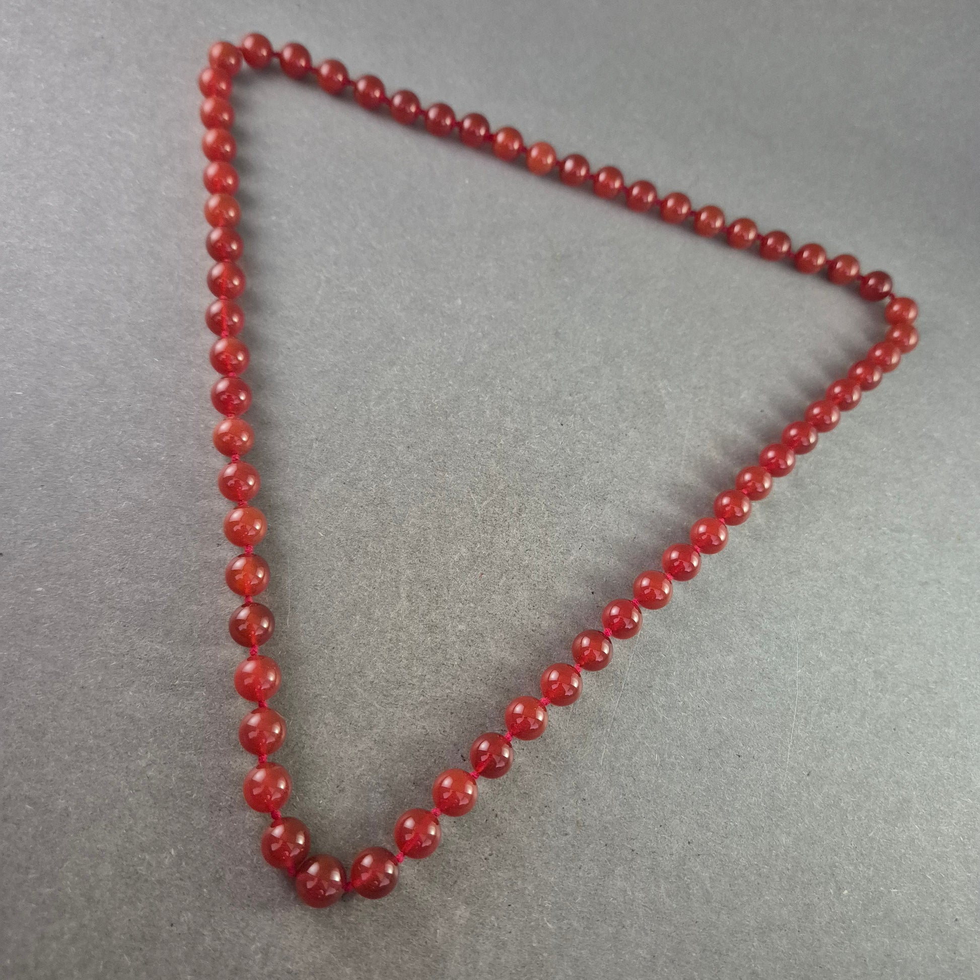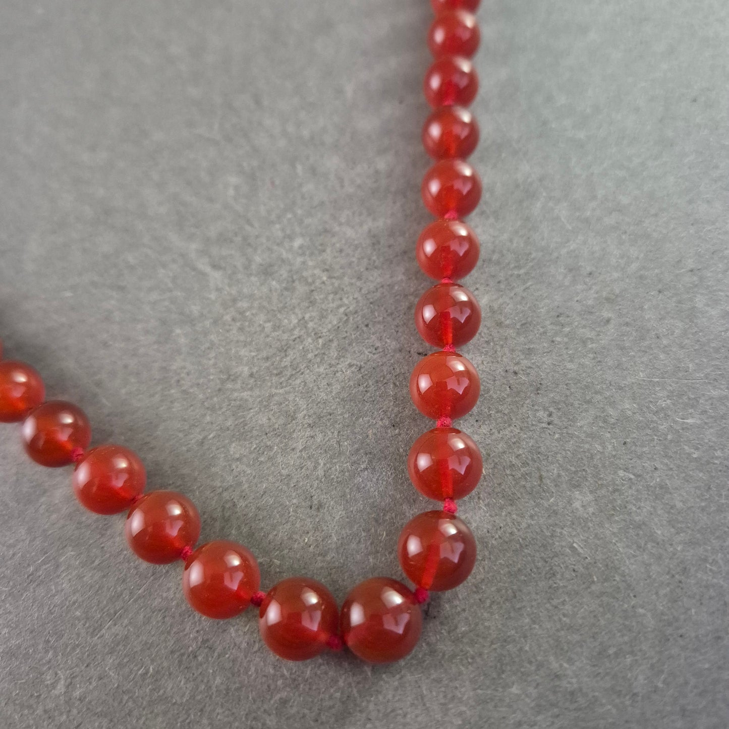 Eine klassische und dennoch auffällige Halskette, gefertigt aus runden, leuchtend roten Karneol-Perlen. Die Perlen sind auf einer robusten Schnur aufgereiht und strahlen eine natürliche Schönheit aus.