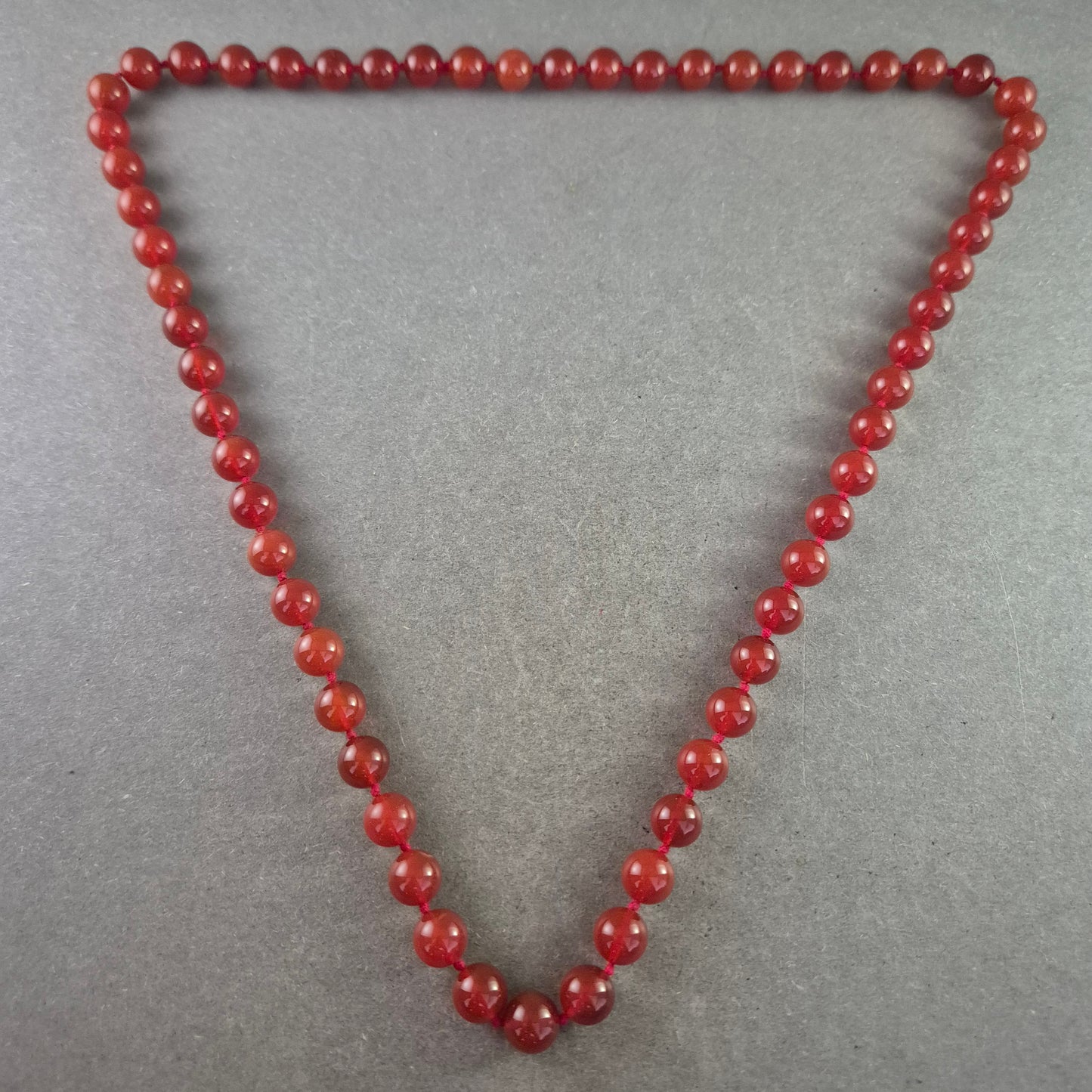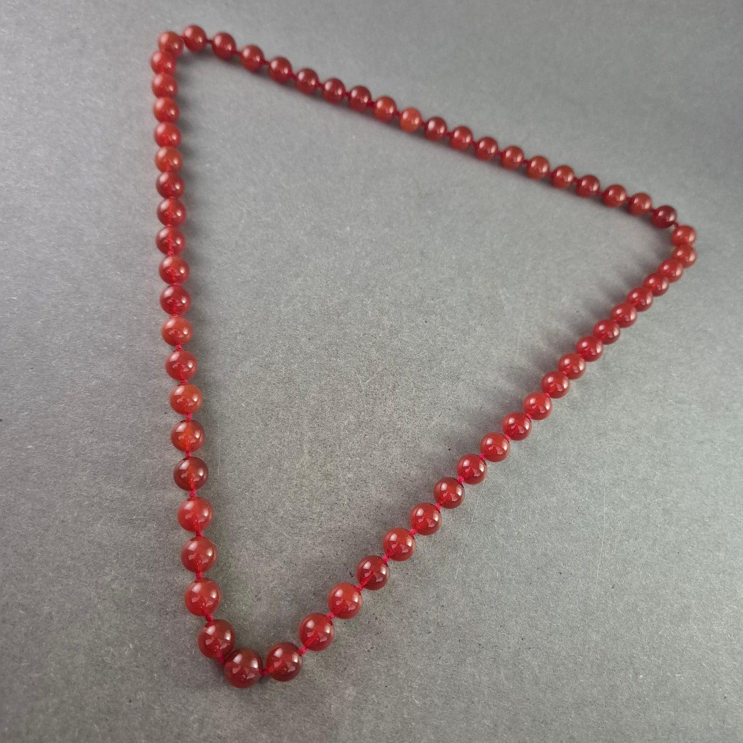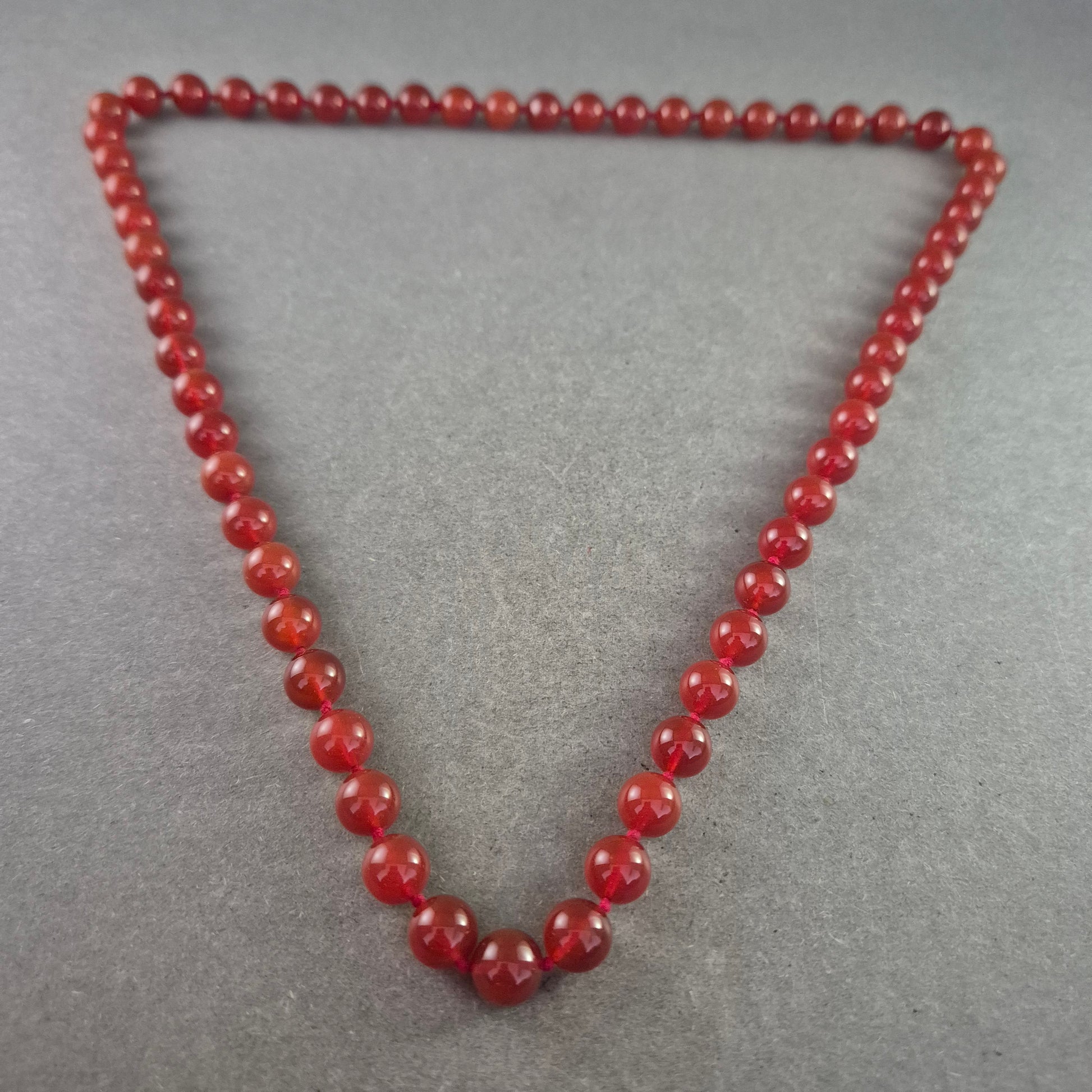 Eine klassische und dennoch auffällige Halskette, gefertigt aus runden, leuchtend roten Karneol-Perlen. Die Perlen sind auf einer robusten Schnur aufgereiht und strahlen eine natürliche Schönheit aus.
