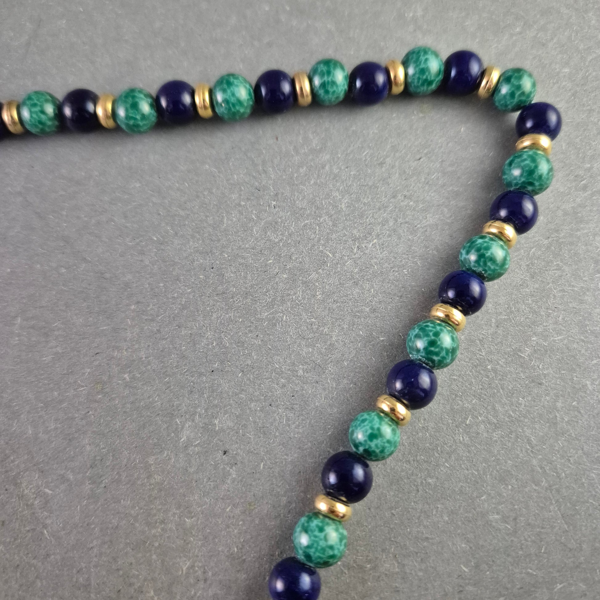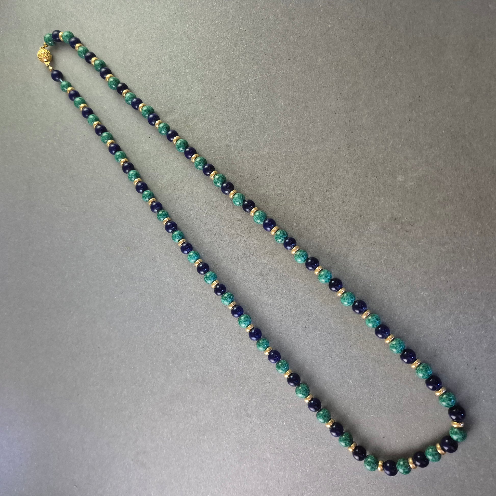Eine exquisite Halskette, die natürliche Schönheit mit elegantem Design vereint. Sie ist abwechselnd mit tiefblauen Lapislazuli-Perlen und grün gemusterten Malachit-Perlen aufgereiht, getrennt durch kleine goldfarbene Kugeln. Der aufwendig gearbeitete goldfarbene Verschluss rundet das Schmuckstück ab.