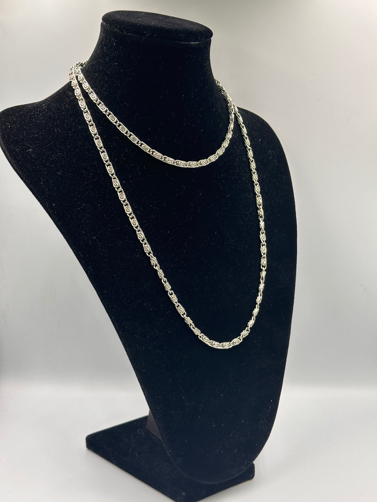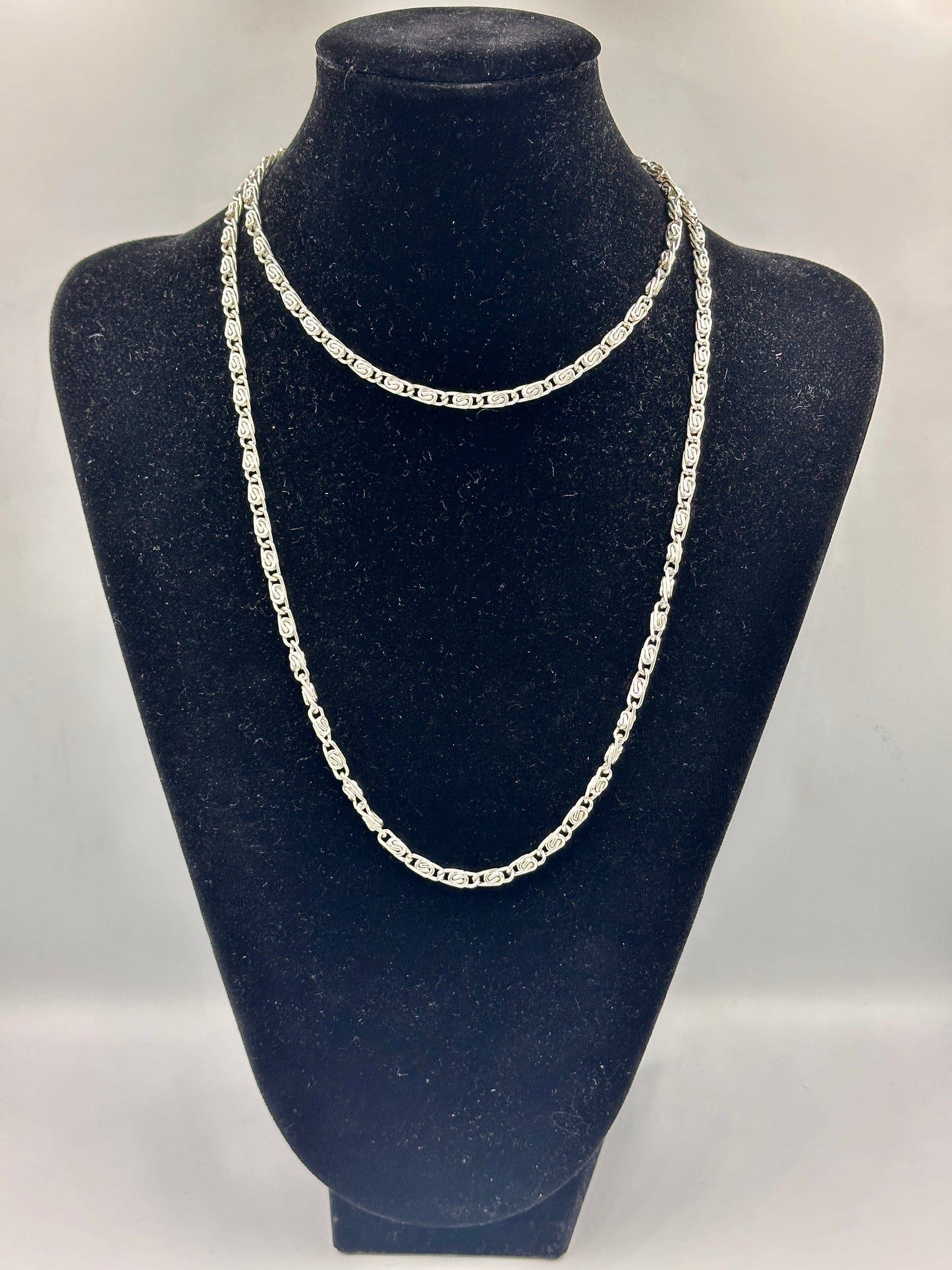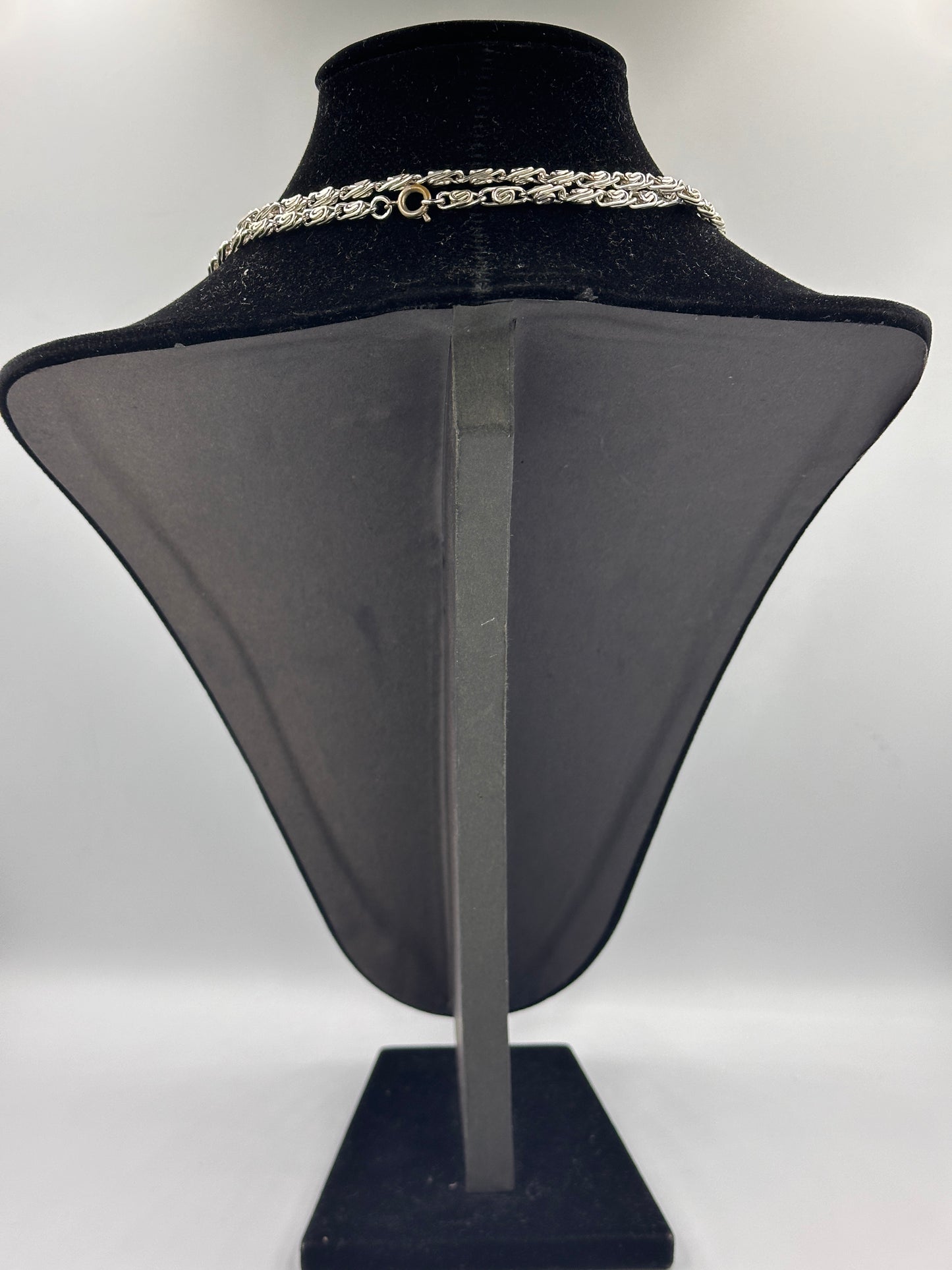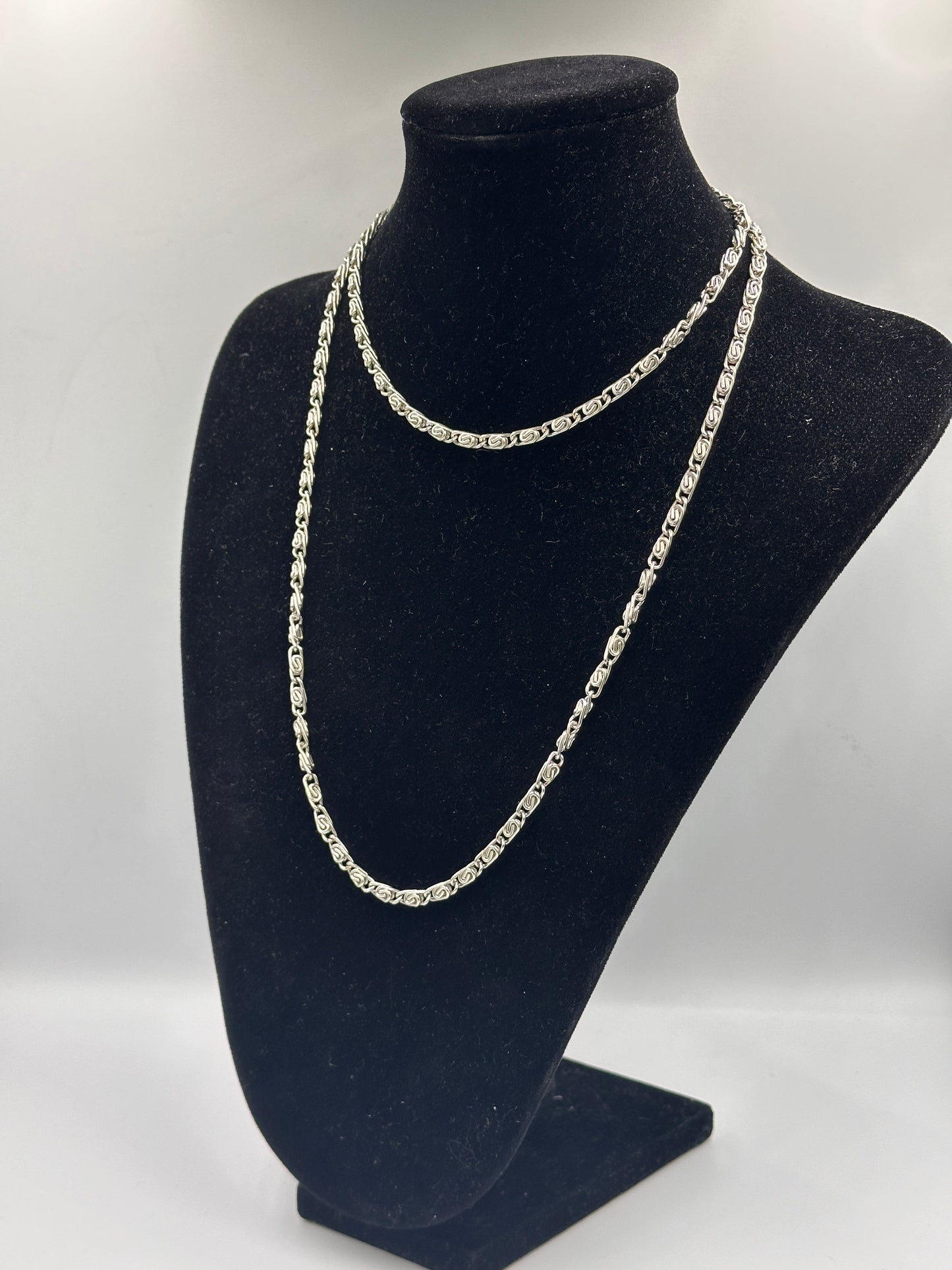 Diese elegante silberfarbene Halskette ist ein stilvolles Accessoire, das jedem Outfit eine besondere Note verleiht. Mit einer Länge von 90 cm ist sie perfekt für verschiedene Tragestile geeignet. Das Gewicht von 10,64 Gramm sorgt für ein angenehmes Tragegefühl. Trotz ihres gebrauchten Zustands befindet sich die Kette in gutem Zustand und ist bereit, Ihre Schmucksammlung zu ergänzen.