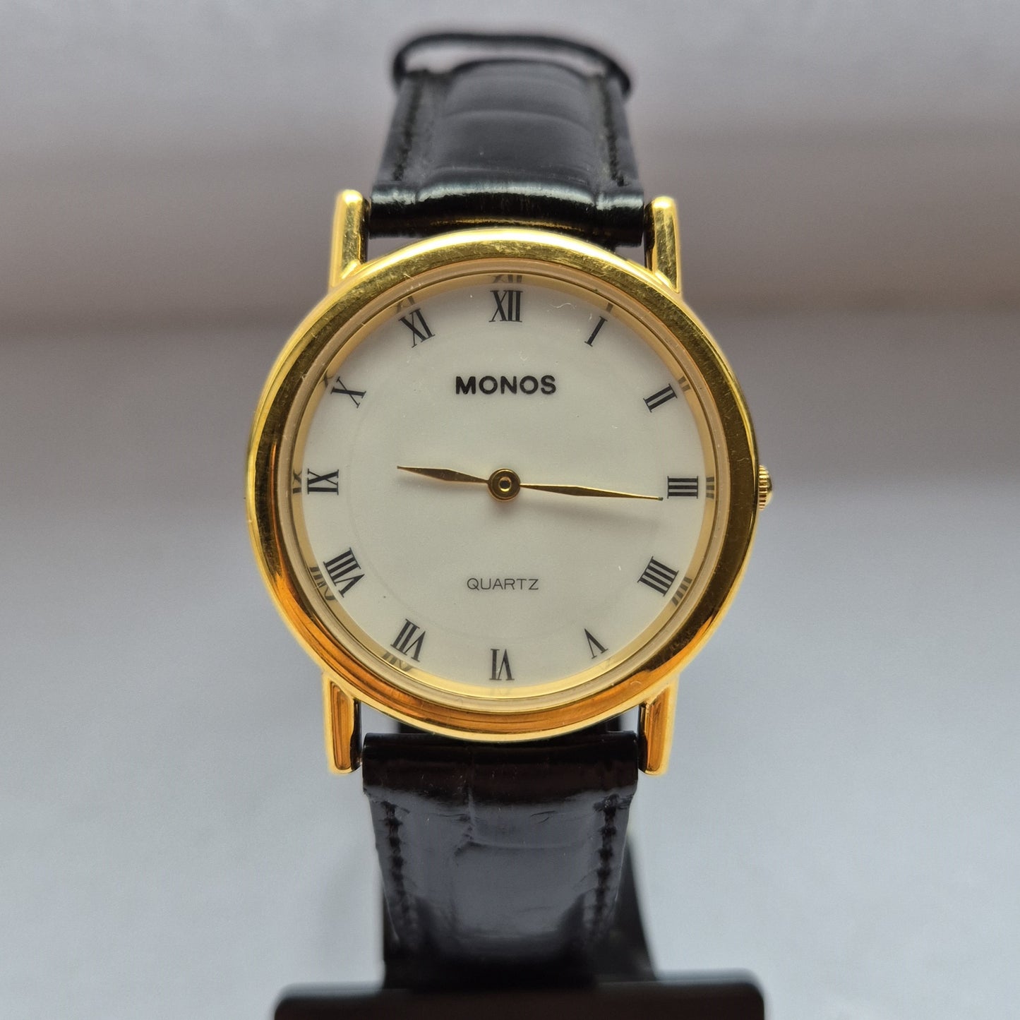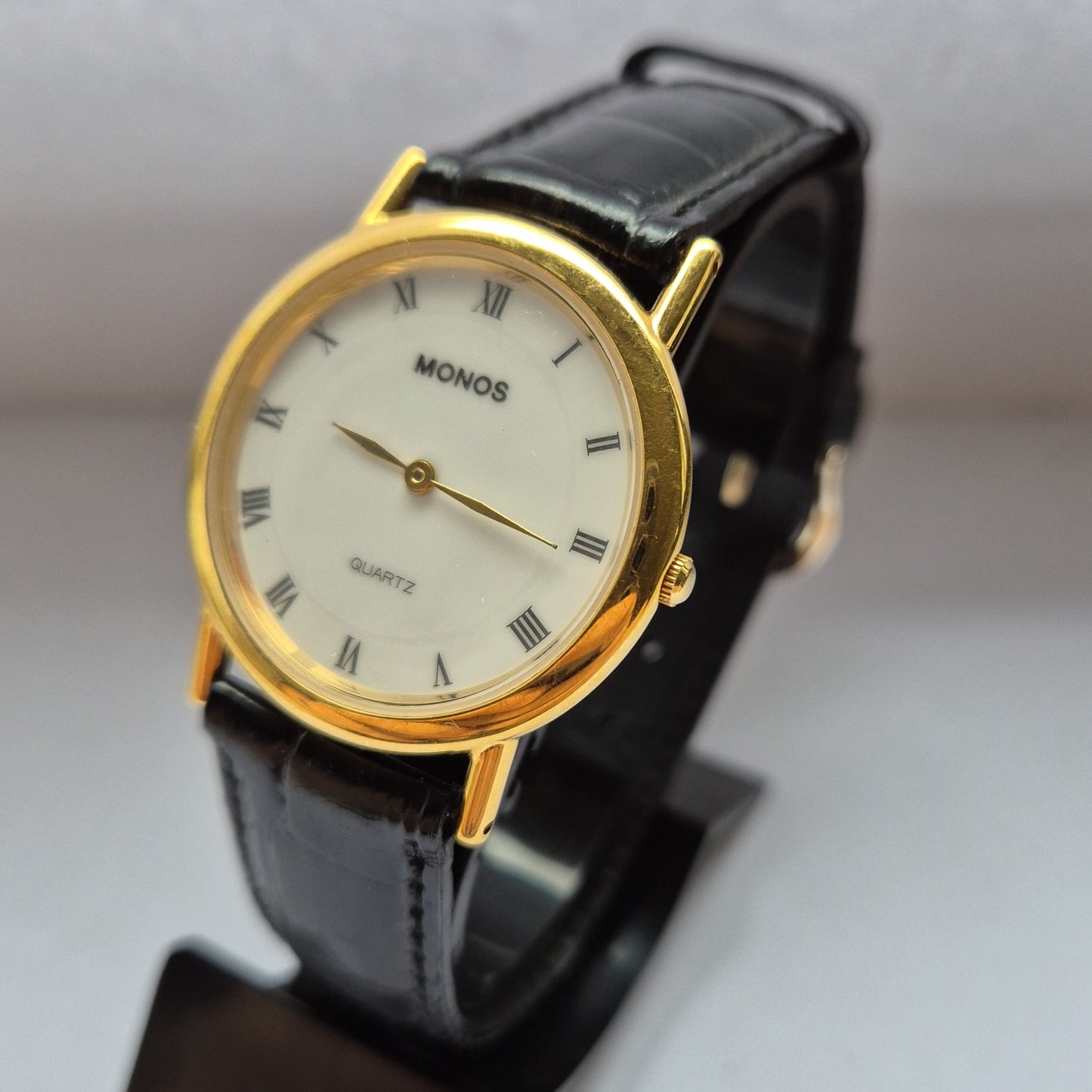 Diese Monos Damenarmbanduhr vereint klassische Eleganz mit zeitlosem Stil. Das weiße Zifferblatt ist mit römischen Ziffern versehen, die einen Hauch von Tradition verleihen. Das goldene Gehäuse ergänzt den edlen Look, während das schwarze Lederarmband für einen angenehmen Tragekomfort sorgt. Die Quarztechnologie garantiert eine zuverlässige Zeitmessung, ideal für jeden Anlass.