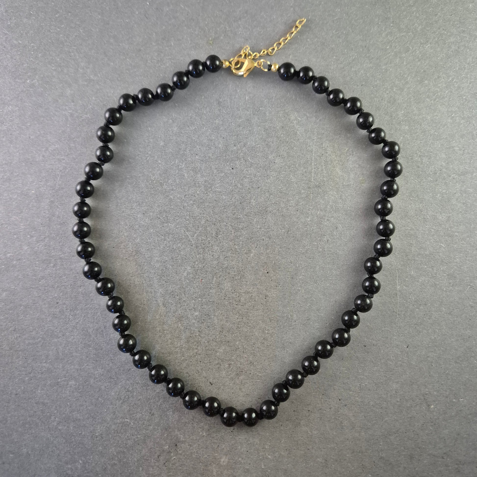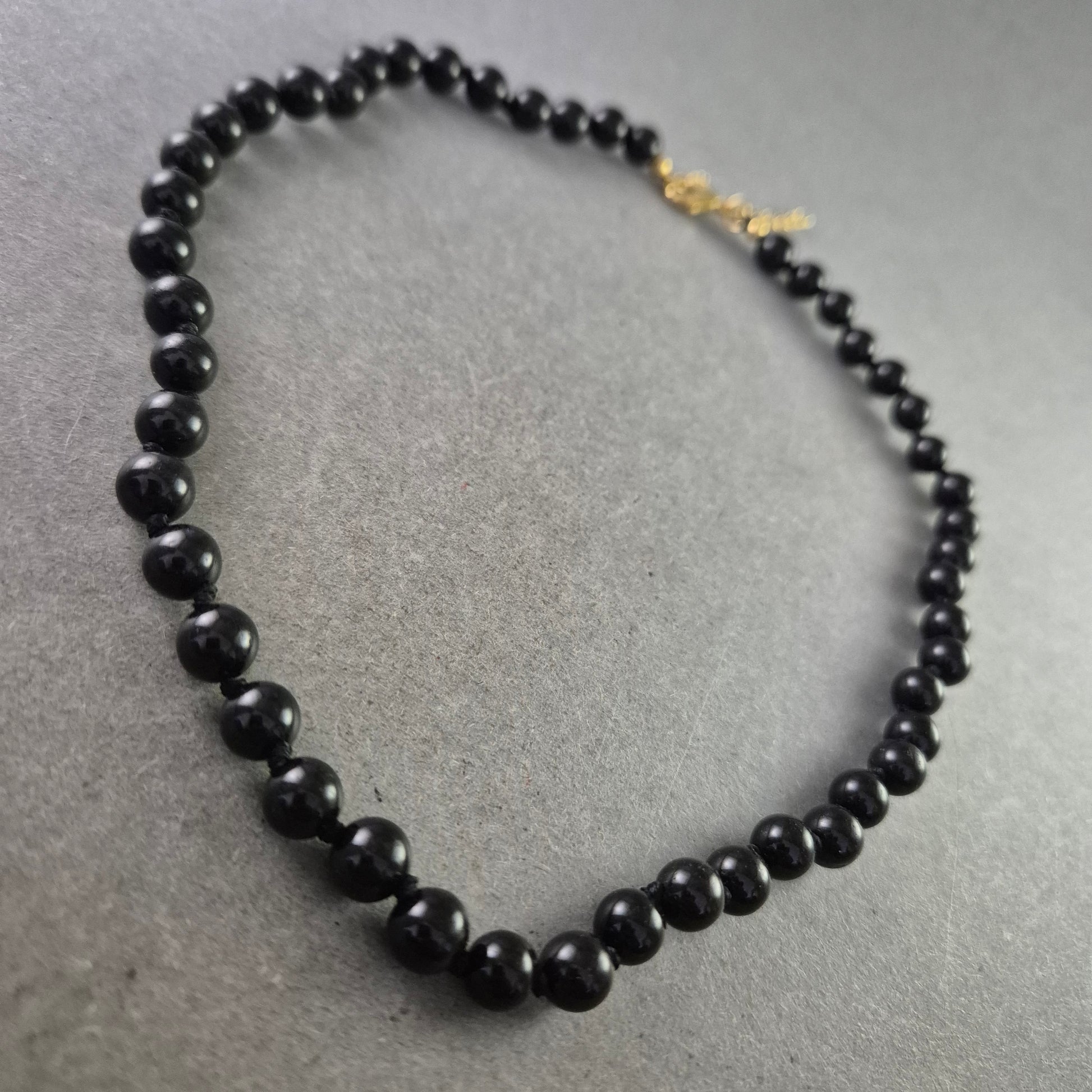 Eine schlichte und elegante Halskette, gefertigt aus glänzenden schwarzen Onyx-Perlen. Die gleichmäßige Größe und die polierte Oberfläche der Perlen verleihen diesem Schmuckstück einen klassischen und raffinierten Look.