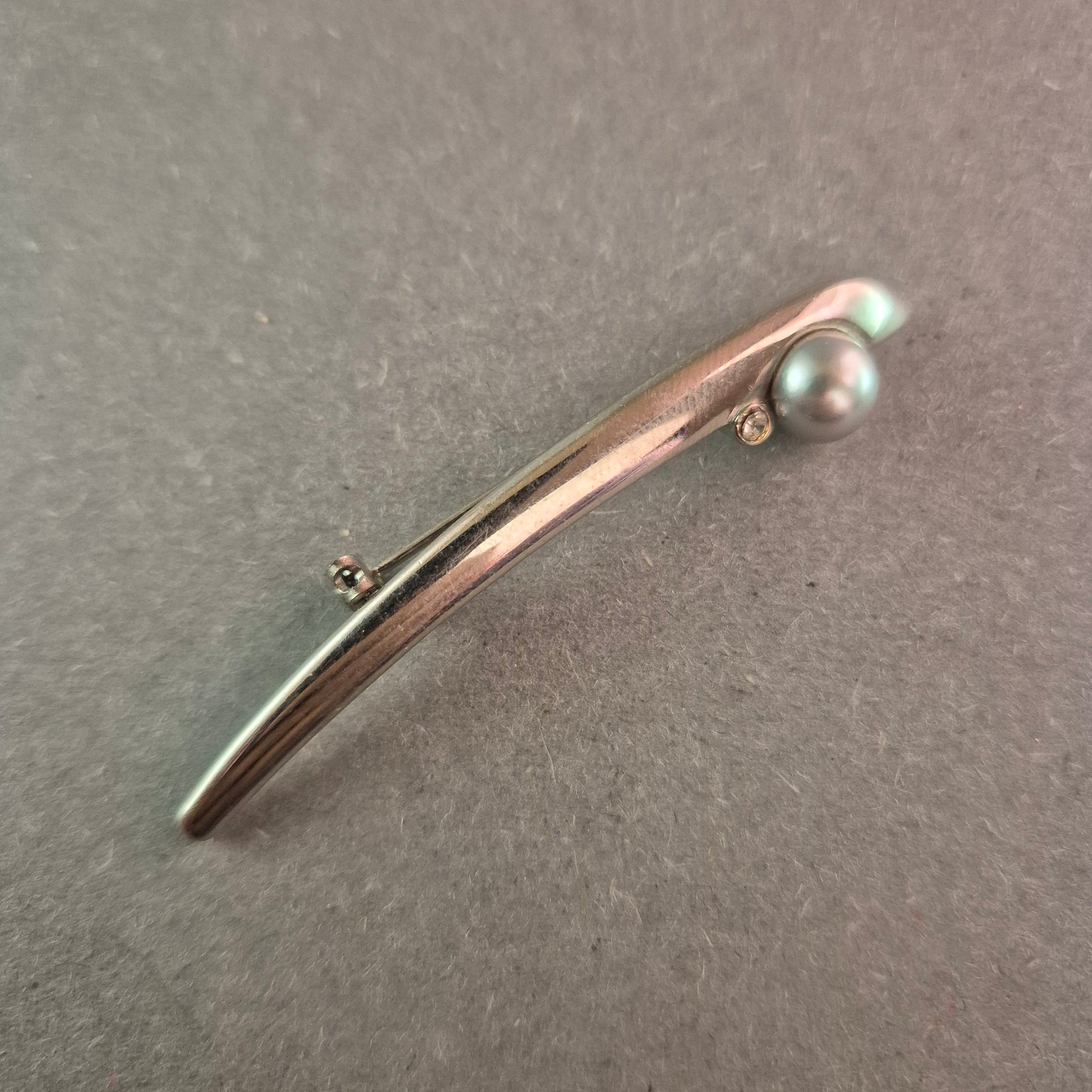 Diese filigrane Brosche aus Silber besticht durch ihr minimalistisches, geschwungenes Design. Die dezente graue Perle und der kleine eingefasste Stein verleihen dem Schmuckstück eine edle Note. Ideal für Liebhaber klassischer Eleganz und perfekt als stilvolles Accessoire für Blusen, Schals oder Jacken.