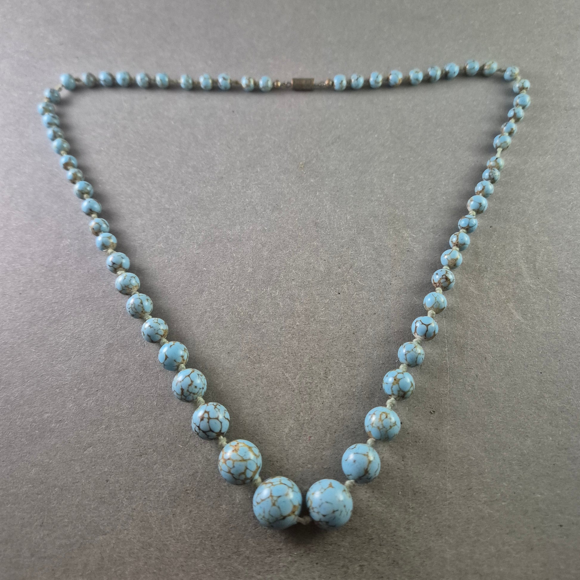 Diese Türkis Halskette überzeugt mit ihrer lebendigen Farbe und den natürlich gemaserten Kugelperlen in einem klassischen Verlauf. Die größeren Kugeln in der Mitte ziehen die Blicke auf sich, während die kleineren Kugeln den Nacken elegant umschmeicheln. Die gleichmäßige Struktur und das authentische Design machen dieses Stück zu einem stilvollen Accessoire für viele Gelegenheiten.