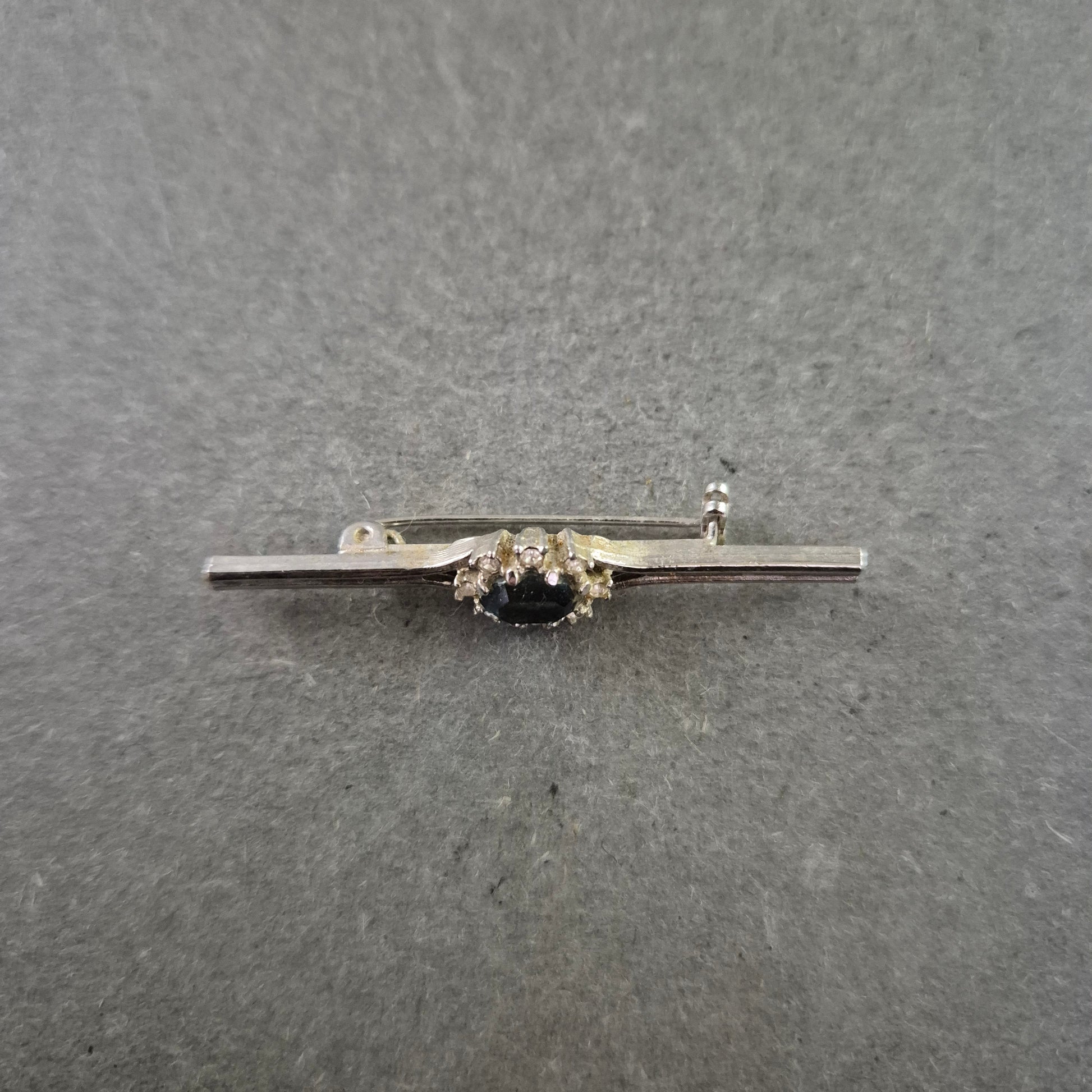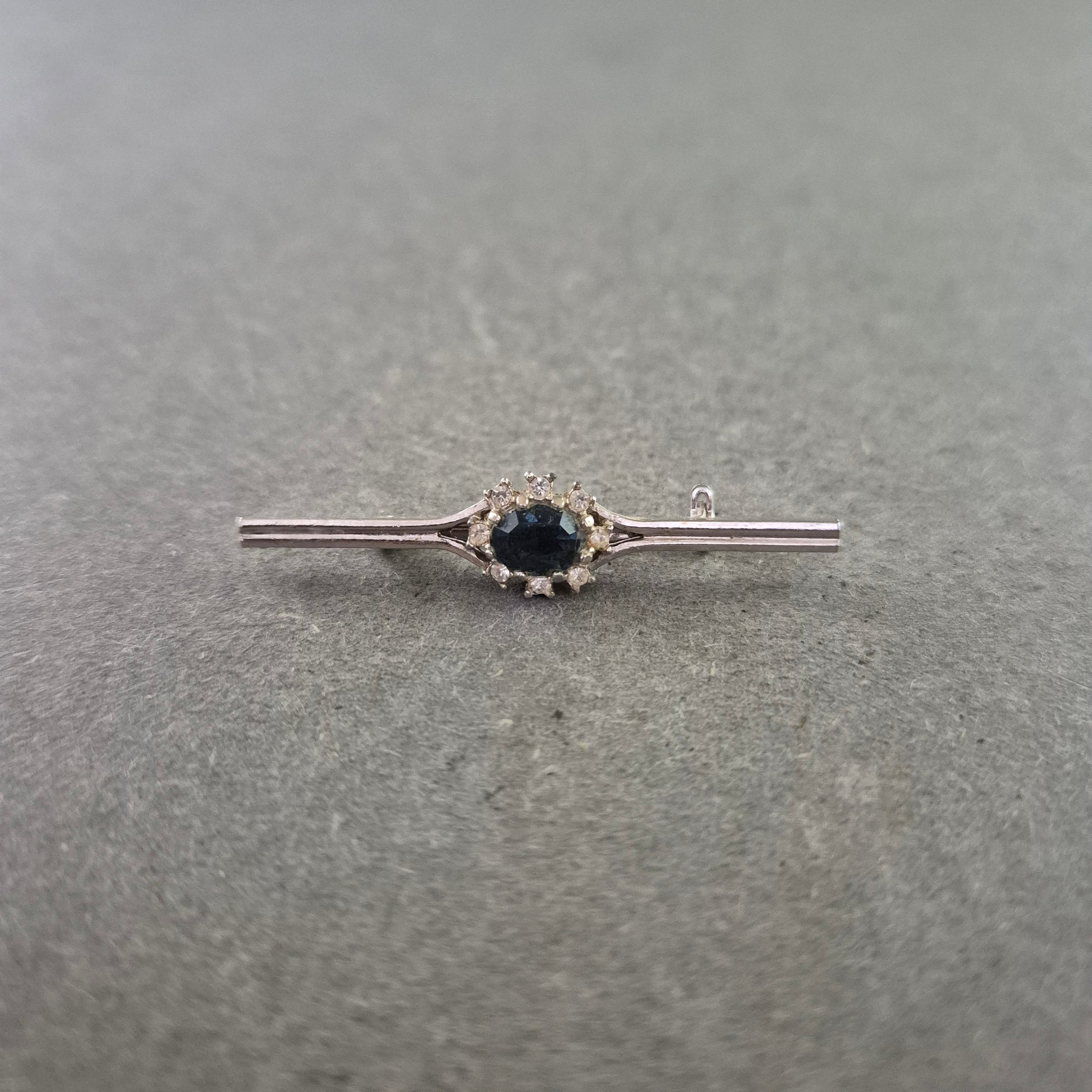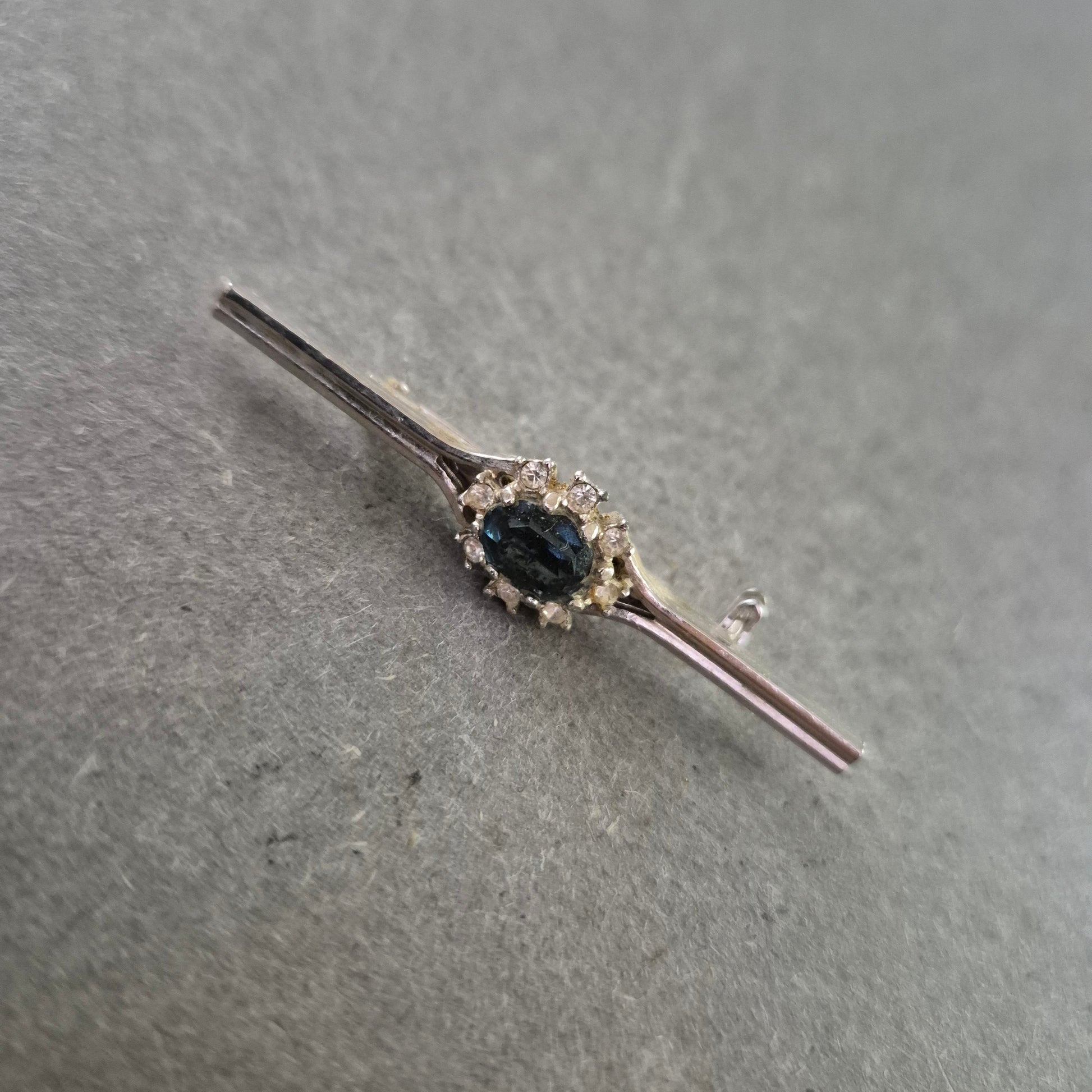 Diese elegante Vintage Brosche im Bar-Design ist ein raffiniertes Accessoire. Gefertigt aus glänzend silberfarbenem Metall, besticht sie durch einen zentralen ovalen Stein in tiefem Blau oder Schwarz, der von kleineren funkelnden Steinen umrahmt wird. Die schlichte, langgezogene Form macht sie zu einem vielseitigen Stück, das jedem Outfit eine edle Vintage-Note verleiht.