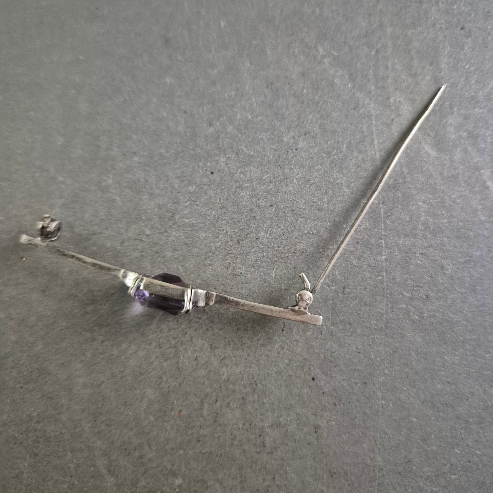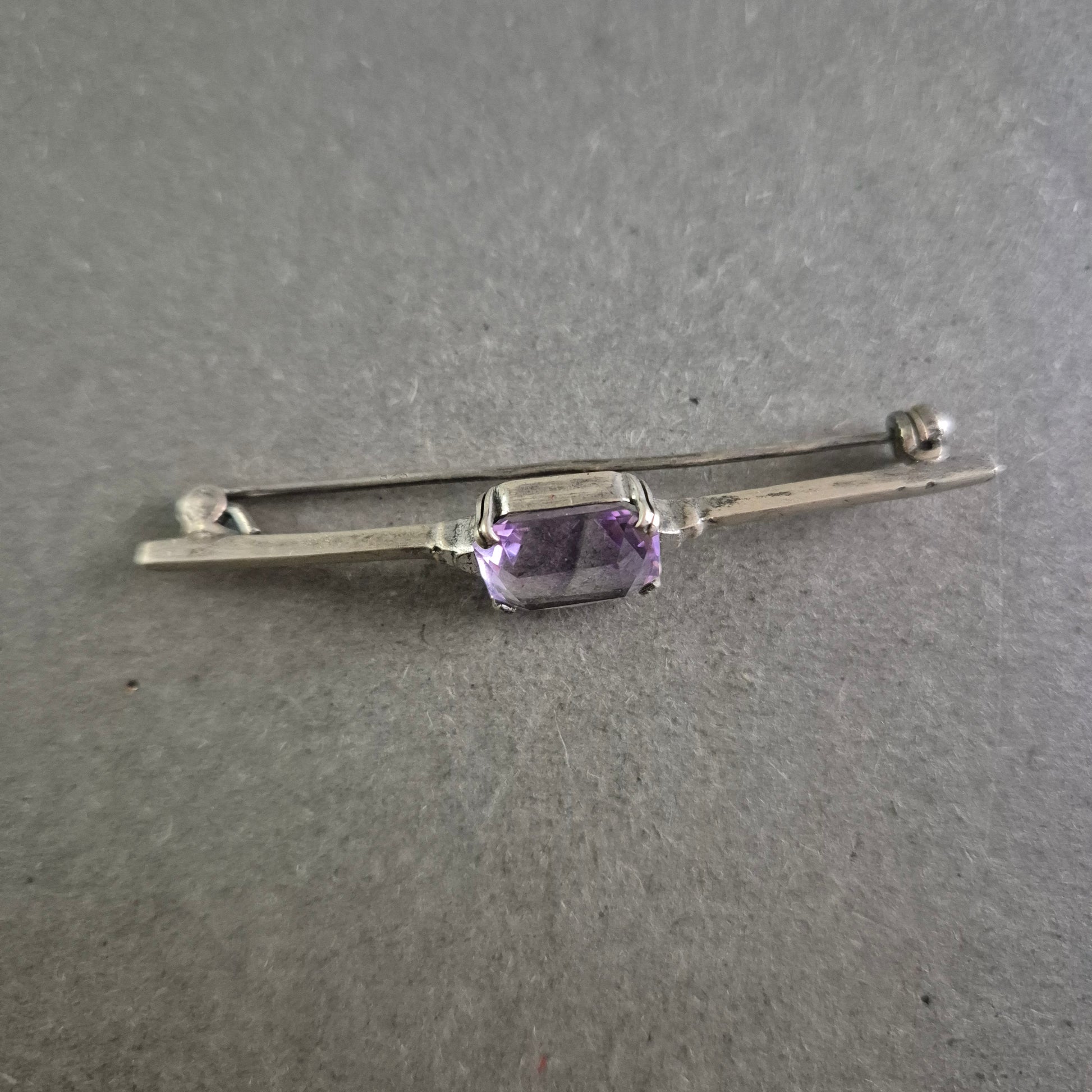 Diese feine Vintage-Brosche überzeugt durch ihre klare Form und einen rechteckig facettierten Amethyst in zartem Violett. Der lilafarbene Stein ist mittig in einer schlanken, silberfarbenen Broschenspange eingefasst und sorgt für einen dezenten, aber edlen Blickfang. Ideal für klassische Outfits oder Sammlungen stilvoller Accessoires.