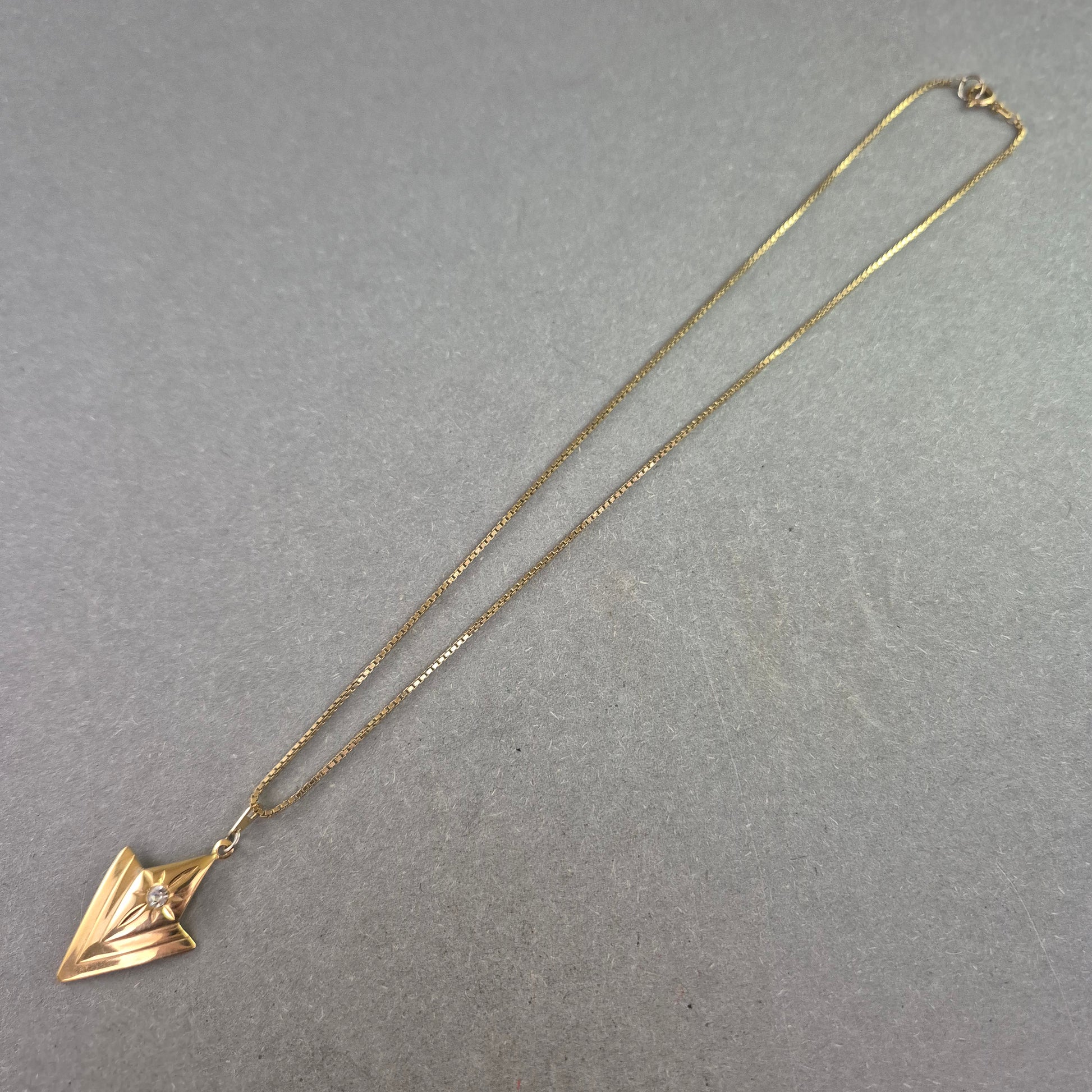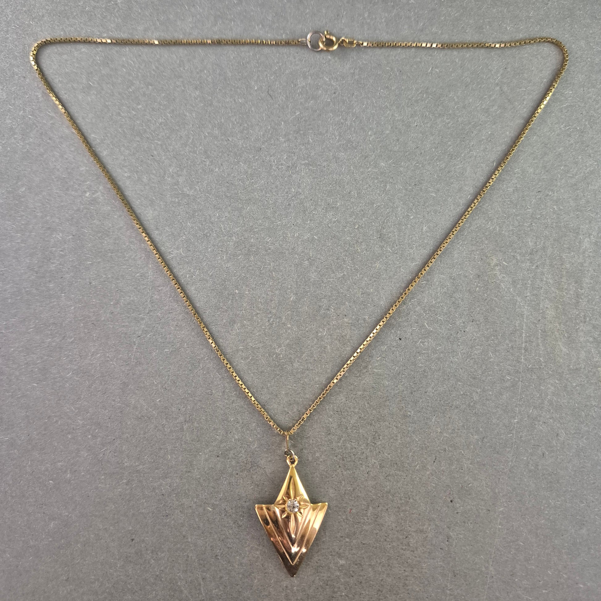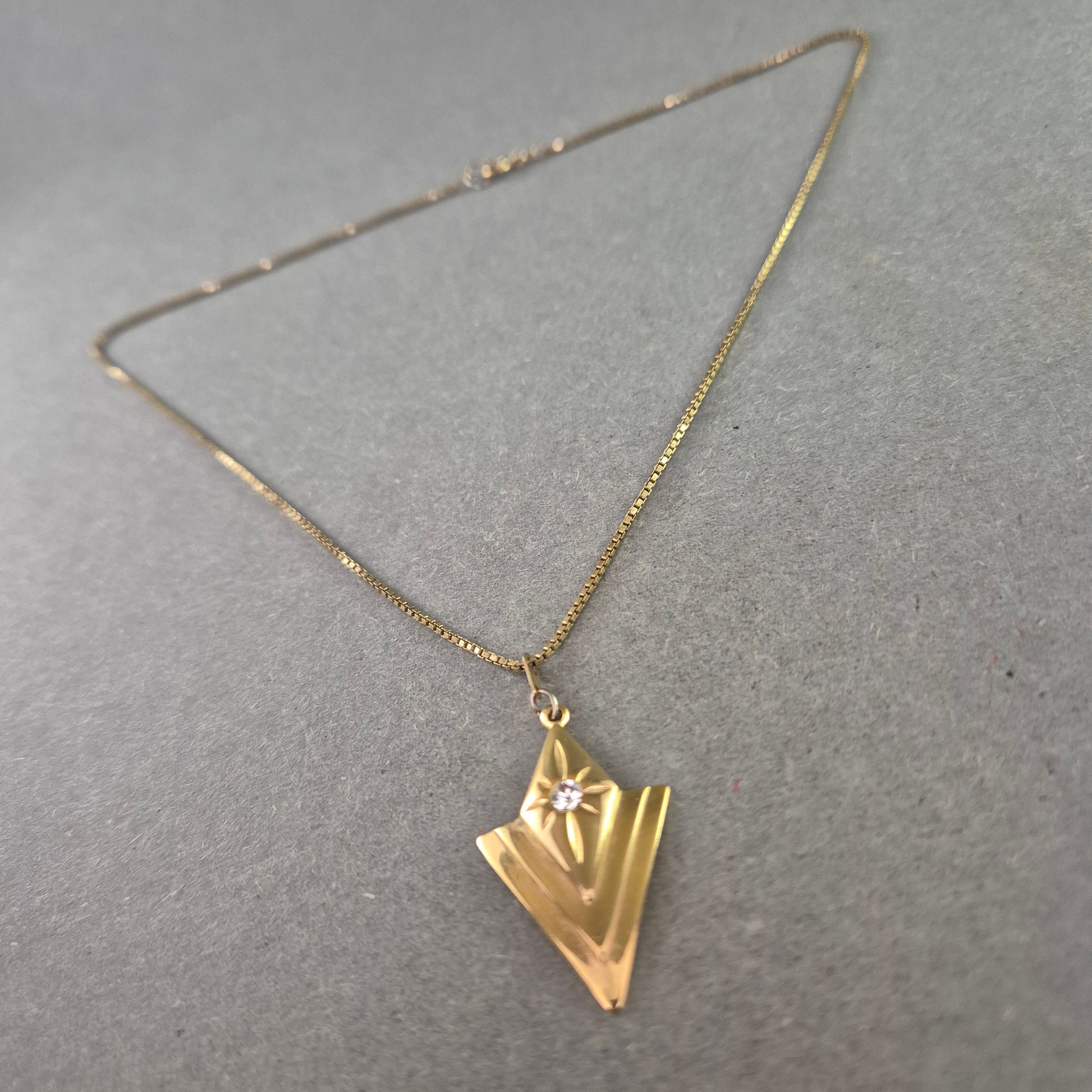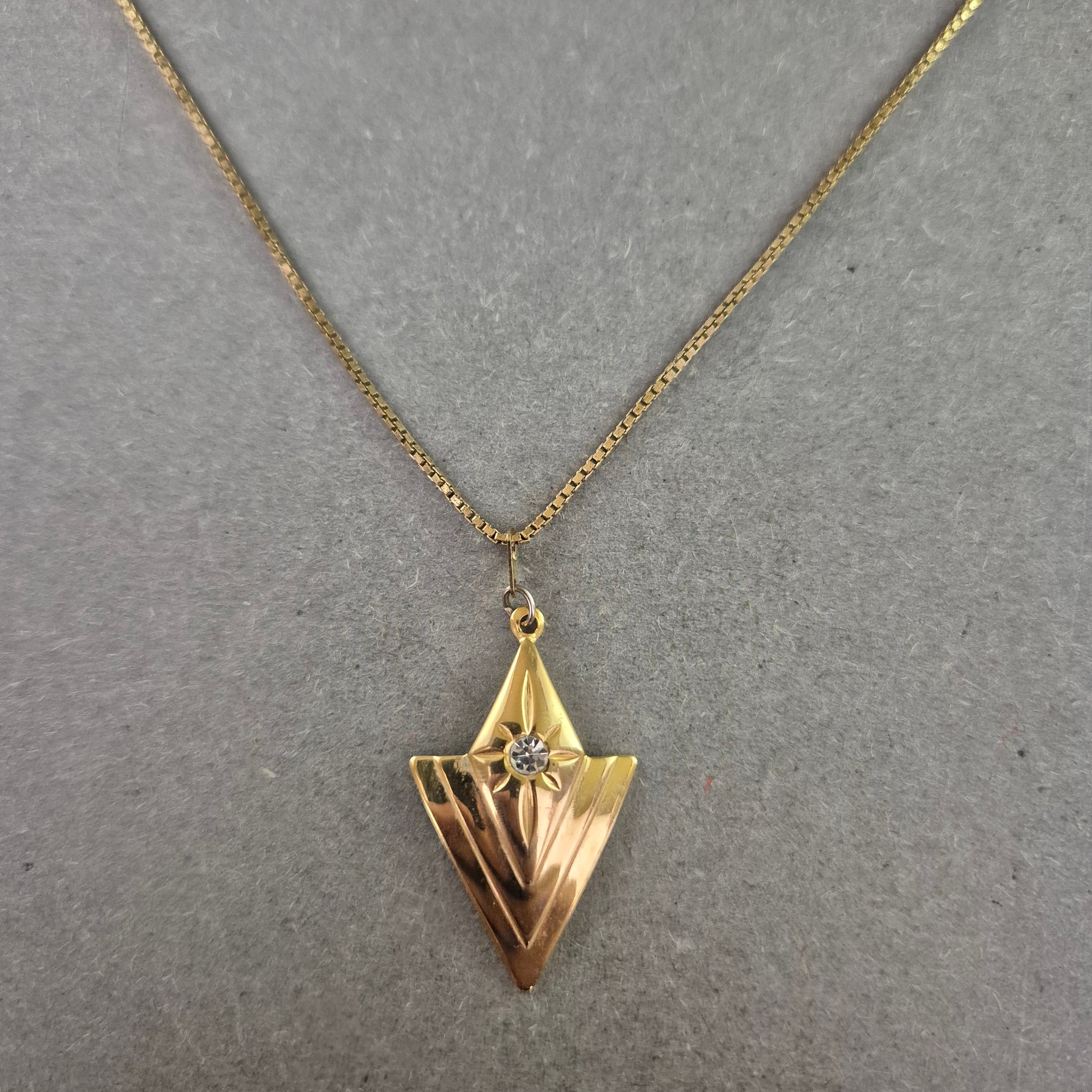 Diese Vintage-Halskette kombiniert klassisches Goldfinish mit modernem geometrischen Stil. Der außergewöhnliche Anhänger in V-Form wird durch einen kleinen funkelnden Zierstein in der Mitte veredelt, was dem Schmuckstück eine stilvolle und gleichzeitig elegante Ausstrahlung verleiht. Die zarte, fein gearbeitete Gliederkette rundet das Design harmonisch ab – ideal für besondere Anlässe oder als edles Alltagsaccessoire.