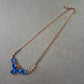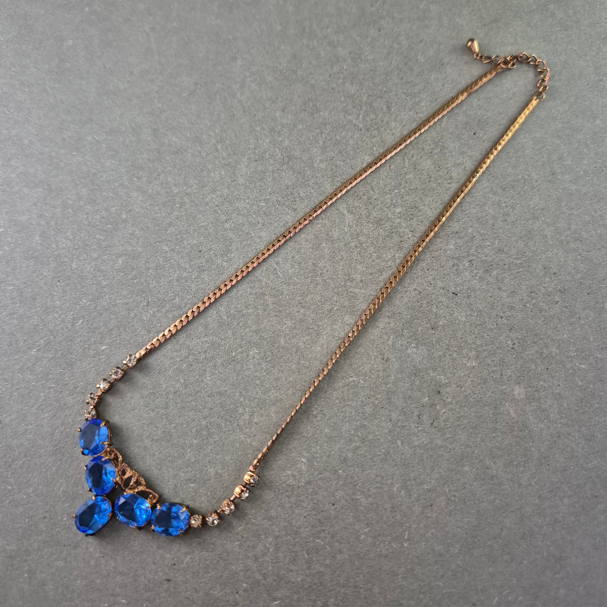 Diese auffällige Vintage Halskette besticht durch ihre harmonische Kombination aus goldfarbenem Metall und fünf tiefblauen Strasssteinen, die in einer V-Form arrangiert sind. Kleine klare Steinchen entlang des mittleren Kettenabschnitts verleihen dem Schmuckstück zusätzlichen Glanz. Perfekt für besondere Anlässe oder als Eyecatcher im Alltag.