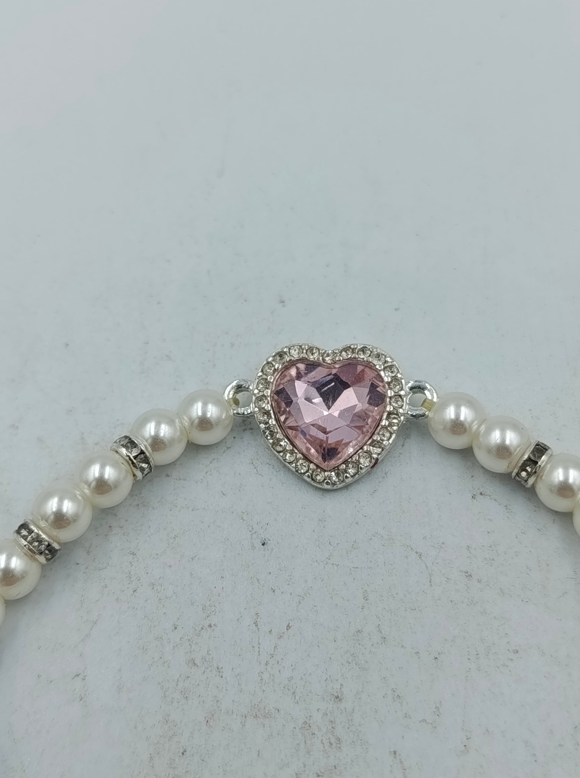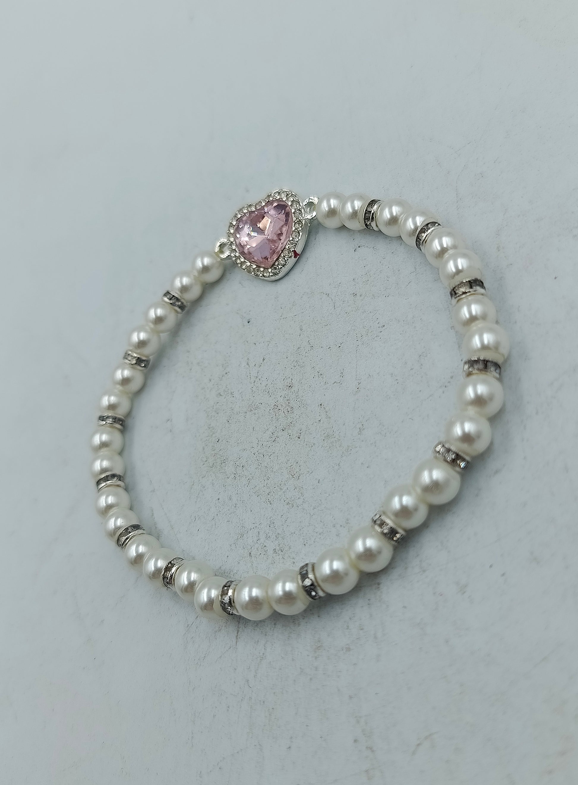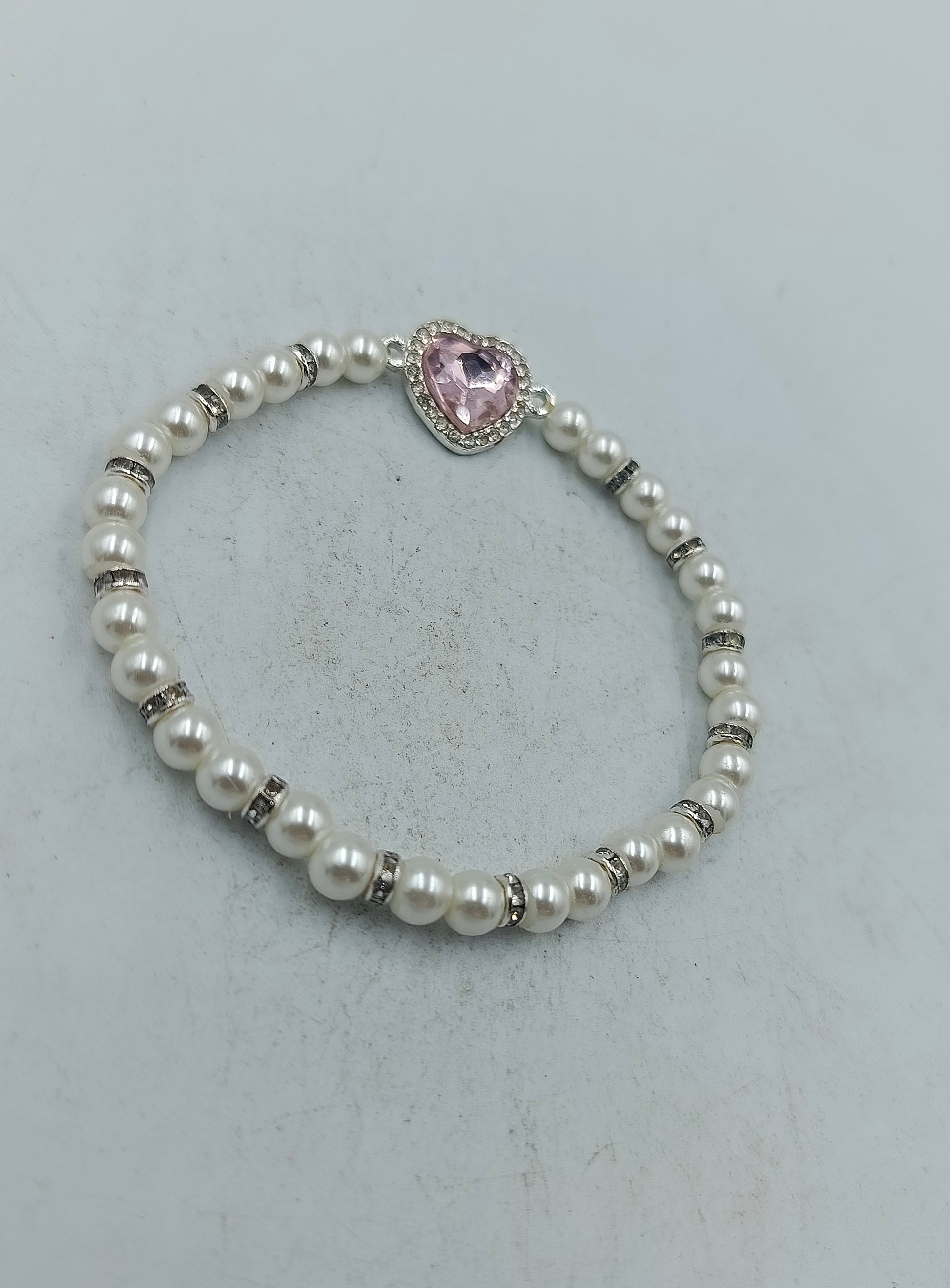Dieses stilvolle Armband besteht aus klassischen weißen Perlen und wird durch feine silberfarbene Abstandselemente akzentuiert. Blickfang ist das zarte Herz-Zierelement mit rosafarbenem Stein und funkelnder Umrandung, das dem Schmuckstück eine romantische Note verleiht. Dank der elastischen Verarbeitung lässt sich das Armband bequem an- und ausziehen und passt sich angenehm dem Handgelenk an.