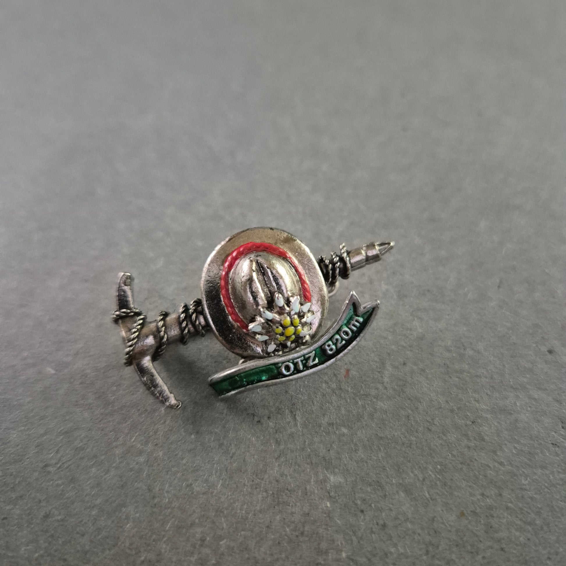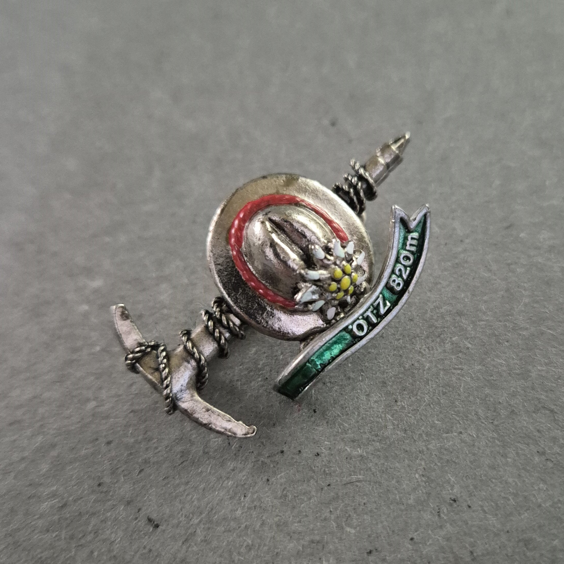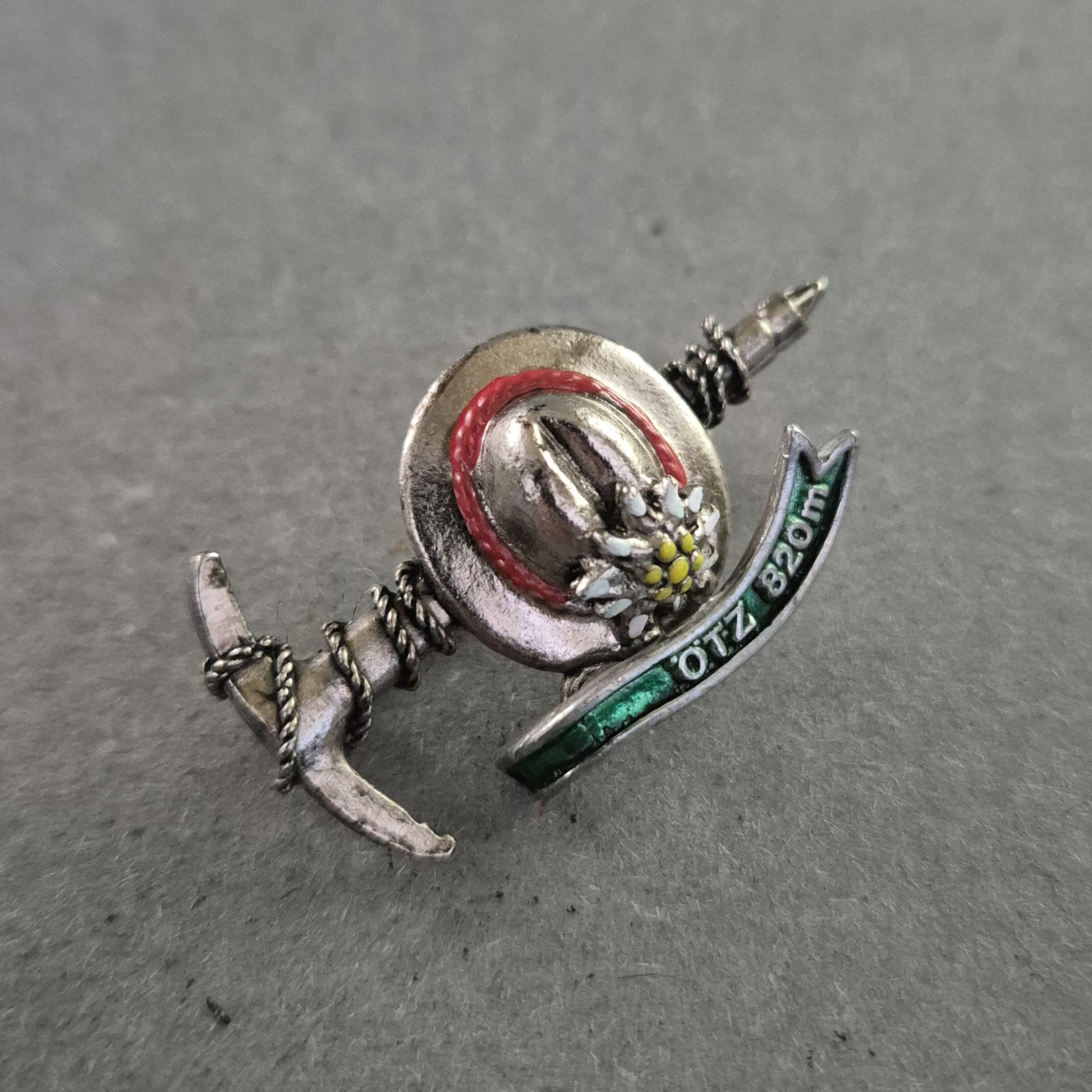 Diese liebevoll gestaltete Alpen-Brosche zeigt ein traditionelles Tiroler Hütchen mit roter Kordel, Edelweiß und Eispickel – ein Symbol für Bergfreunde. Der Schriftzug „Ötz 820 m“ erinnert an den malerischen Ort in Tirol. Die feine Emaillearbeit und das rustikale Design machen diese Brosche zu einem beliebten Souvenir oder Accessoire für Tracht und Wanderausrüstung.