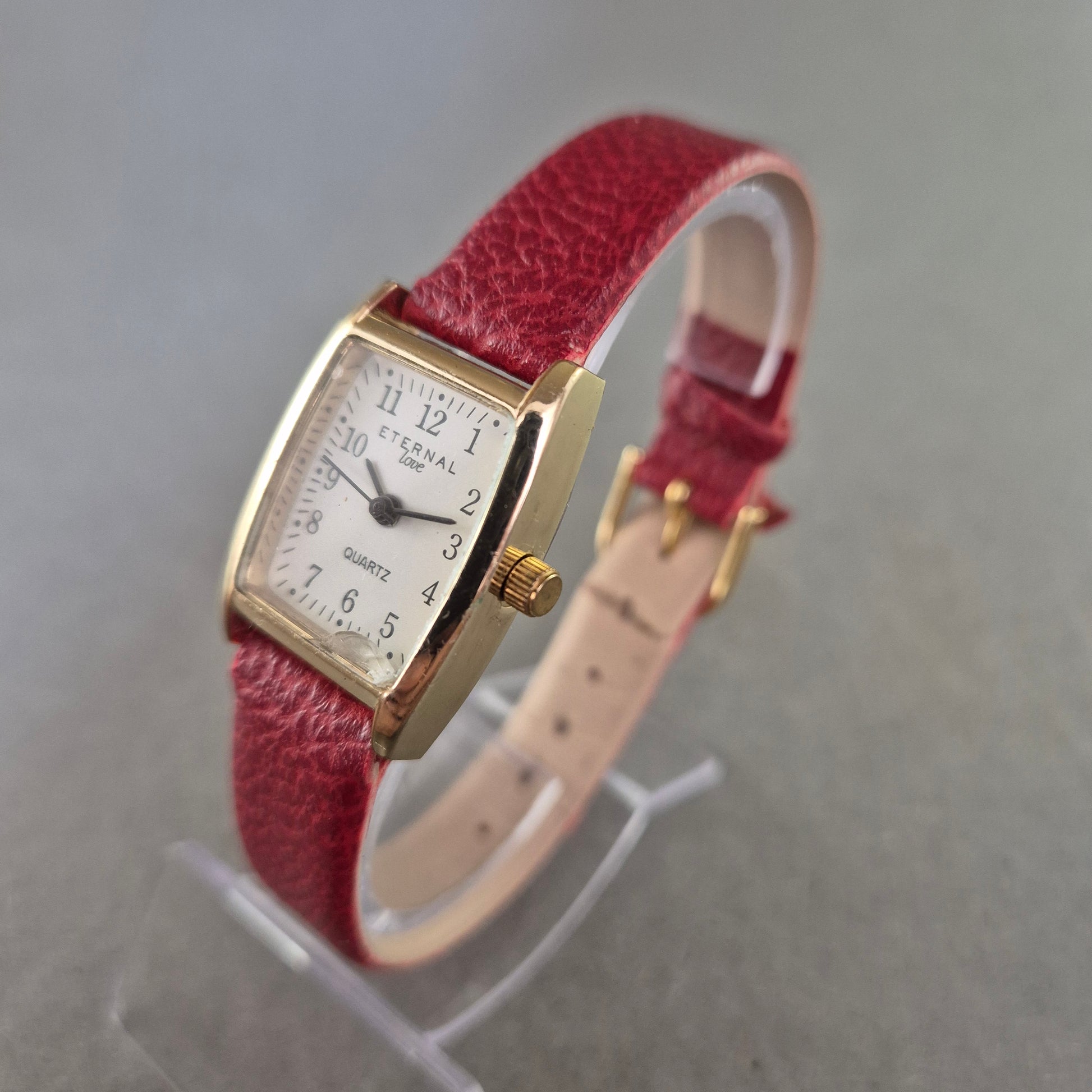 Diese Damenarmbanduhr der Marke Eternal Love überzeugt durch ihr charmantes, klassisch-elegantes Design. Das rechteckige Gehäuse in Goldoptik harmoniert perfekt mit dem leuchtend roten Lederarmband, das durch seine strukturierte Oberfläche einen hochwertigen Eindruck vermittelt. Das weiße Zifferblatt mit gut lesbaren schwarzen Zahlen unterstreicht den zeitlosen Stil dieser Quarzuhr – ideal für den Alltag oder besondere Anlässe.