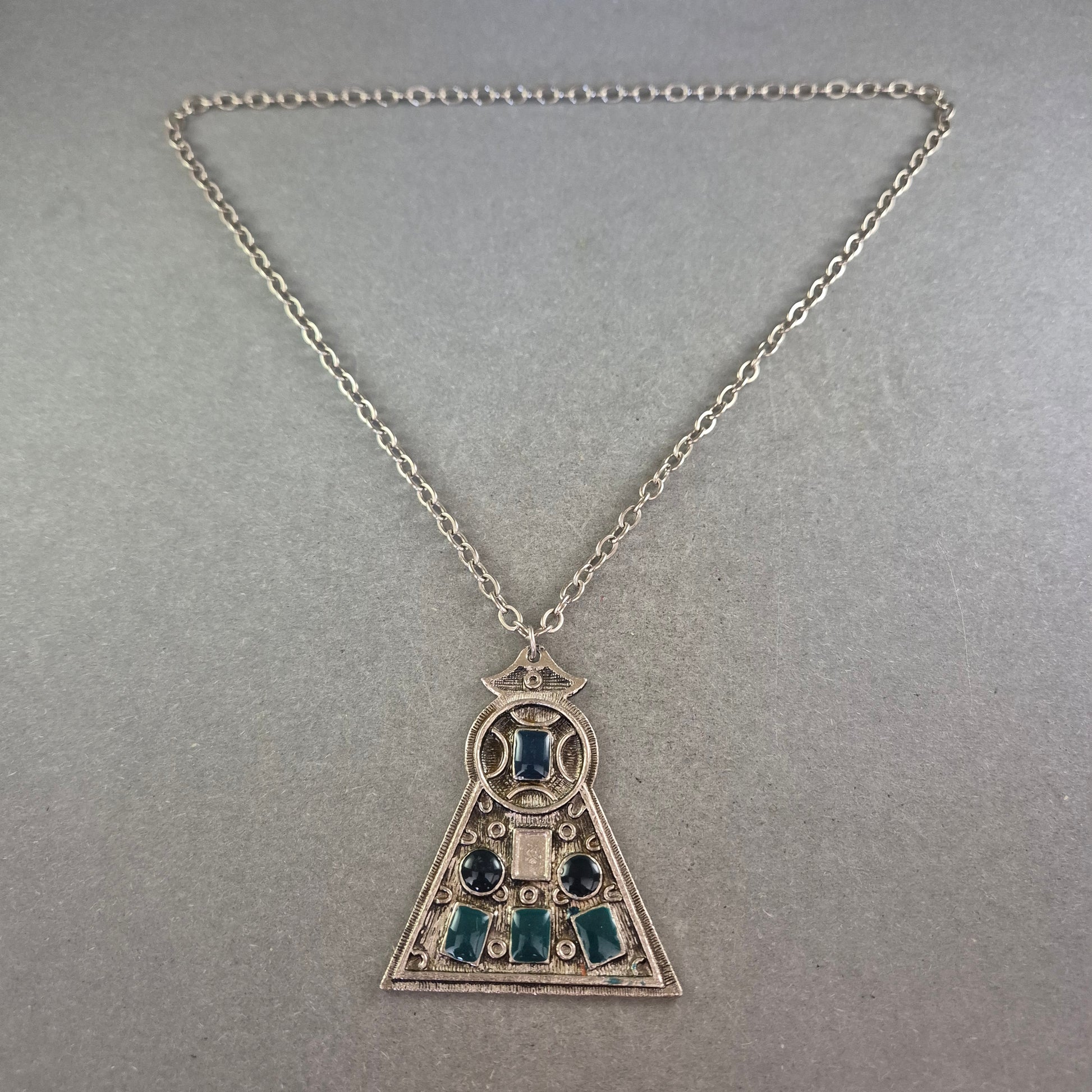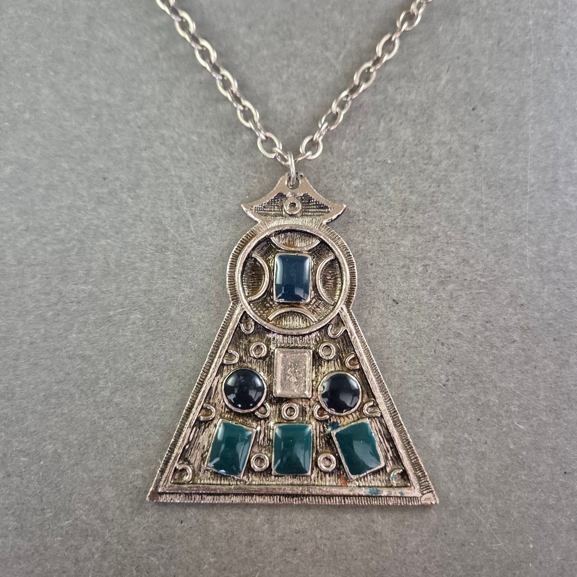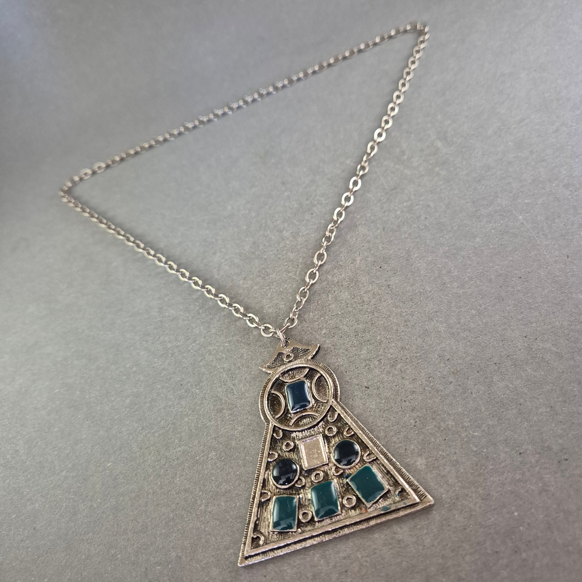 Diese ausgefallene Halskette im Ethno-Stil überzeugt mit einem großen, kunstvoll verzierten Anhänger in Silberoptik und geometrischer Form. Eingefasste Steine in Blau- und Grüntönen setzen farbliche Highlights und verleihen dem Schmuckstück einen antiken Touch. Die grobe Gliederkette ergänzt das Gesamtbild perfekt – ideal für besondere Looks mit Charakter.