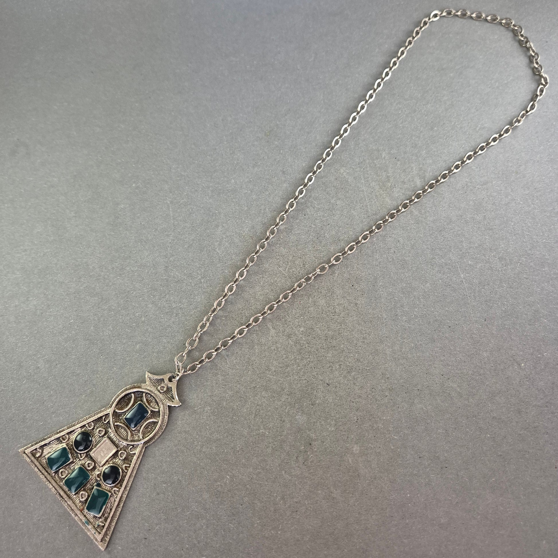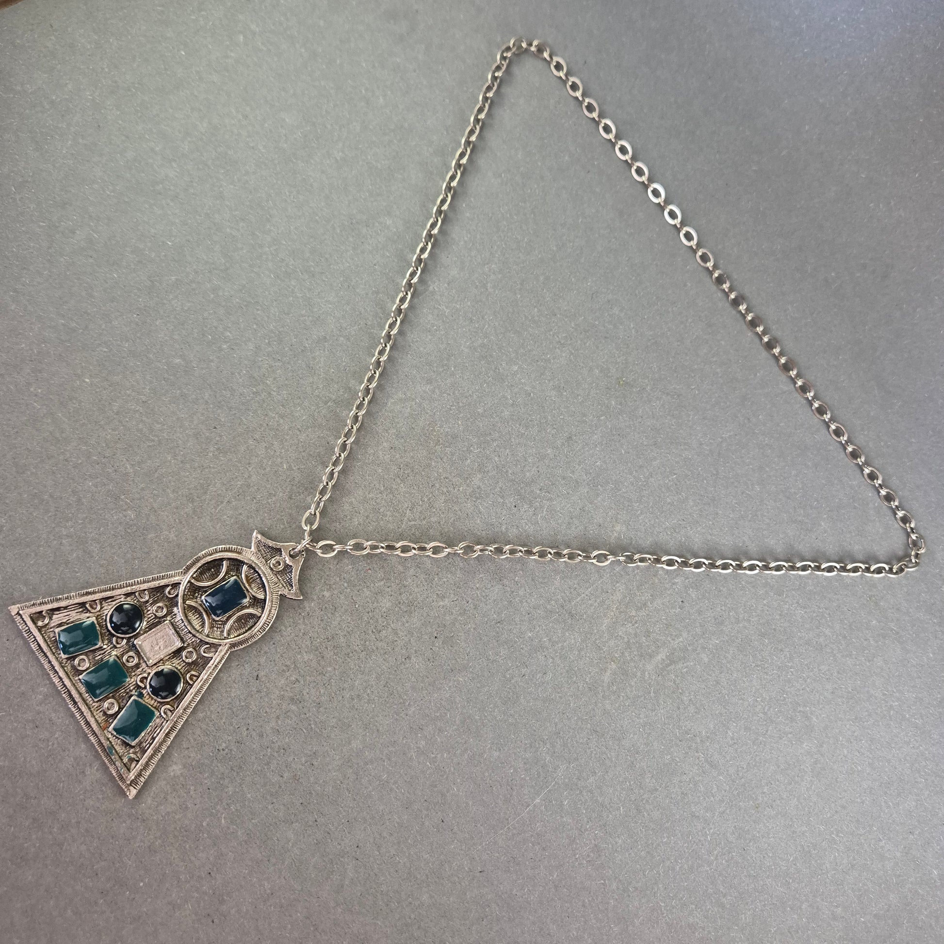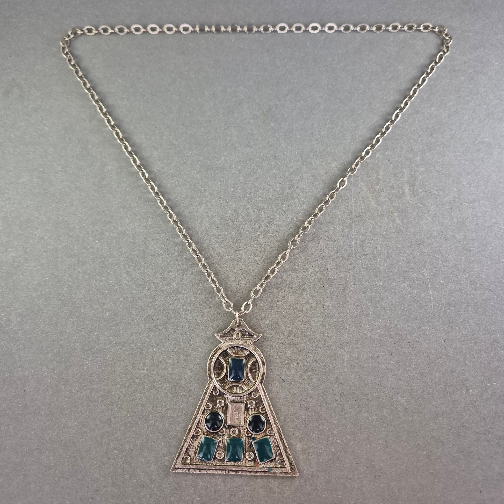 Diese ausgefallene Halskette im Ethno-Stil überzeugt mit einem großen, kunstvoll verzierten Anhänger in Silberoptik und geometrischer Form. Eingefasste Steine in Blau- und Grüntönen setzen farbliche Highlights und verleihen dem Schmuckstück einen antiken Touch. Die grobe Gliederkette ergänzt das Gesamtbild perfekt – ideal für besondere Looks mit Charakter.