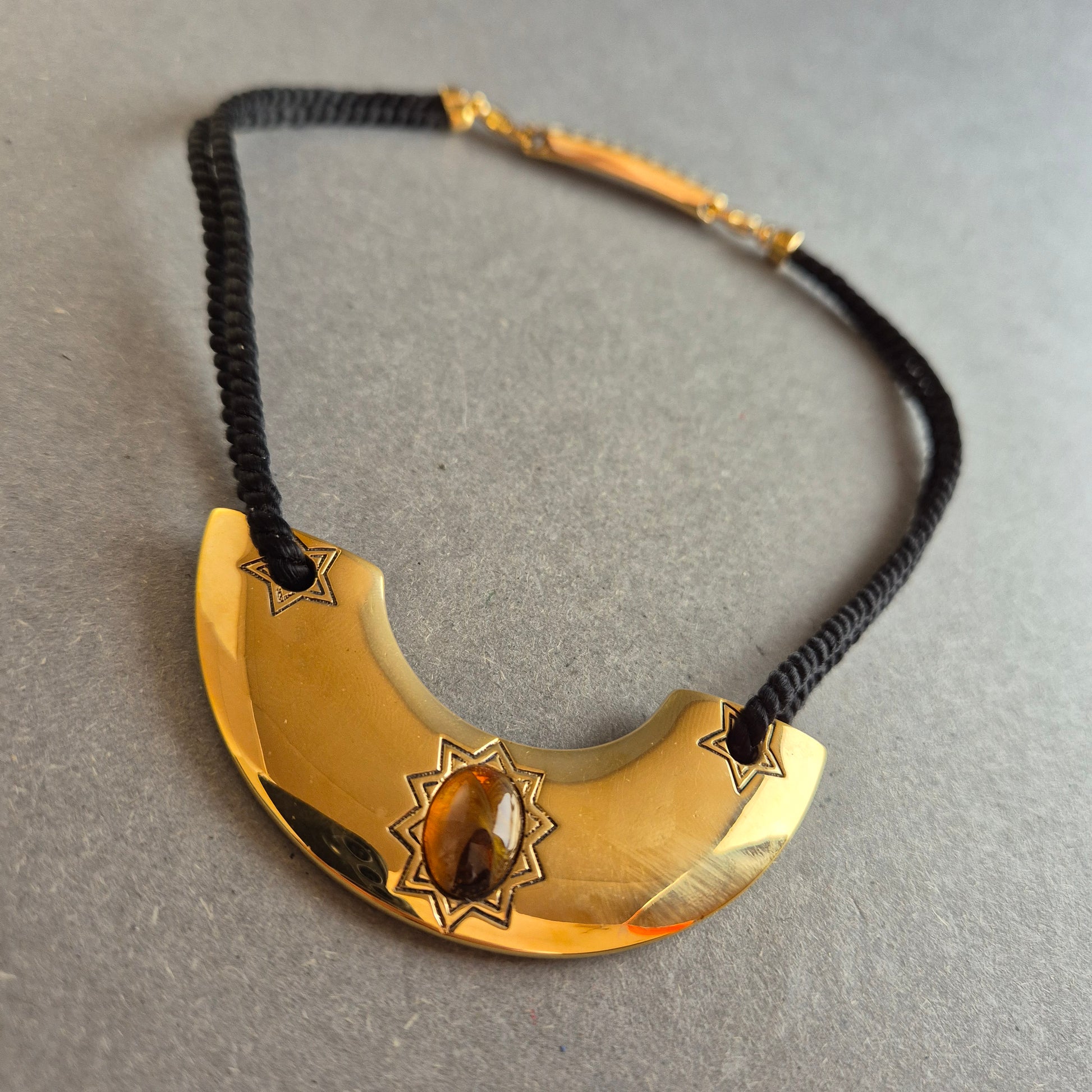 Diese auffällige Halskette vereint Ethno-Vibes mit modernem Chic. Der halbrunde, goldfarbene Anhänger ist mit einem zentralen, bernsteinfarbenen Zierelement sowie feinen Gravuren im Stern- und Zickzackmuster verziert. Zwei geflochtene, schwarze Textilbänder sorgen für angenehmen Tragekomfort und verleihen dem Schmuckstück eine interessante Materialkombination. Ideal für Boho-Looks, Festival-Outfits oder als markantes Highlight zu schlichten Styles.