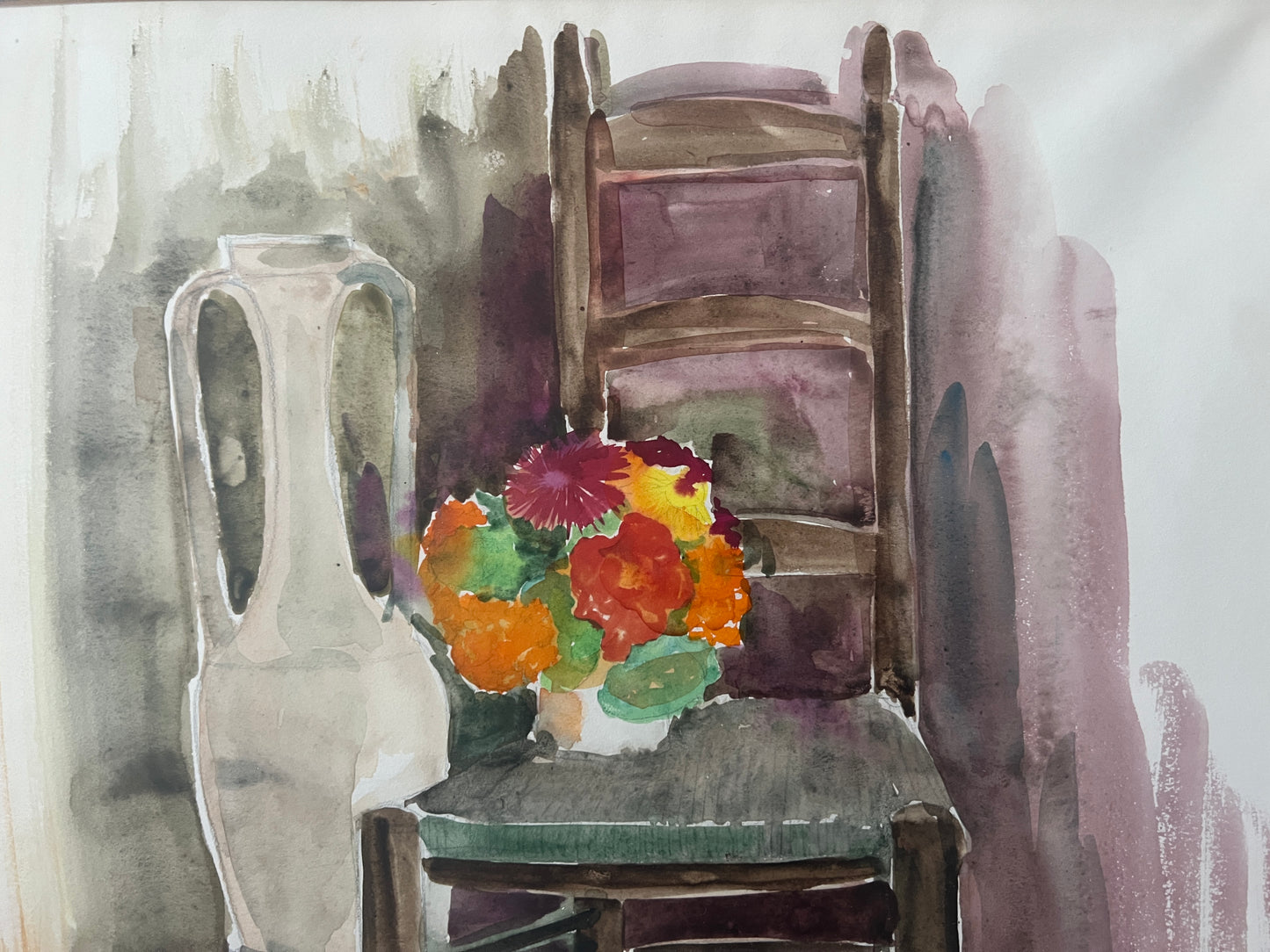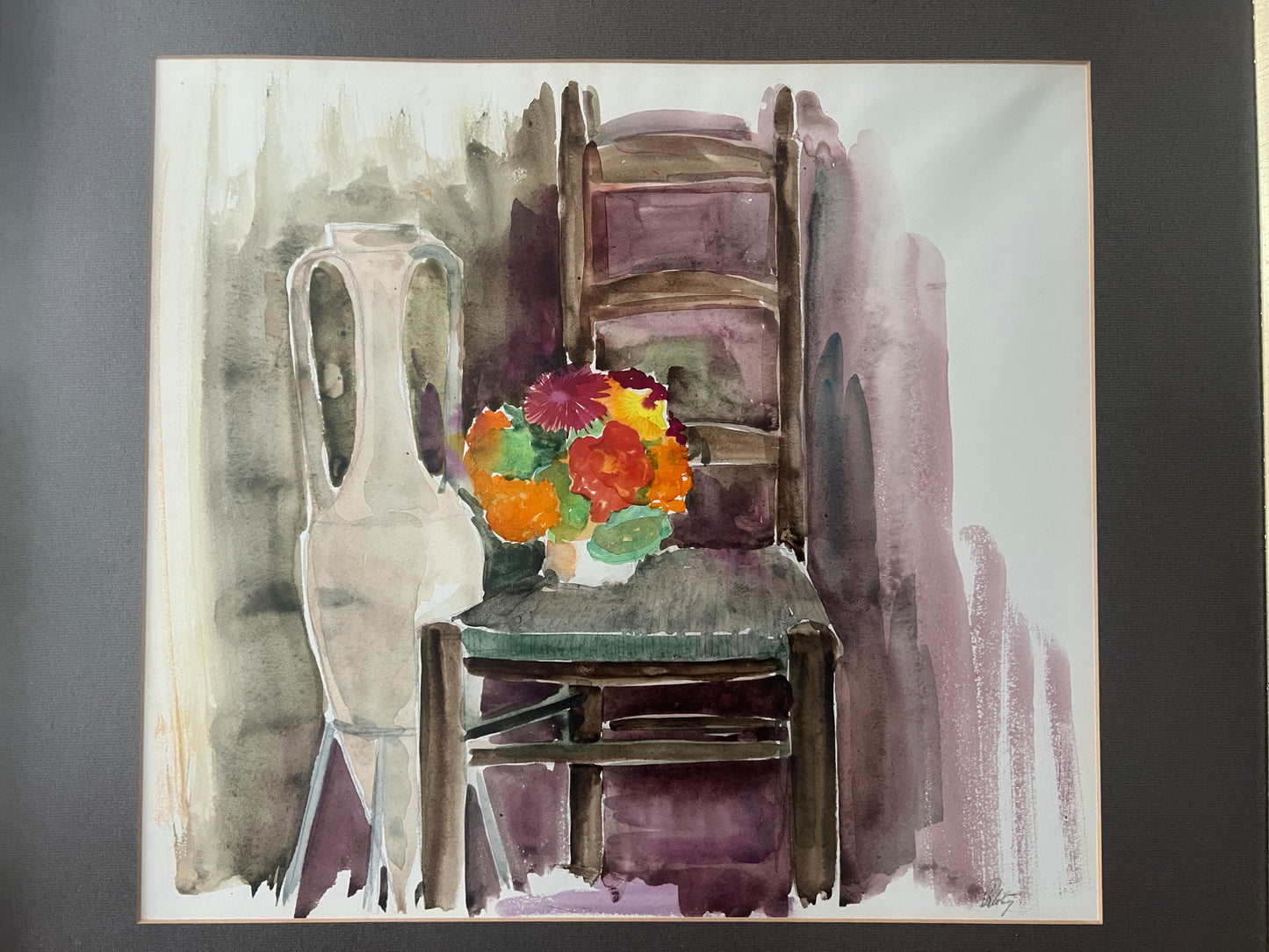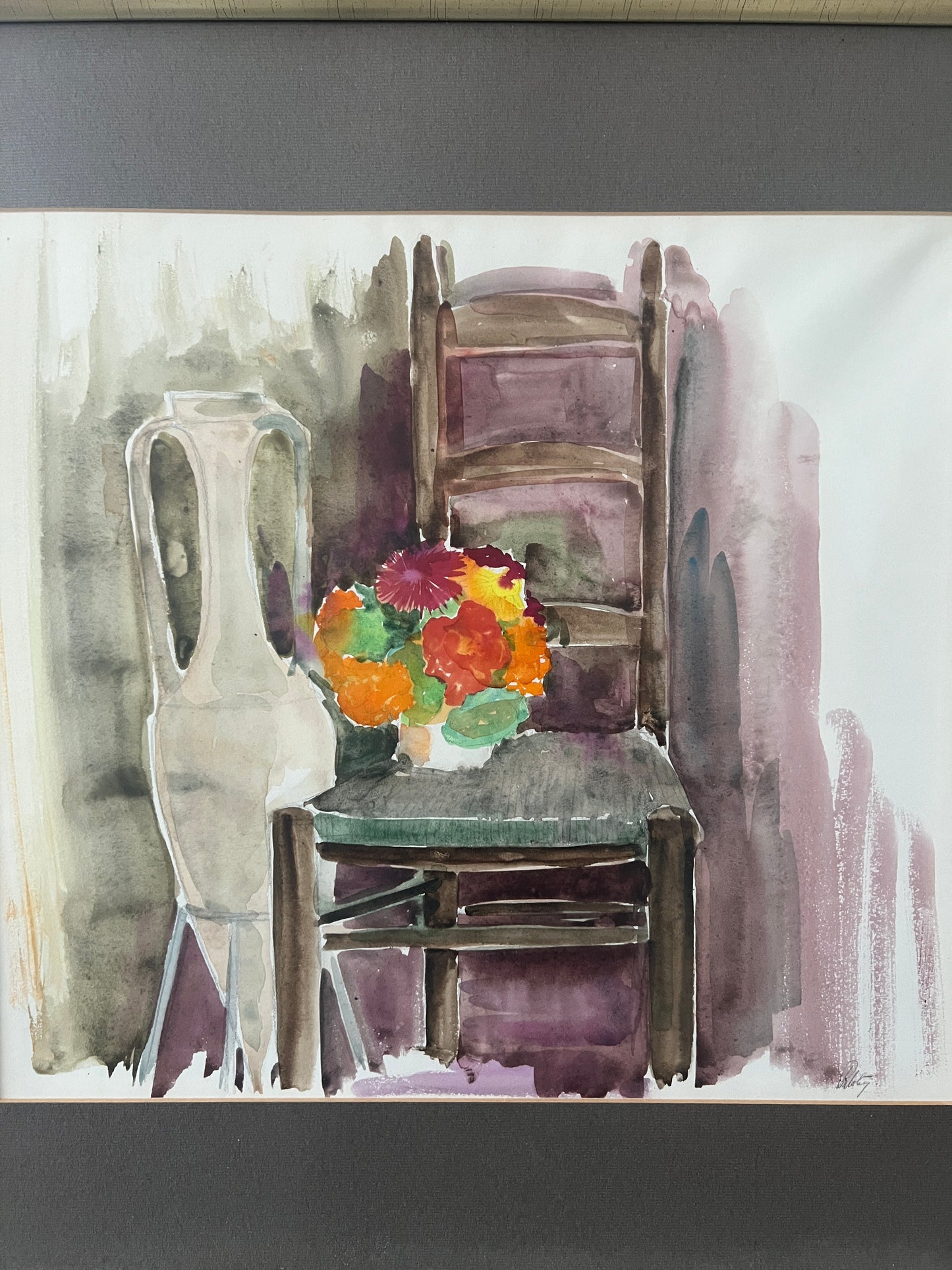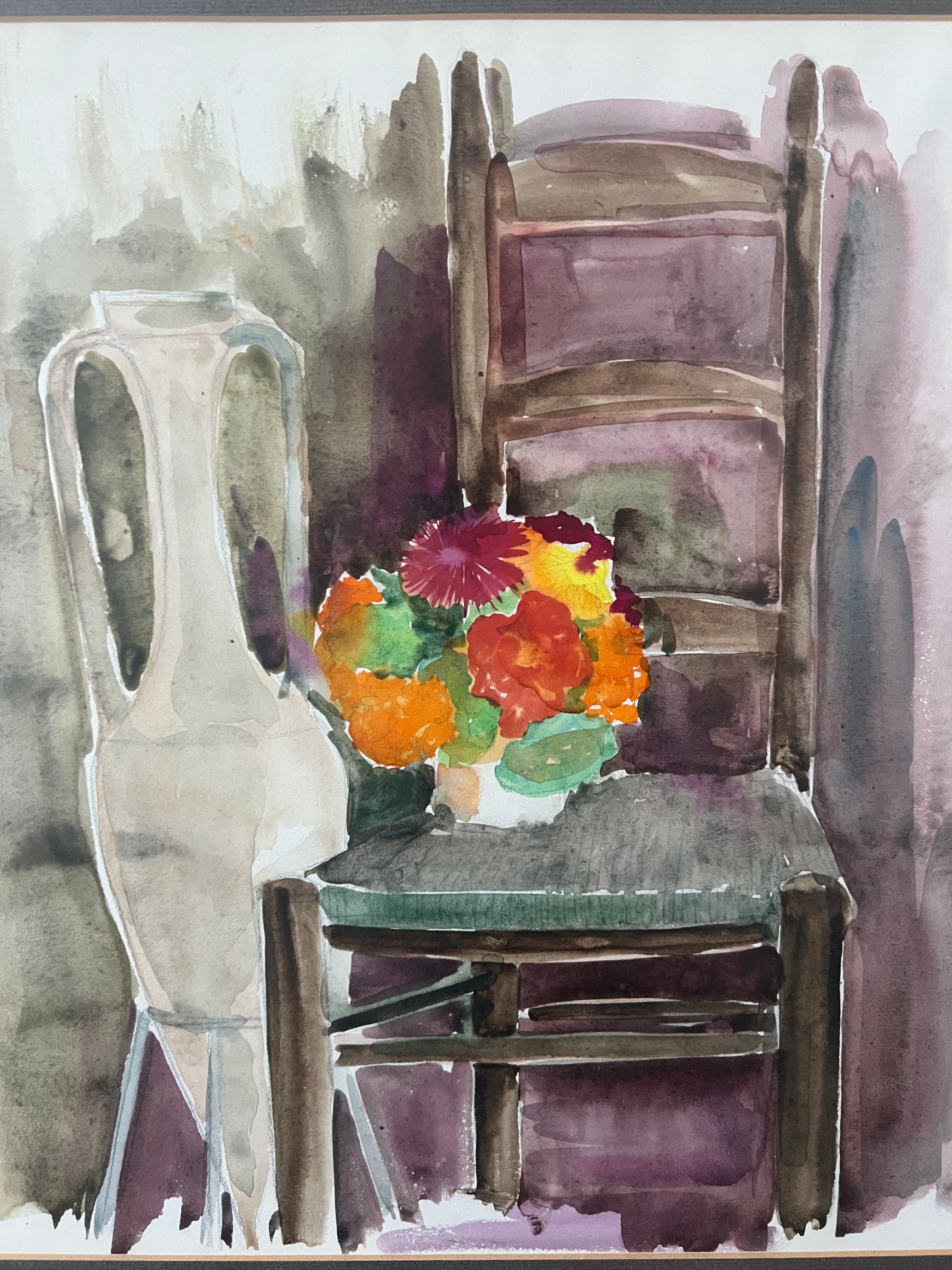Beschreibung: Dieses zauberhafte Aquarell der Europäischen Schule aus dem 20. Jahrhundert präsentiert ein bezauberndes Stillleben, das Ruhe und Schönheit ausstrahlt. Auf Steinpapier gemalt, zeigt das Bild einen eleganten Stuhl, der von einem farbenfrohen Blumenstrauß flankiert wird. Daneben steht eine imposante Bodenvase, die das Ensemble vervollständigt.