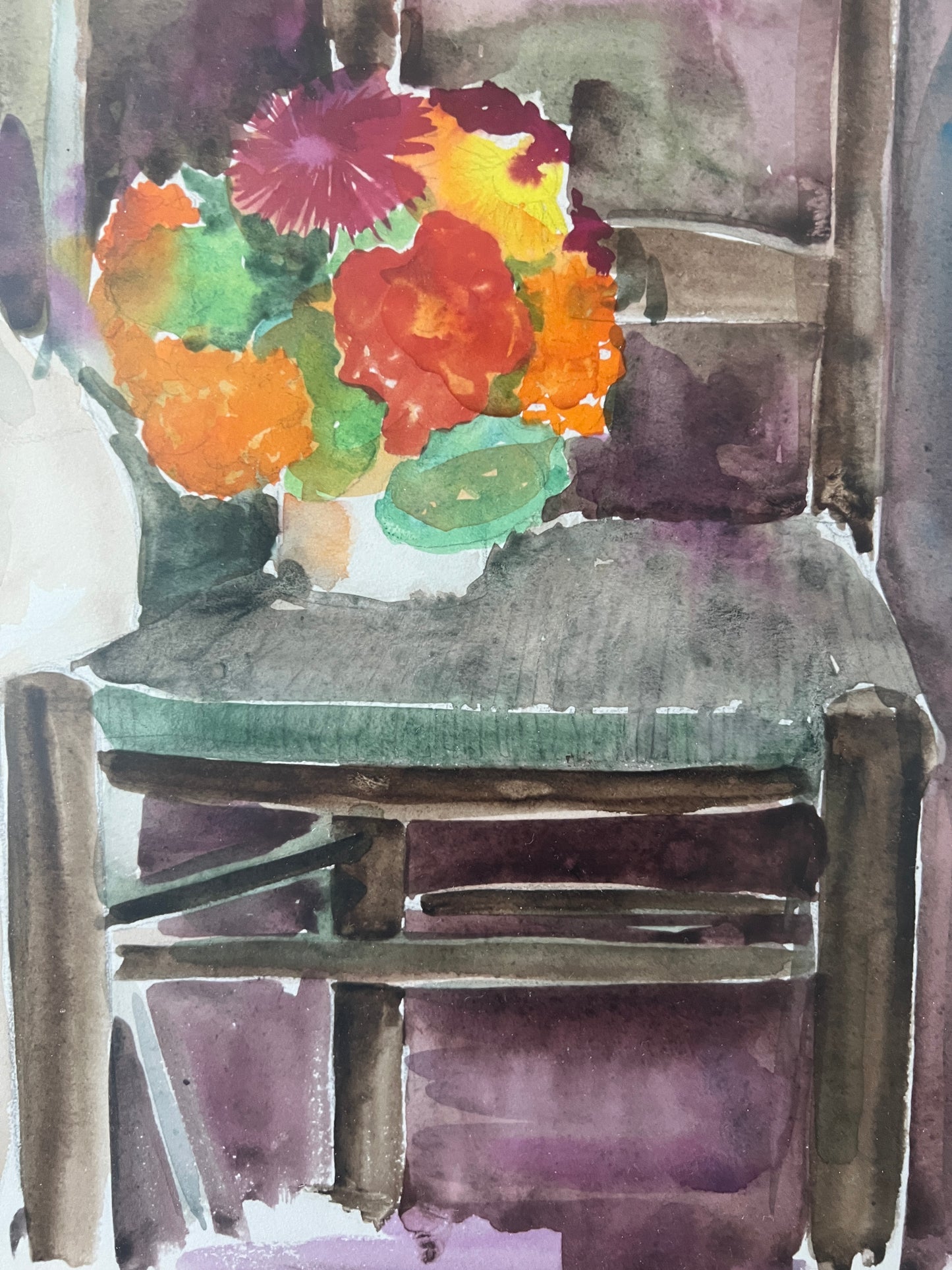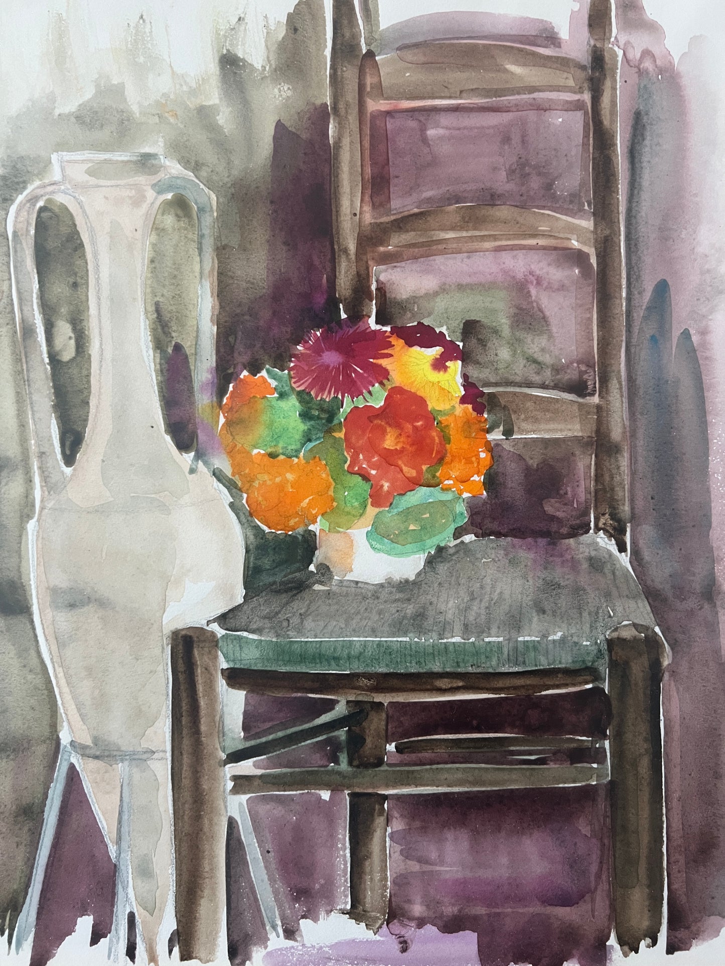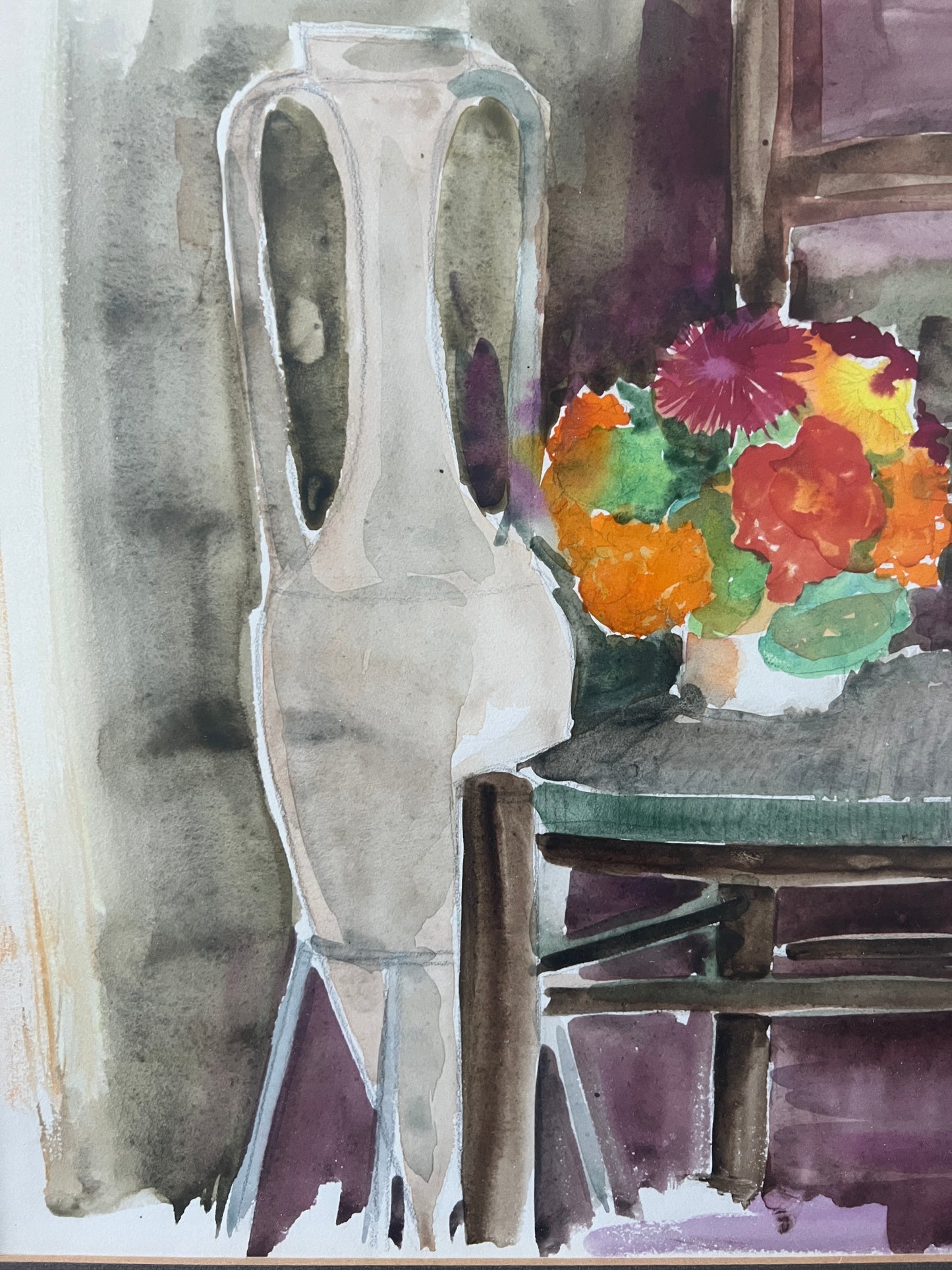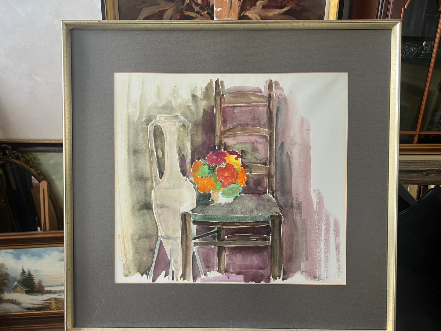 Beschreibung: Dieses zauberhafte Aquarell der Europäischen Schule aus dem 20. Jahrhundert präsentiert ein bezauberndes Stillleben, das Ruhe und Schönheit ausstrahlt. Auf Steinpapier gemalt, zeigt das Bild einen eleganten Stuhl, der von einem farbenfrohen Blumenstrauß flankiert wird. Daneben steht eine imposante Bodenvase, die das Ensemble vervollständigt.