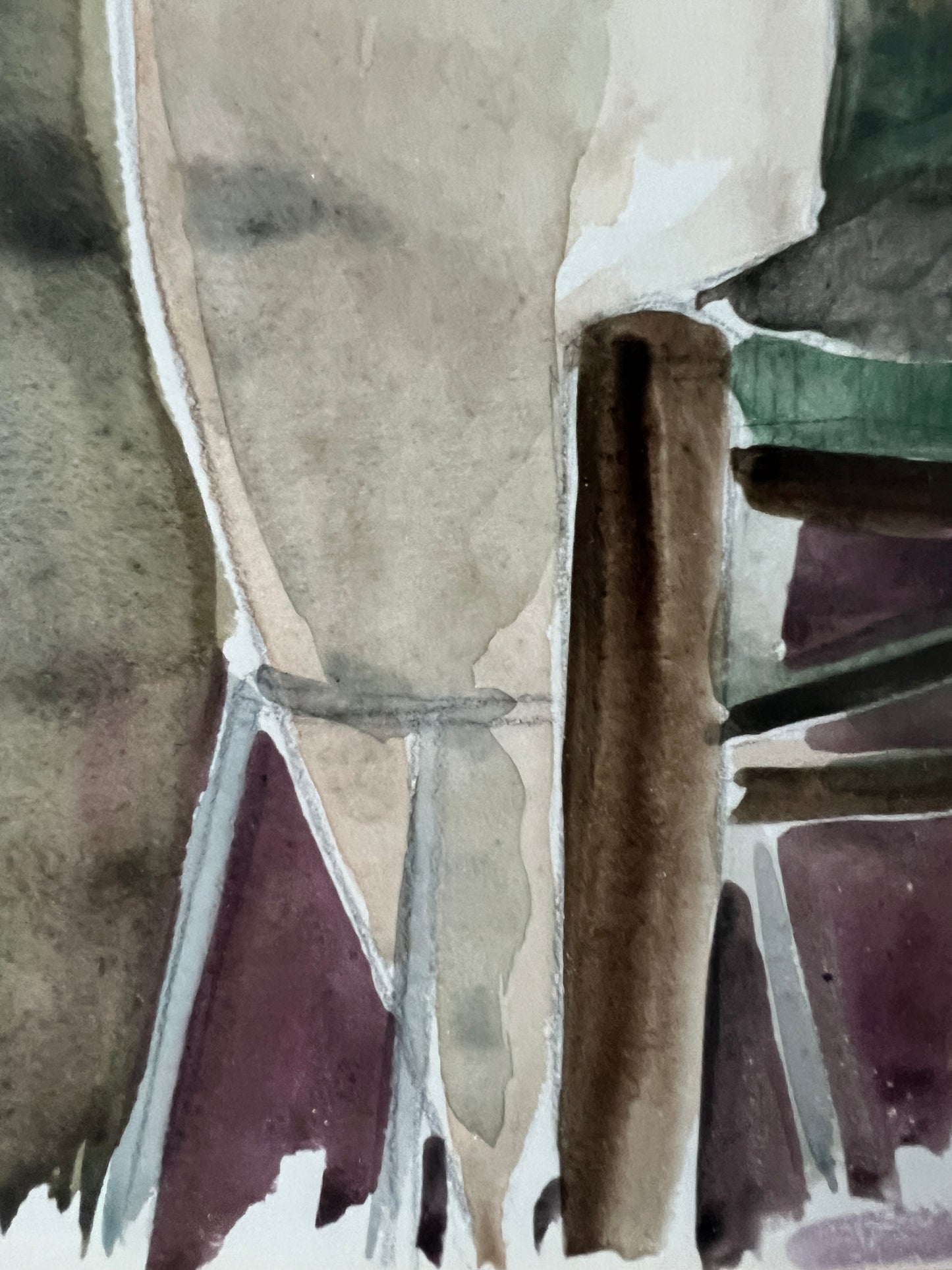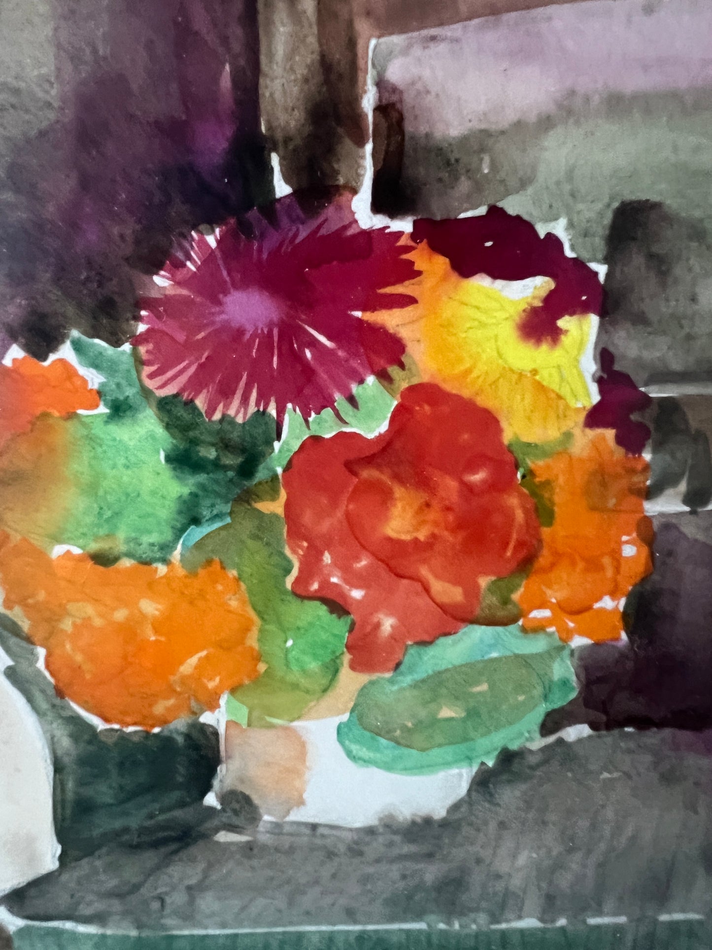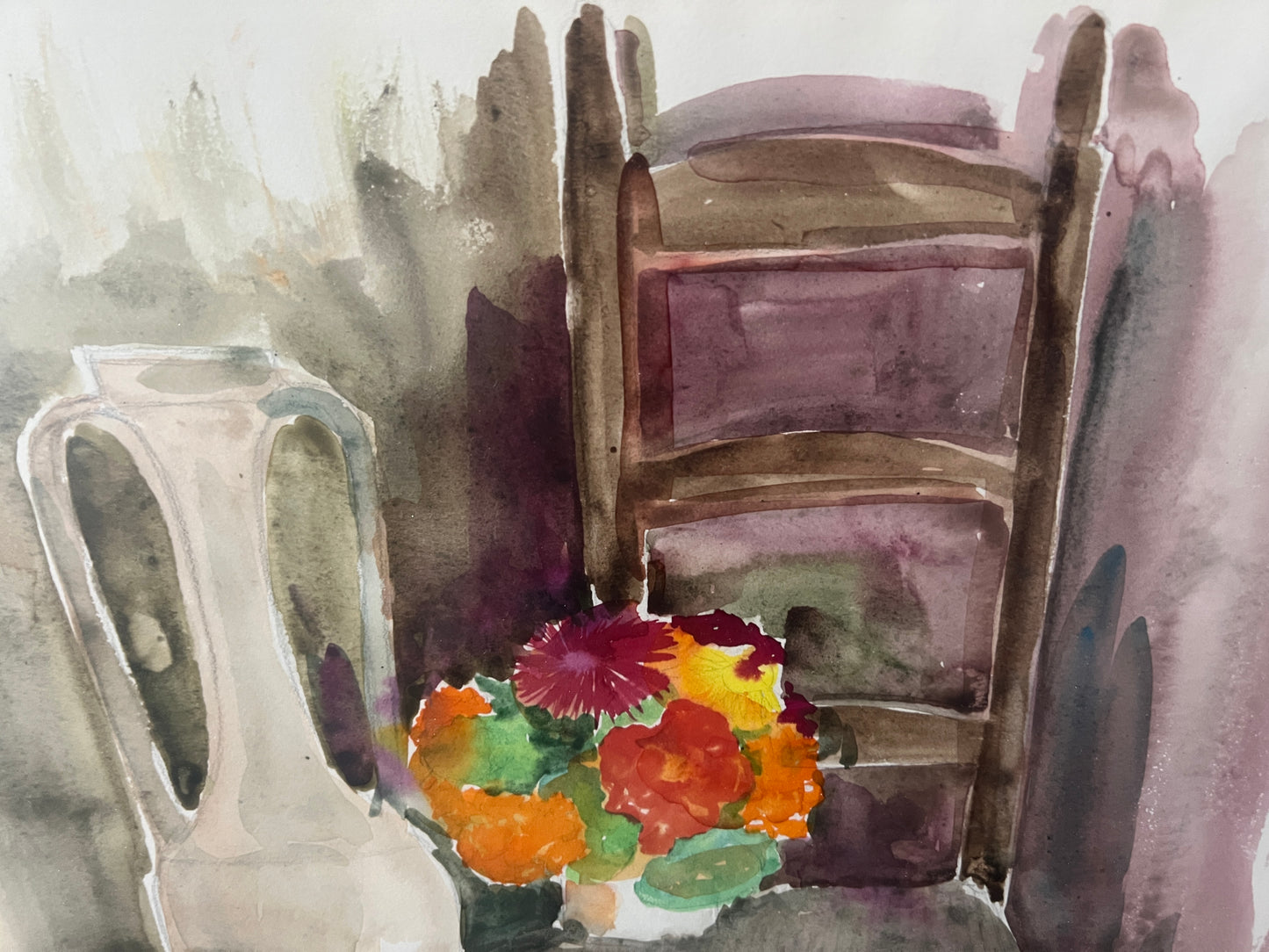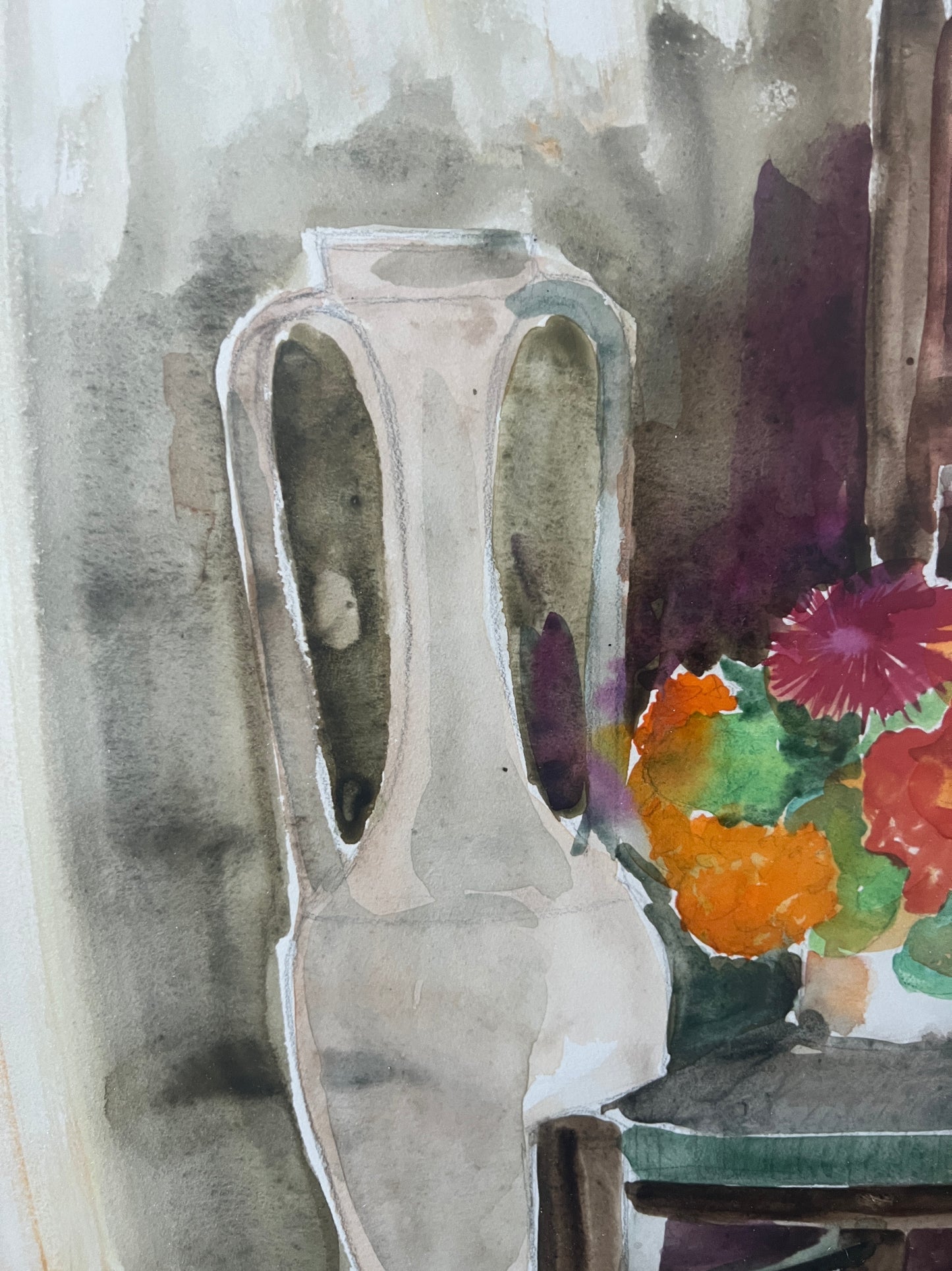 Beschreibung: Dieses zauberhafte Aquarell der Europäischen Schule aus dem 20. Jahrhundert präsentiert ein bezauberndes Stillleben, das Ruhe und Schönheit ausstrahlt. Auf Steinpapier gemalt, zeigt das Bild einen eleganten Stuhl, der von einem farbenfrohen Blumenstrauß flankiert wird. Daneben steht eine imposante Bodenvase, die das Ensemble vervollständigt.