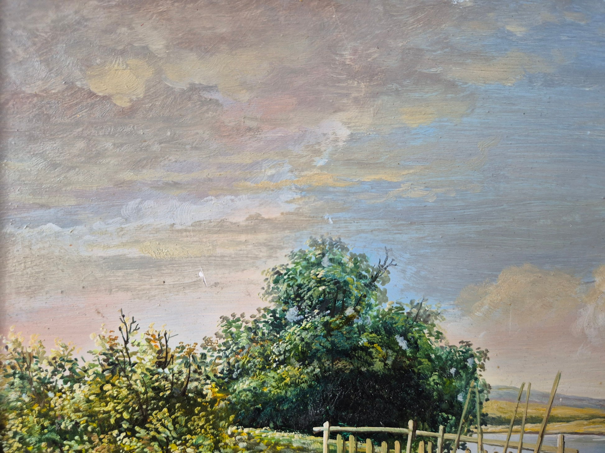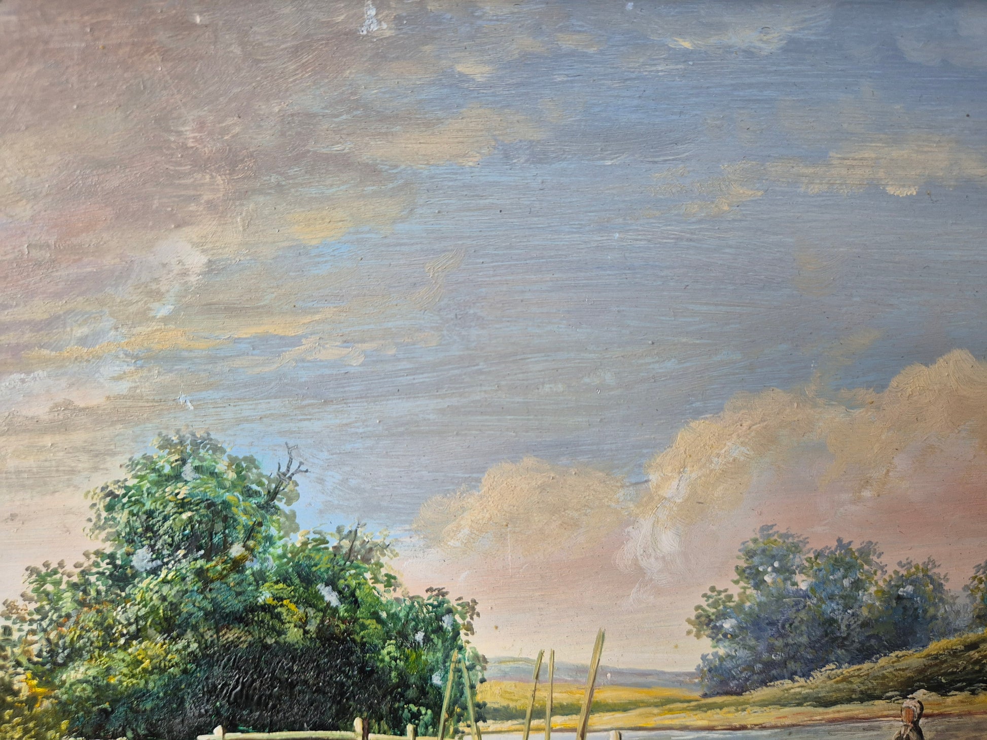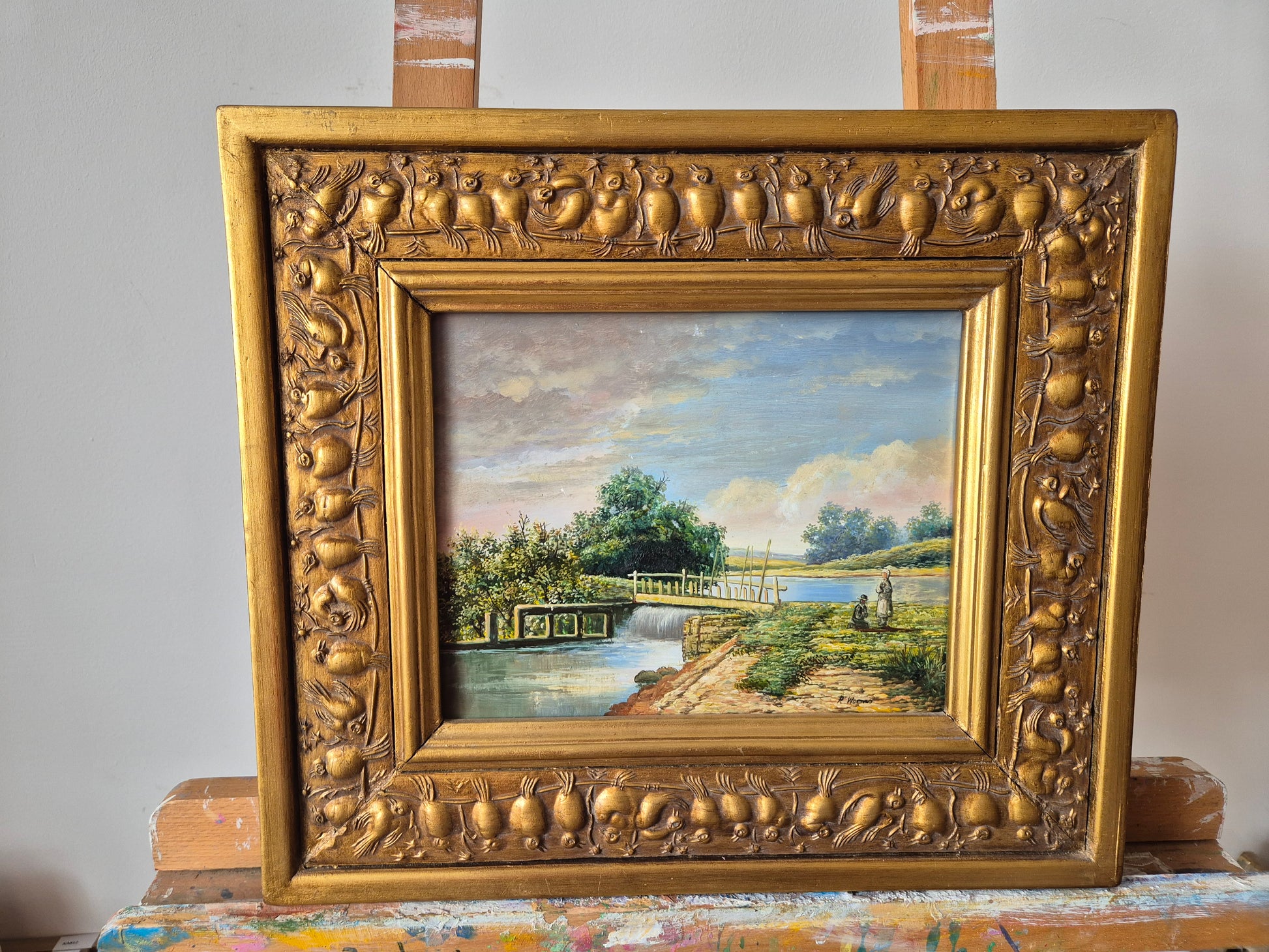 Dieses fein ausgearbeitete Ölgemälde aus der Europäischen Schule (XX) zeigt eine ruhige Uferszene, in der mehrere Figuren entlang eines Flusses dargestellt sind. Die Komposition vermittelt eine friedliche, sommerliche Atmosphäre – mit sanft fließendem Wasser, grüner Vegetation und einer weiten Landschaft im Hintergrund. Die realistische Darstellung und die ausgewogene Farbkomposition unterstreichen die malerische Stimmung. Das Werk ist handsigniert, wurde auf Holz gemalt und befindet sich in einem sehr guten Zustand. In einem passenden Rahmen gefasst, eignet sich dieses Gemälde ideal als dekorativer Blickfang oder als Ergänzung einer klassischen Kunstsammlung.