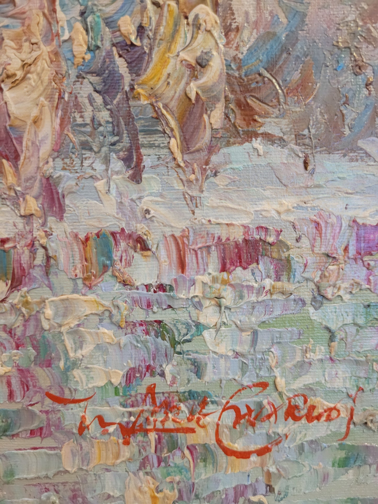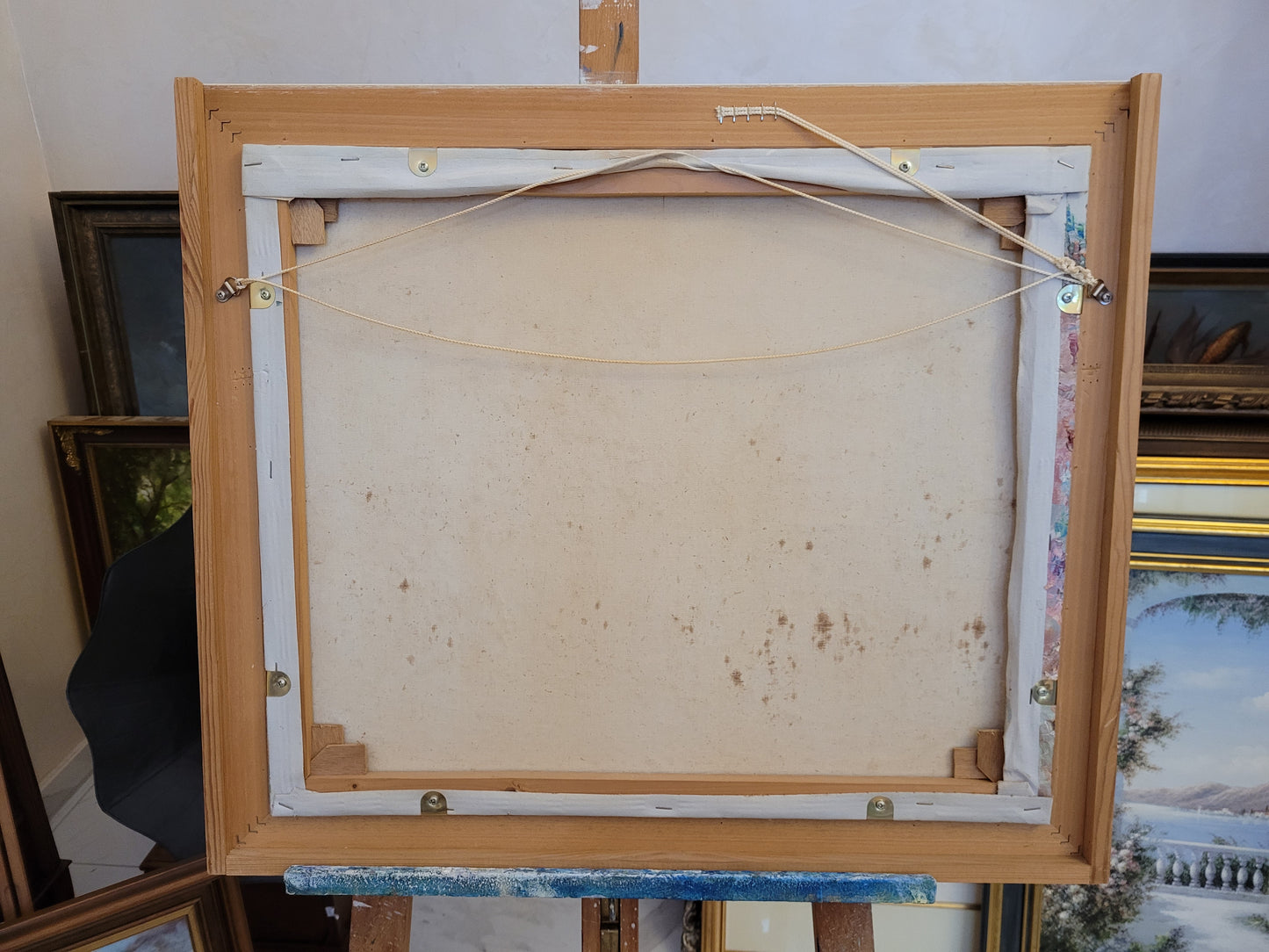 Mit den Maßen von 60 x 70 cm (mit Rahmen) bzw. 50 x 60 cm (ohne Rahmen) eignet sich dieses Gemälde ideal als Blickfang in Ihrem Zuhause oder als wertvolle Ergänzung Ihrer Kunstsammlung. Die handsignierte Signatur auf der Leinwand unterstreicht die Authentizität und Qualität dieses Werkes.