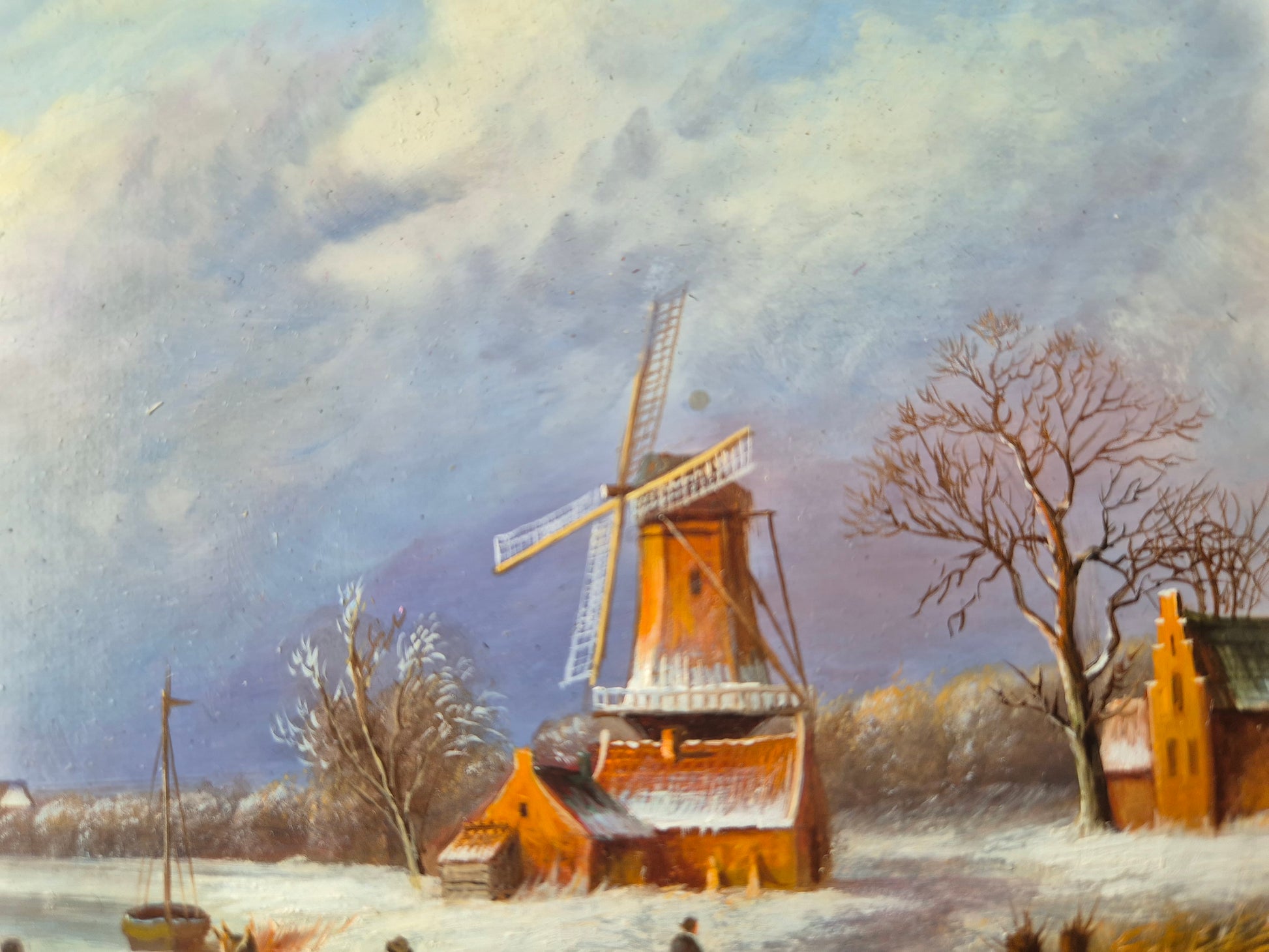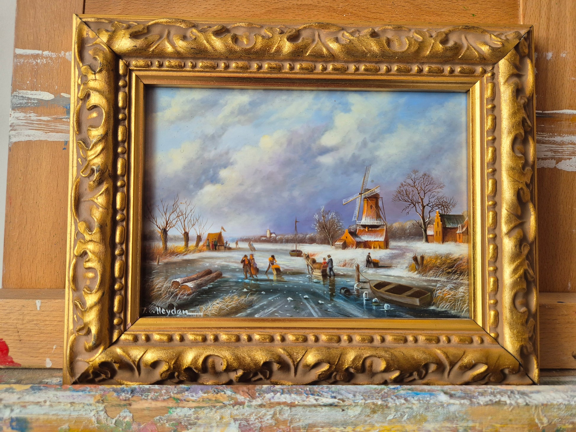 Dieses fein gearbeitete Ölgemälde aus der J.v. Heyden (XX) Handsigniert zeigt eine verschneite Winterlandschaft mit einer Windmühle als zentrales Motiv. Die Szene ist in sanften Farbtönen gehalten, die die ruhige Atmosphäre eines winterlichen Tages einfangen. Die Windmühle, umgeben von schneebedeckten Bäumen und einem zugefrorenen Gewässer, verleiht dem Bild eine nostalgische Note. Die feine Pinselführung und die harmonische Komposition zeugen von handwerklichem Können. Das Werk ist handsigniert, auf Holz gemalt und befindet sich in einem sehr guten Zustand. Der schlichte Rahmen ergänzt das Gemälde dezent und macht es zu einem charmanten Stück klassischer Winterlandschaftsmalerei.