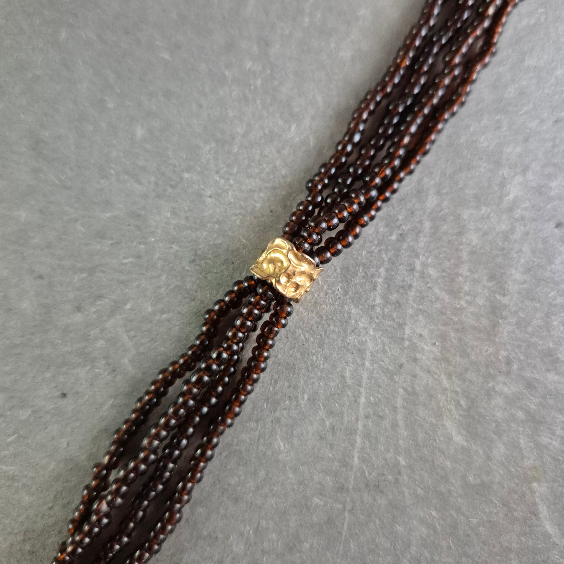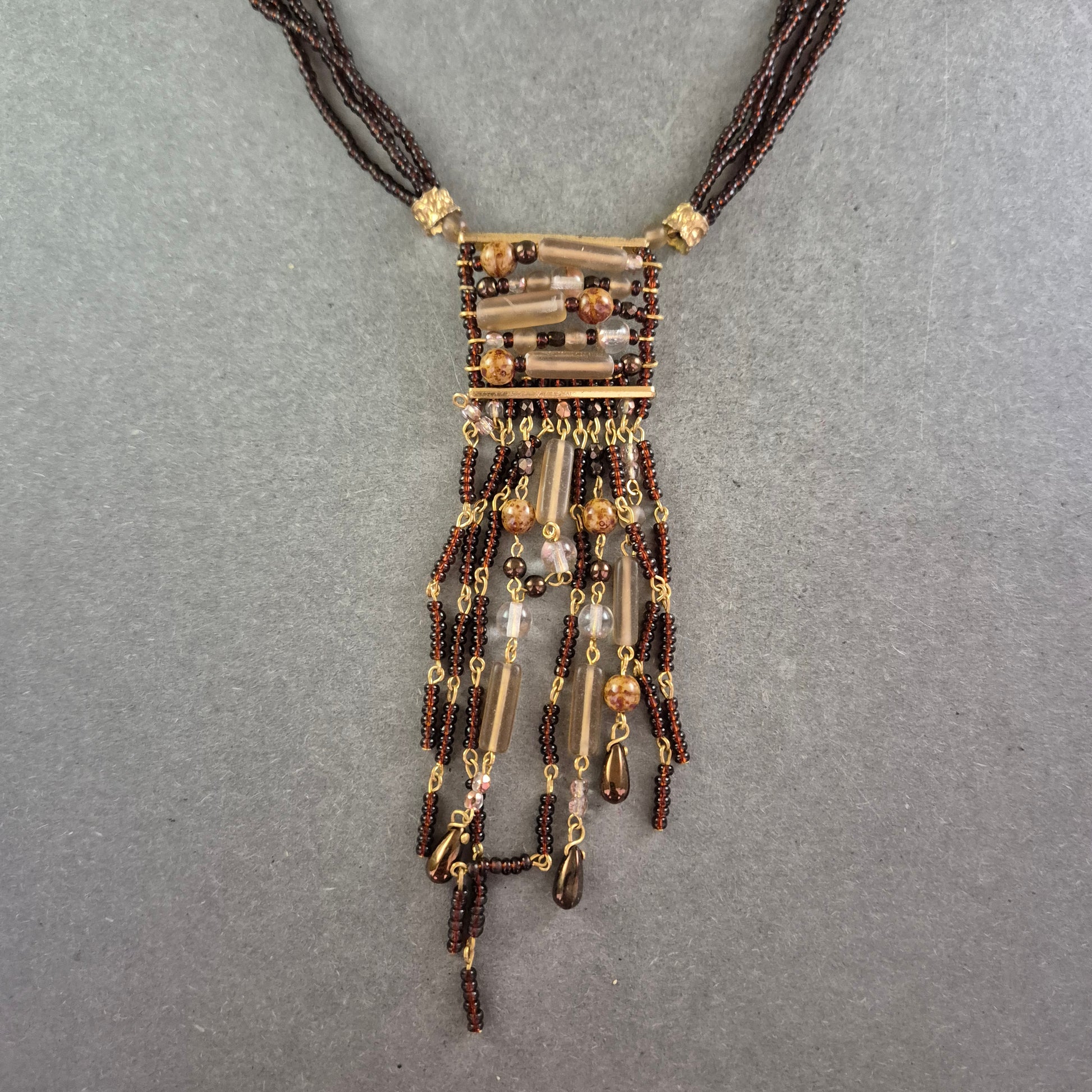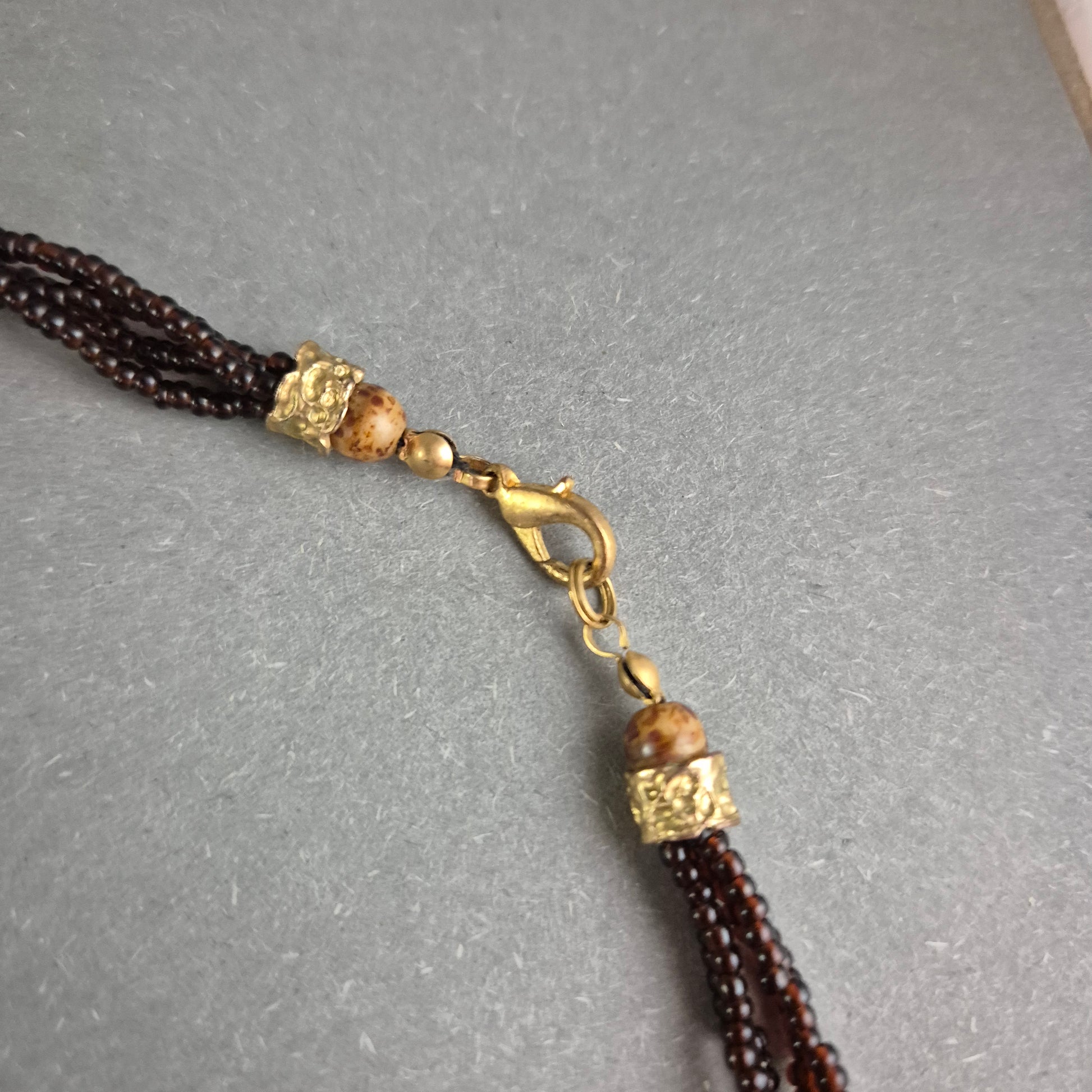 Diese außergewöhnliche Damen Kette besticht durch ihr kunstvolles Ethno-Design mit viel Liebe zum Detail. Mehrreihige, dunkelbraune Glasperlen bilden das Grundelement, während der Mittelteil mit goldfarbenen Elementen und facettierten Perlen verziert ist. Besonders auffällig ist das lange Fransen-Element mit unterschiedlich großen Perlen und Anhängern, das der Kette Bewegung und einen exotischen Charme verleiht. Ein stilvolles Accessoire, das jedes Outfit aufwertet – ob zu schlichter Kleidung oder als Statement-Stück.