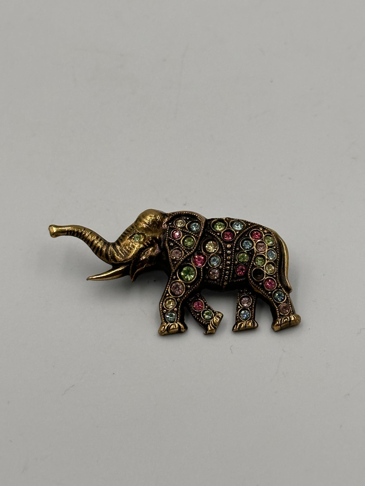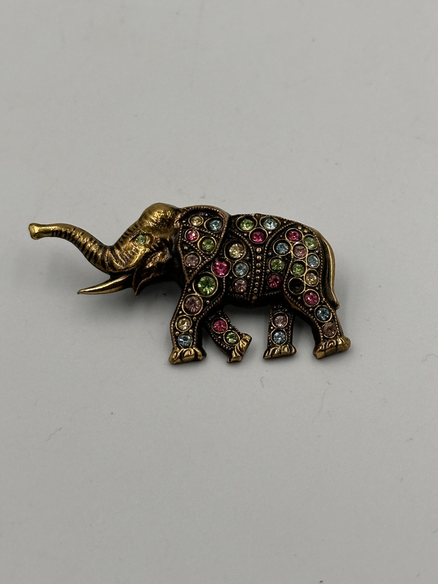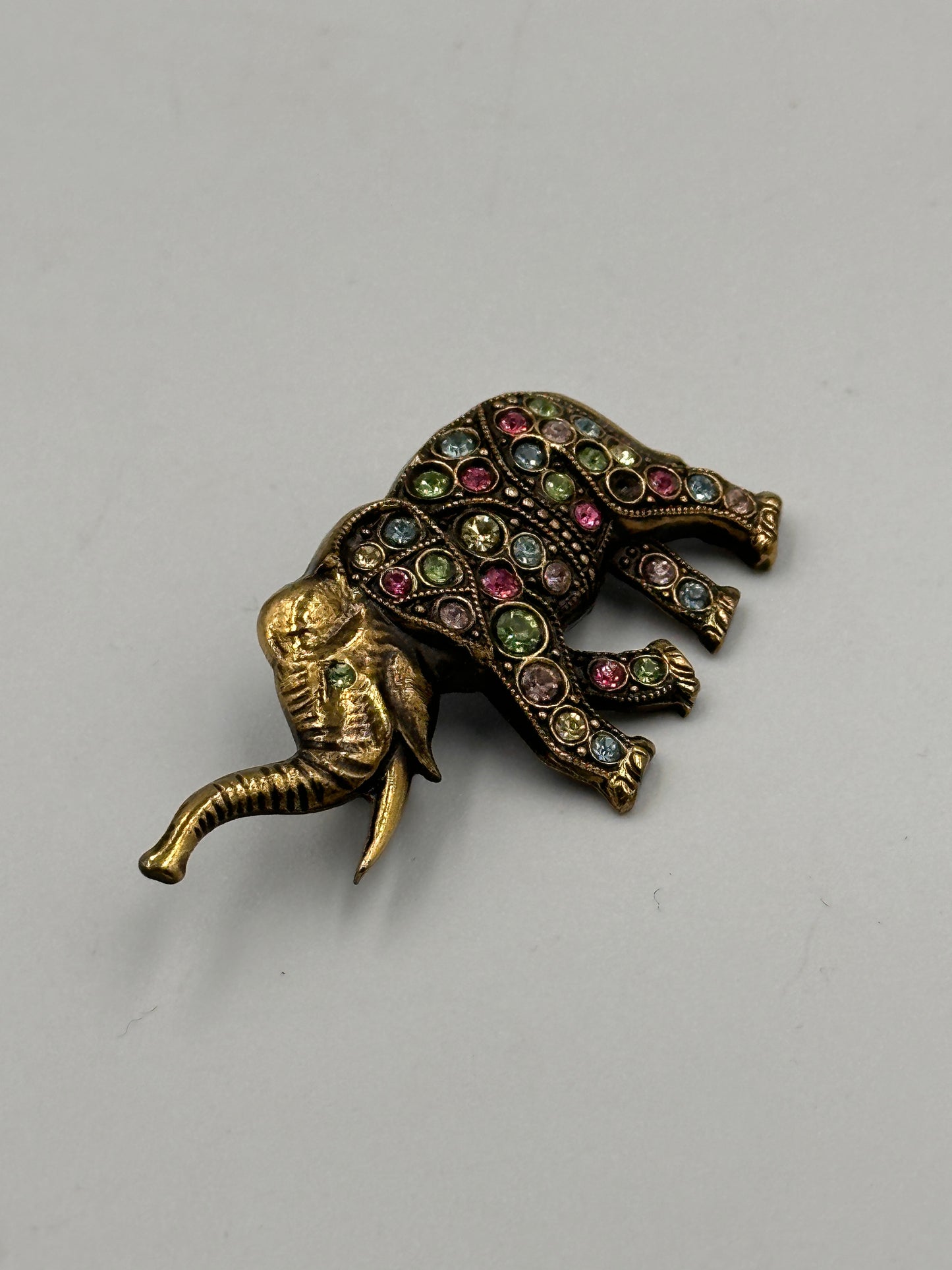 Entdecken Sie die Schönheit Indiens mit dieser faszinierenden vergoldeten Vintage-Brosche in Form eines indischen Elefanten. Die Brosche ist kunstvoll mit Zirkonia-Steinen in mehreren Farben verziert, wobei ein Stein fehlt, was ihr einen besonderen Vintage-Charme verleiht.