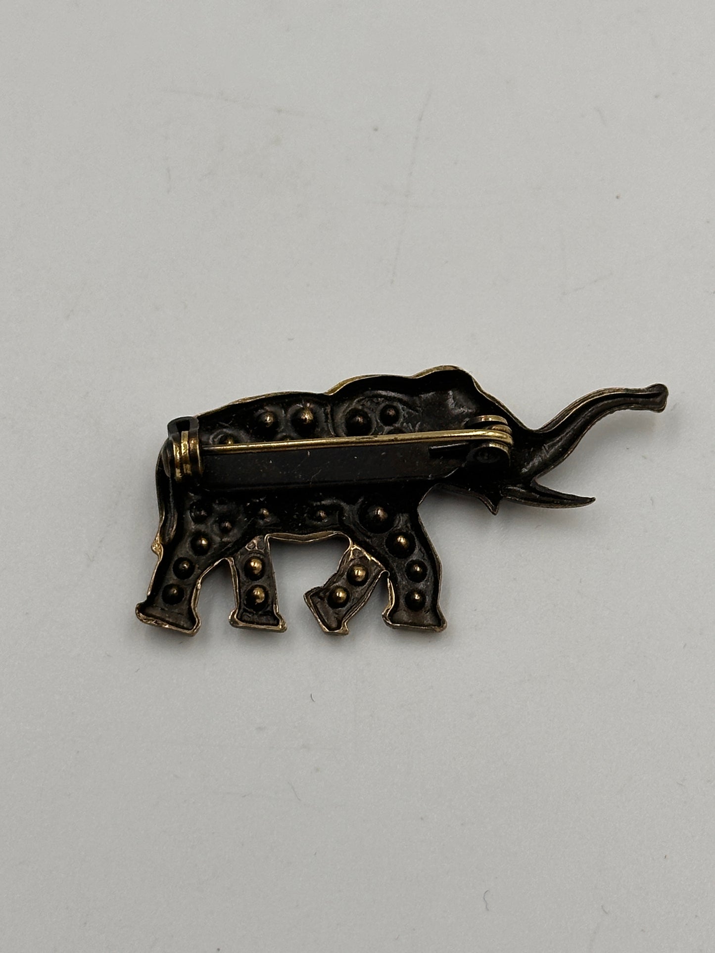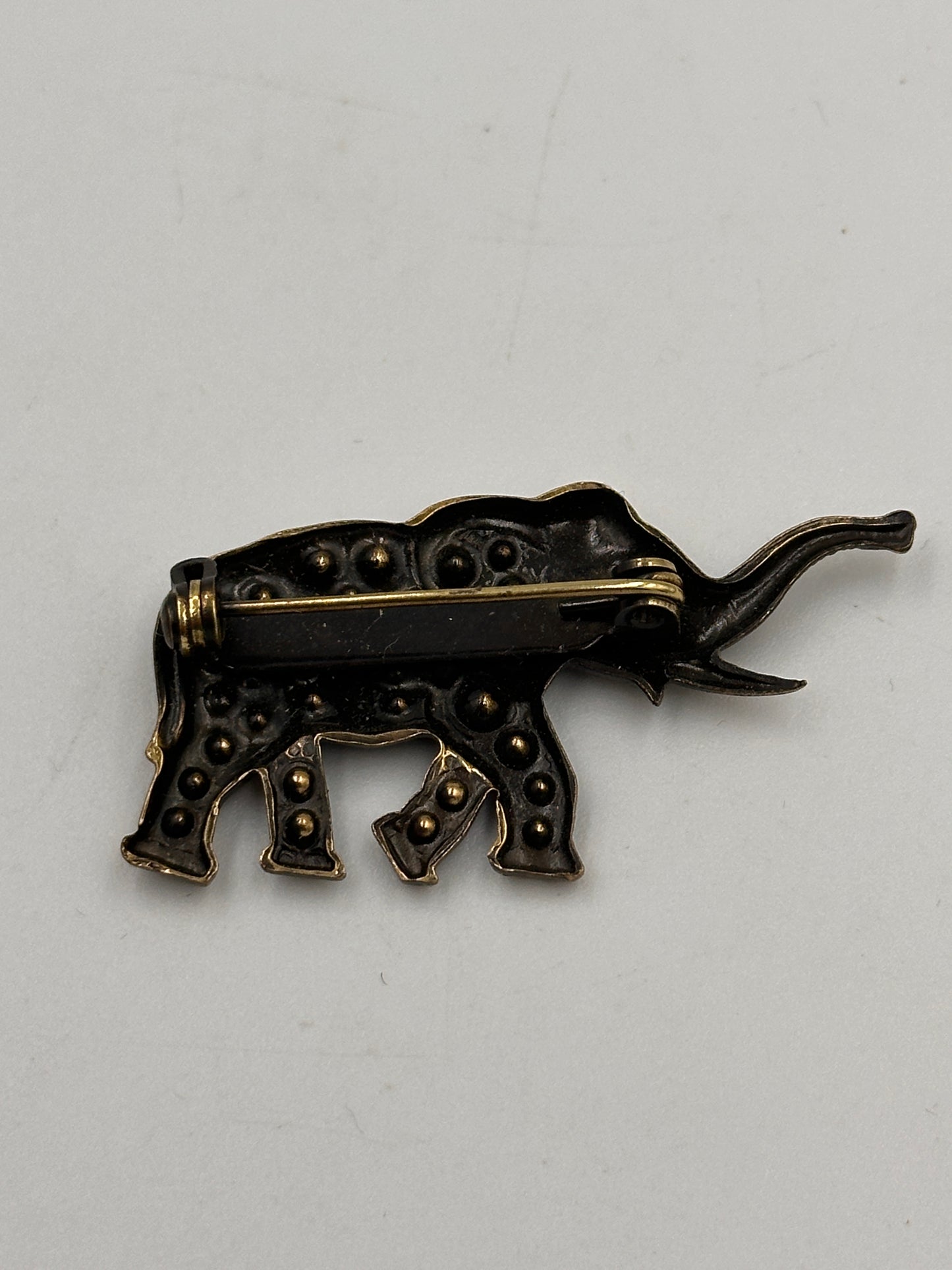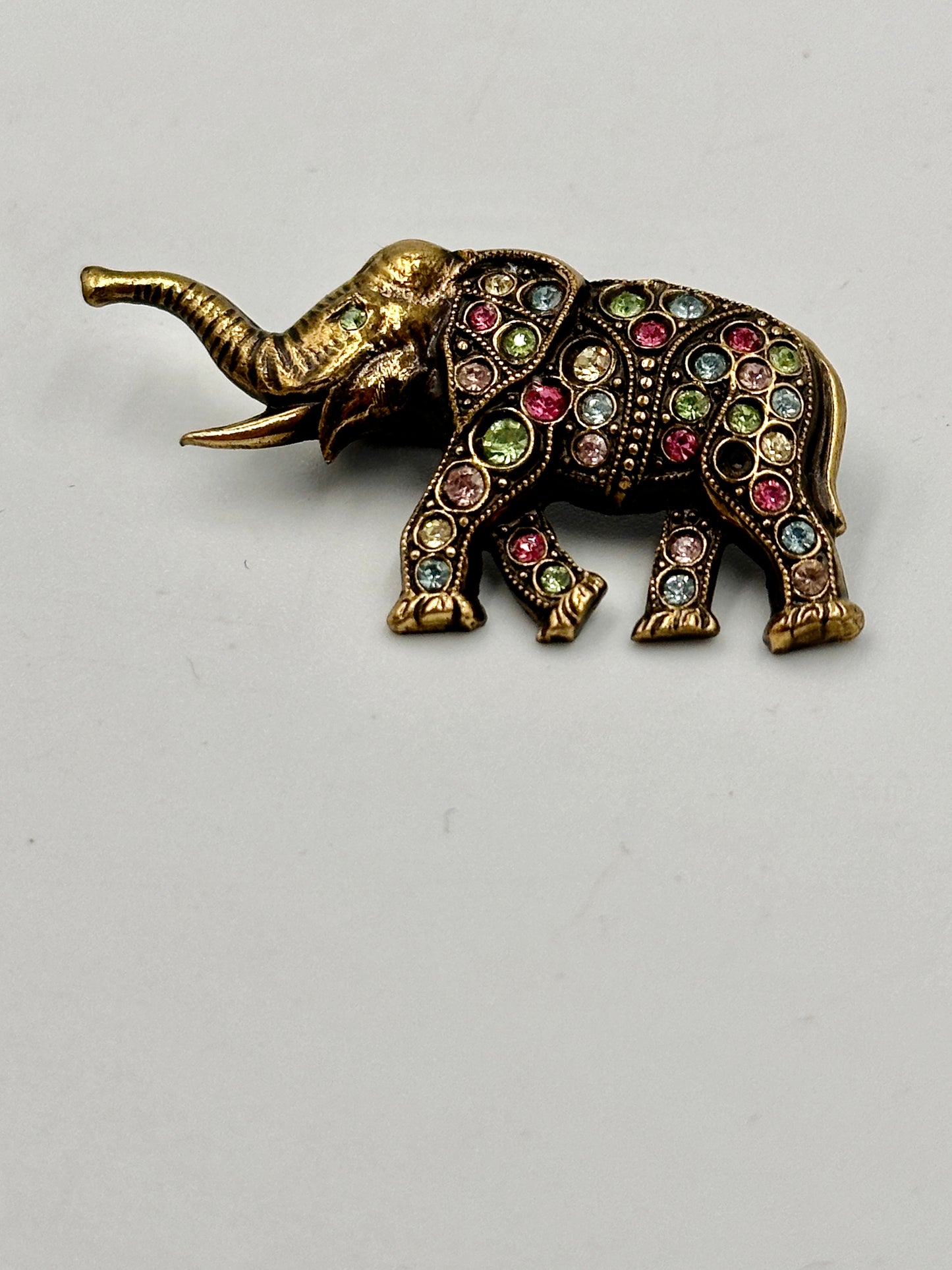 Entdecken Sie die Schönheit Indiens mit dieser faszinierenden vergoldeten Vintage-Brosche in Form eines indischen Elefanten. Die Brosche ist kunstvoll mit Zirkonia-Steinen in mehreren Farben verziert, wobei ein Stein fehlt, was ihr einen besonderen Vintage-Charme verleiht.