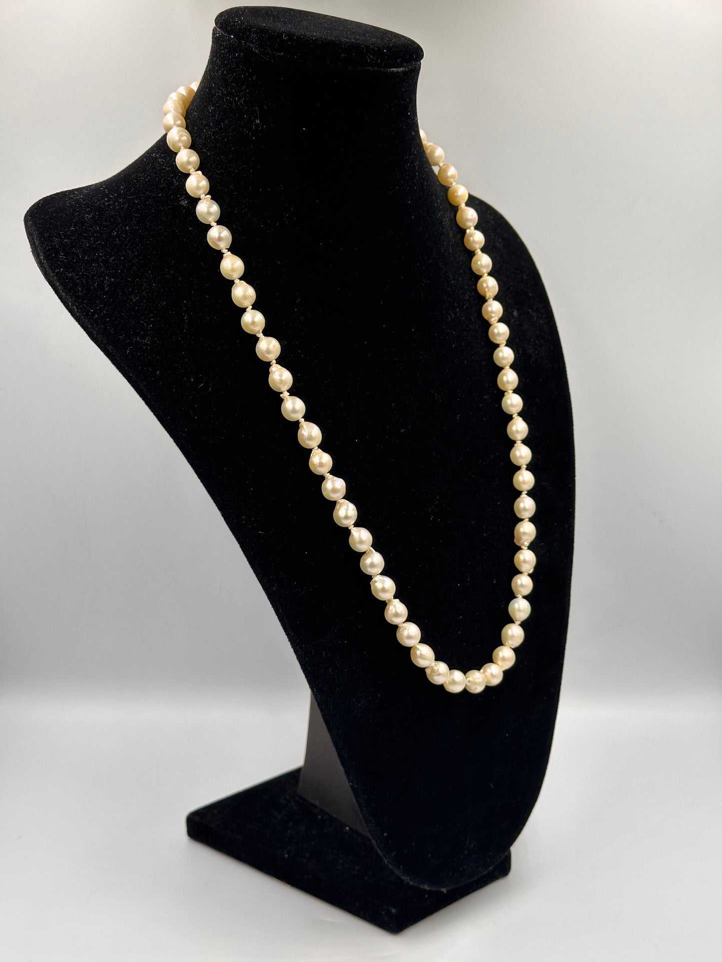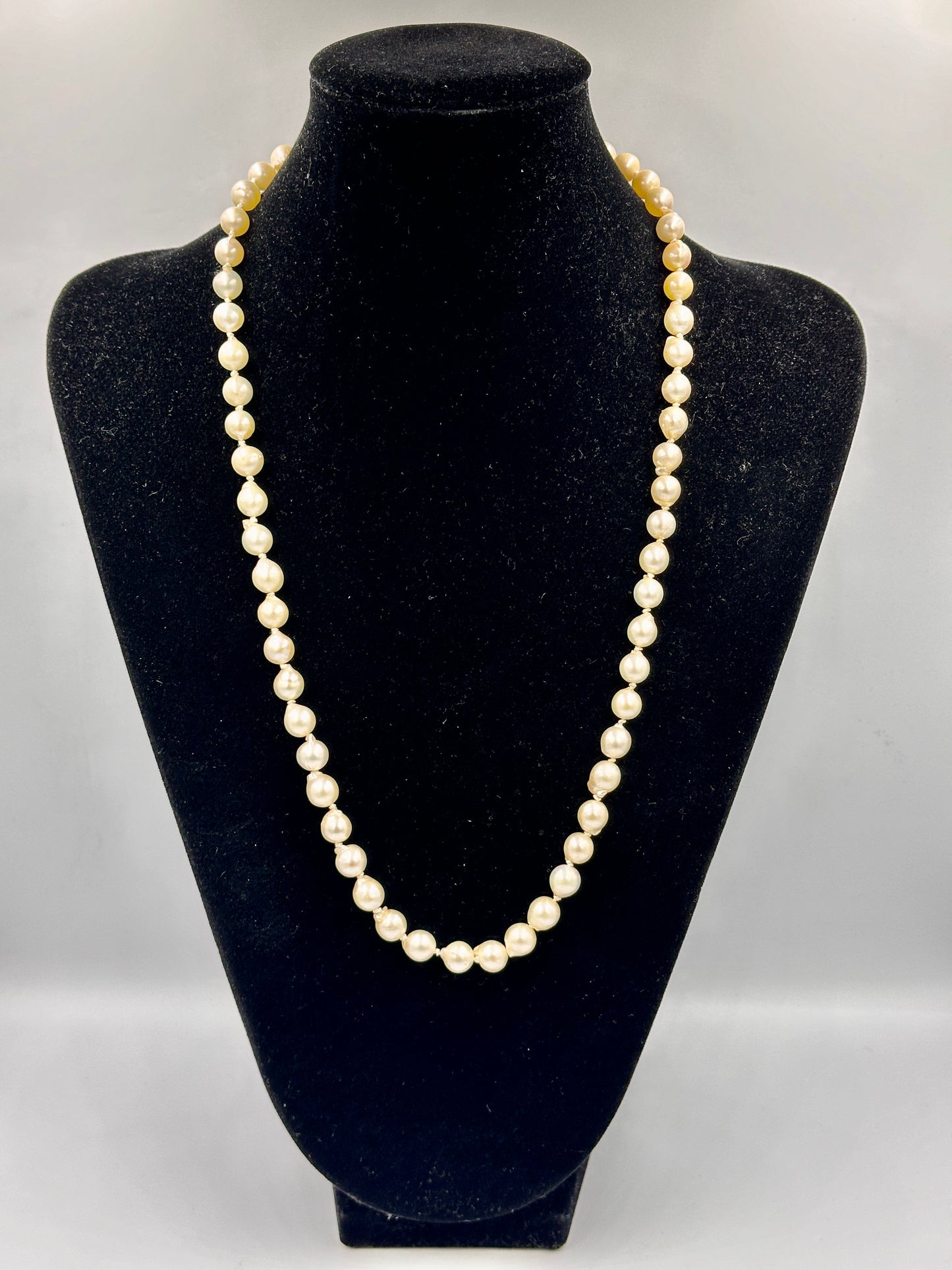 Diese wunderschöne Perlenkette vereint klassische Eleganz mit einem Hauch von Farbe. Sie ist 60 cm lang und wiegt 40,8 Gramm. Die Perlen sind echte, hochwertige Exemplare, während der Verschluss aus Silber 835 gefertigt ist und mit roten Steinen verziert wurde.