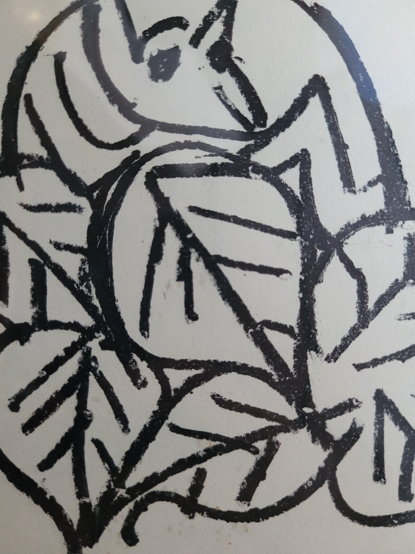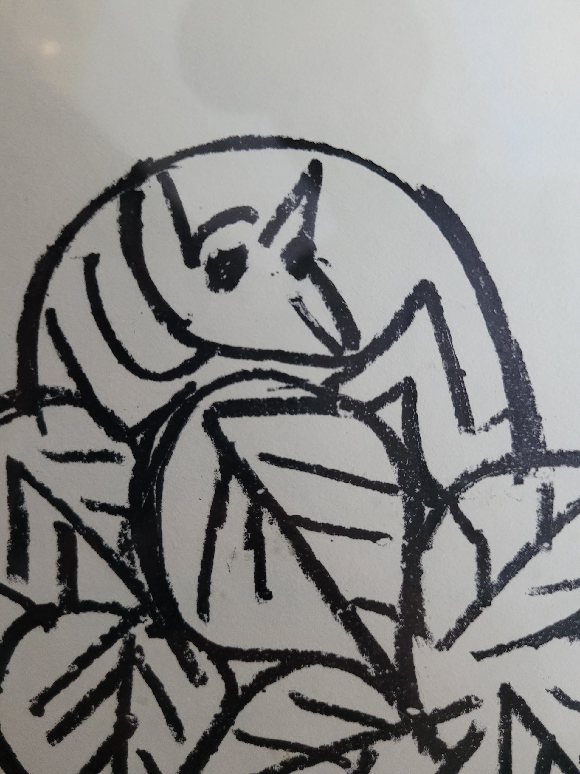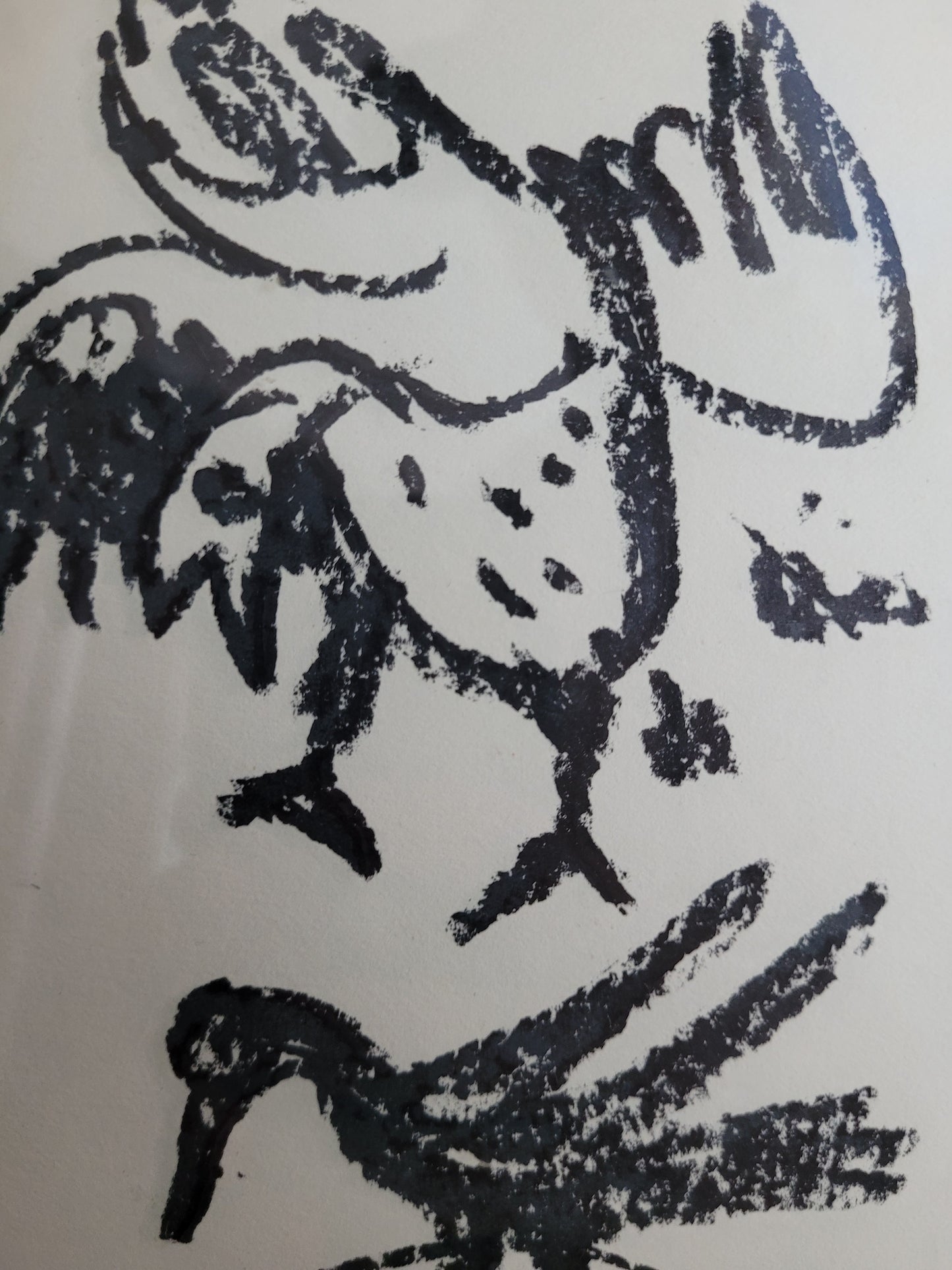 Schwarz-weiße Lithografie mit drei stilisierten Fabelwesen 24x54cm