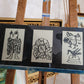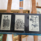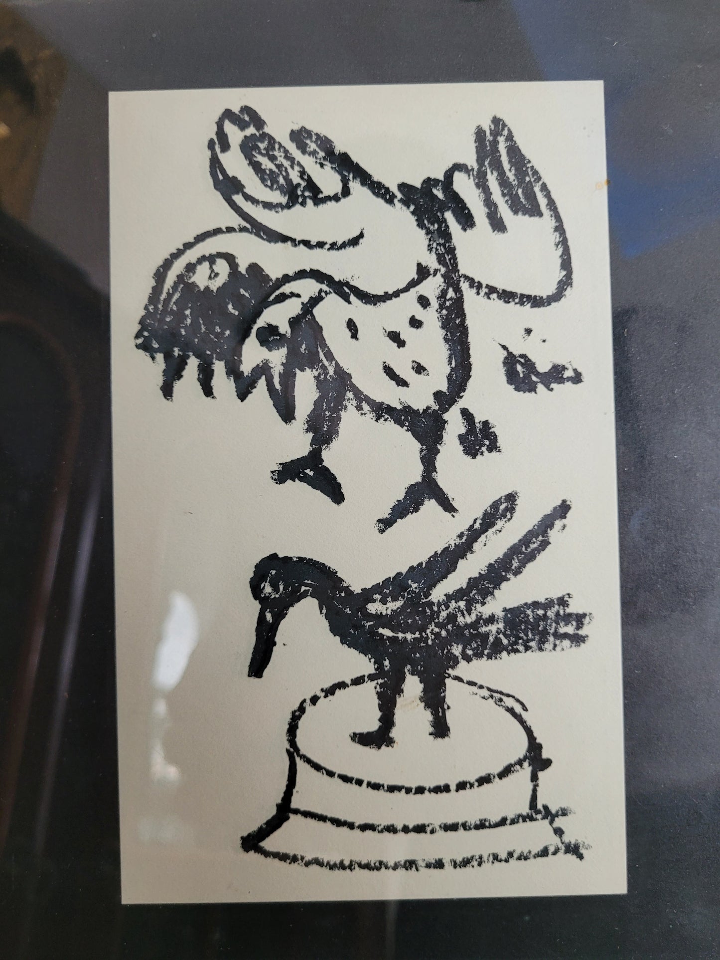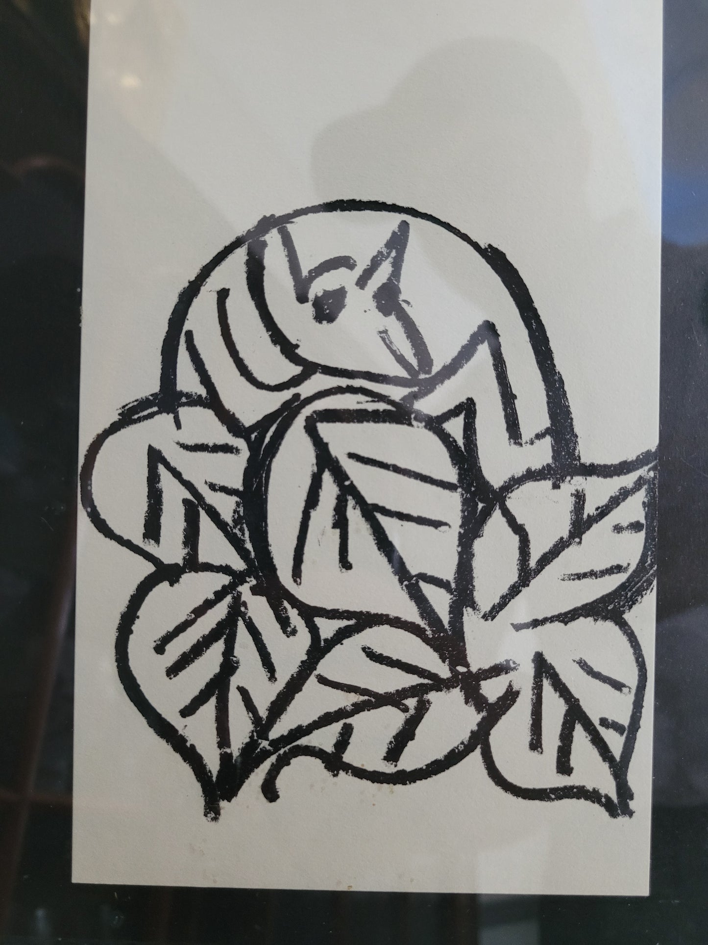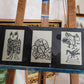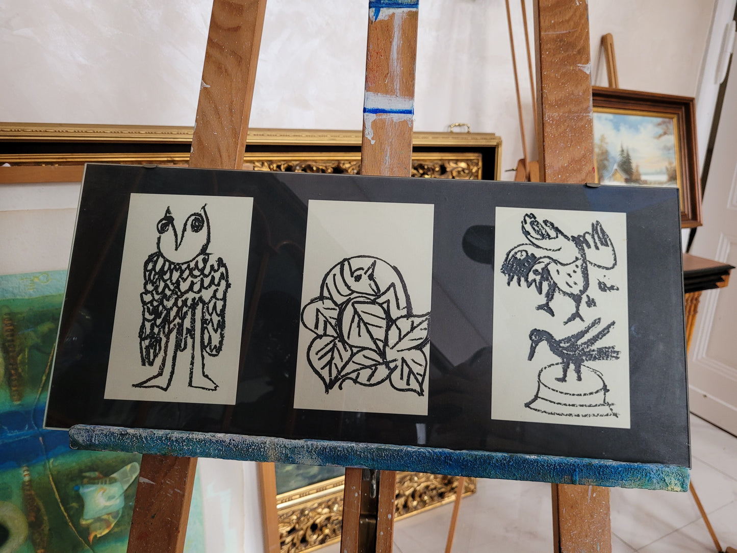 Schwarz-weiße Lithografie mit drei stilisierten Fabelwesen 24x54cm