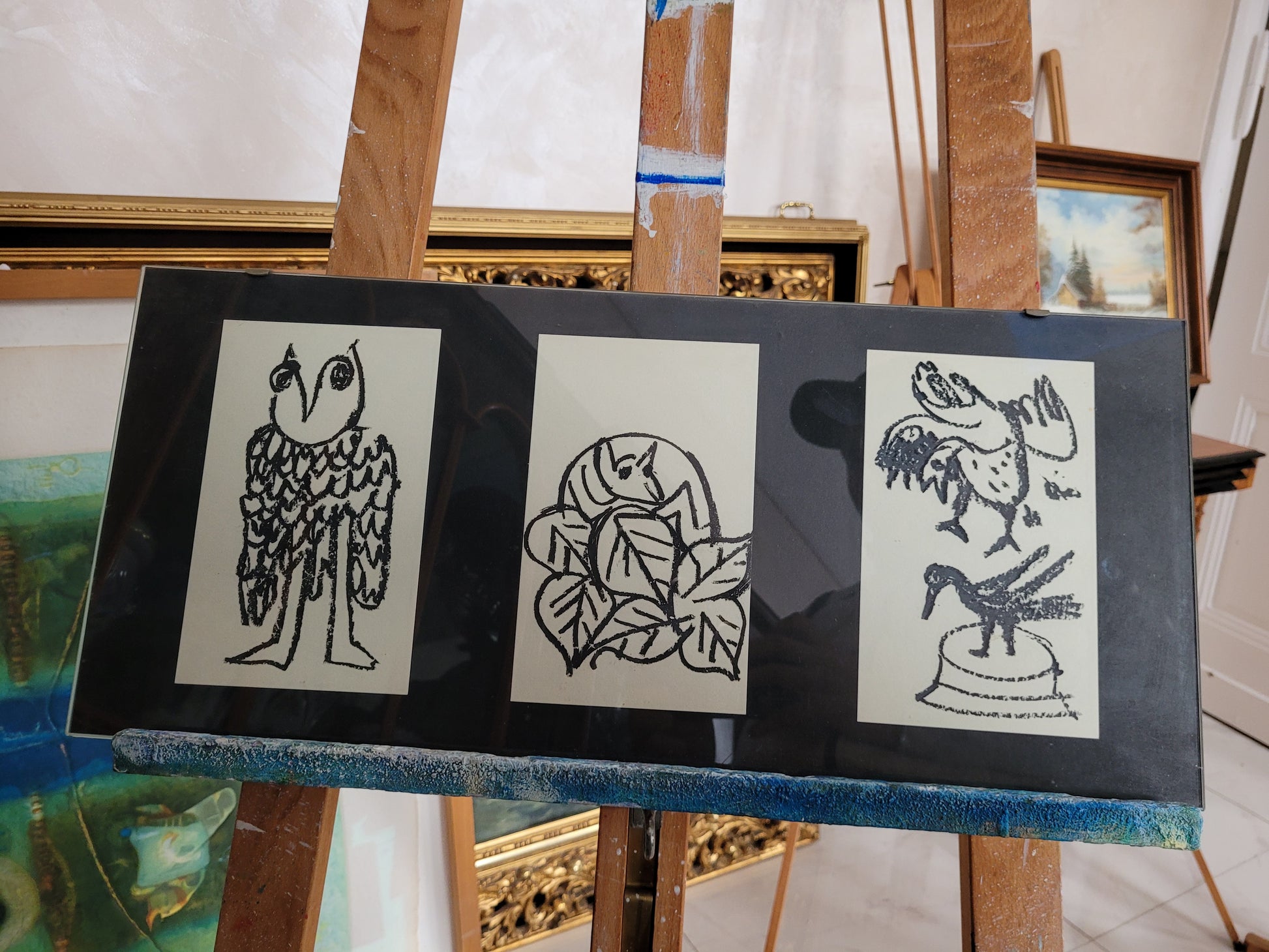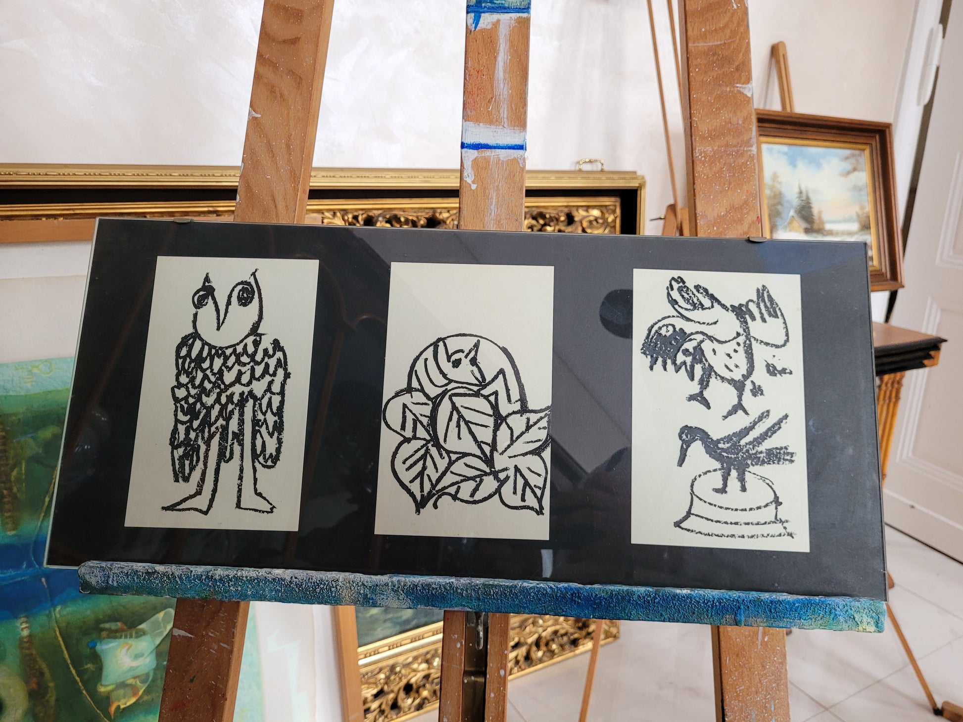 Diese eindrucksvolle Lithografie in Schwarz-Weiß zeigt drei stilisierte Fabelwesen in einer reduzierten, grafisch klaren Komposition. Die künstlerische Darstellung verbindet mythologische Anklänge mit moderner Formensprache und lädt zur freien Interpretation ein.