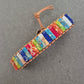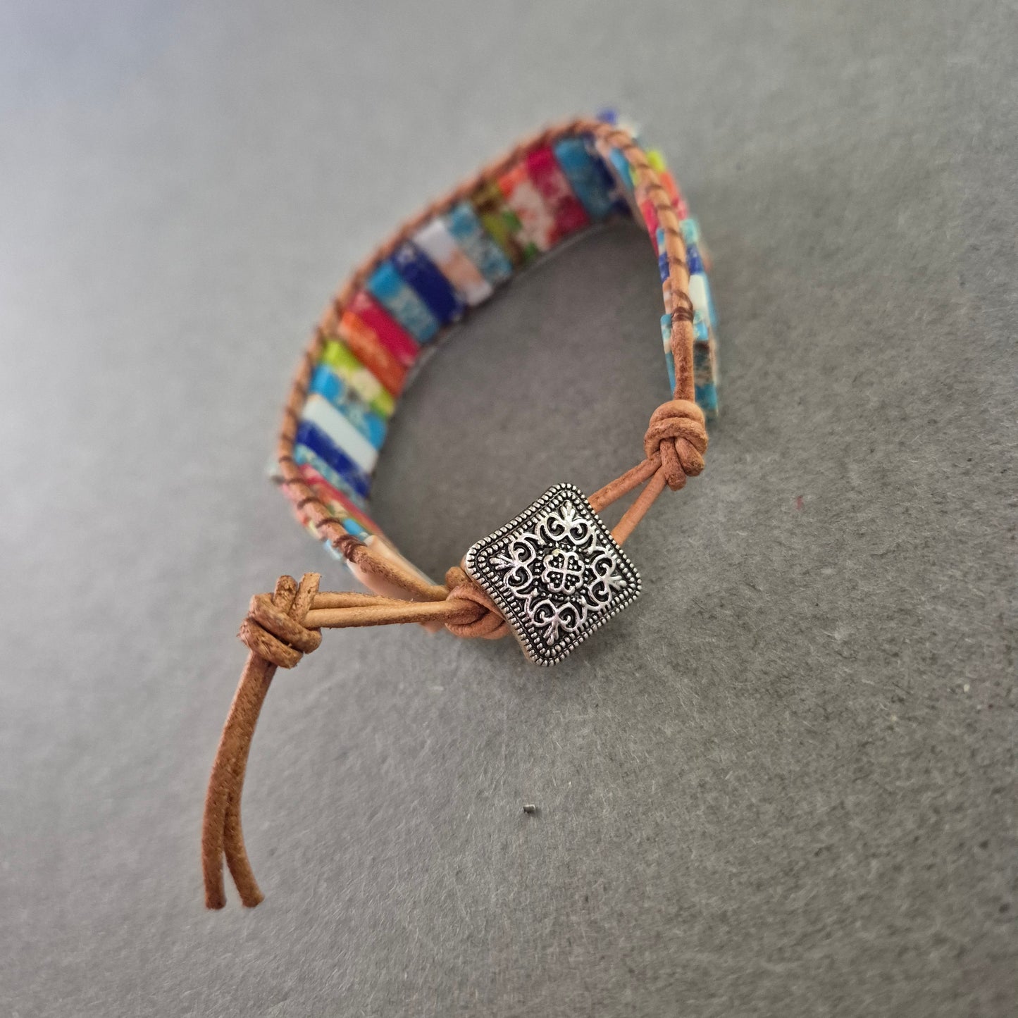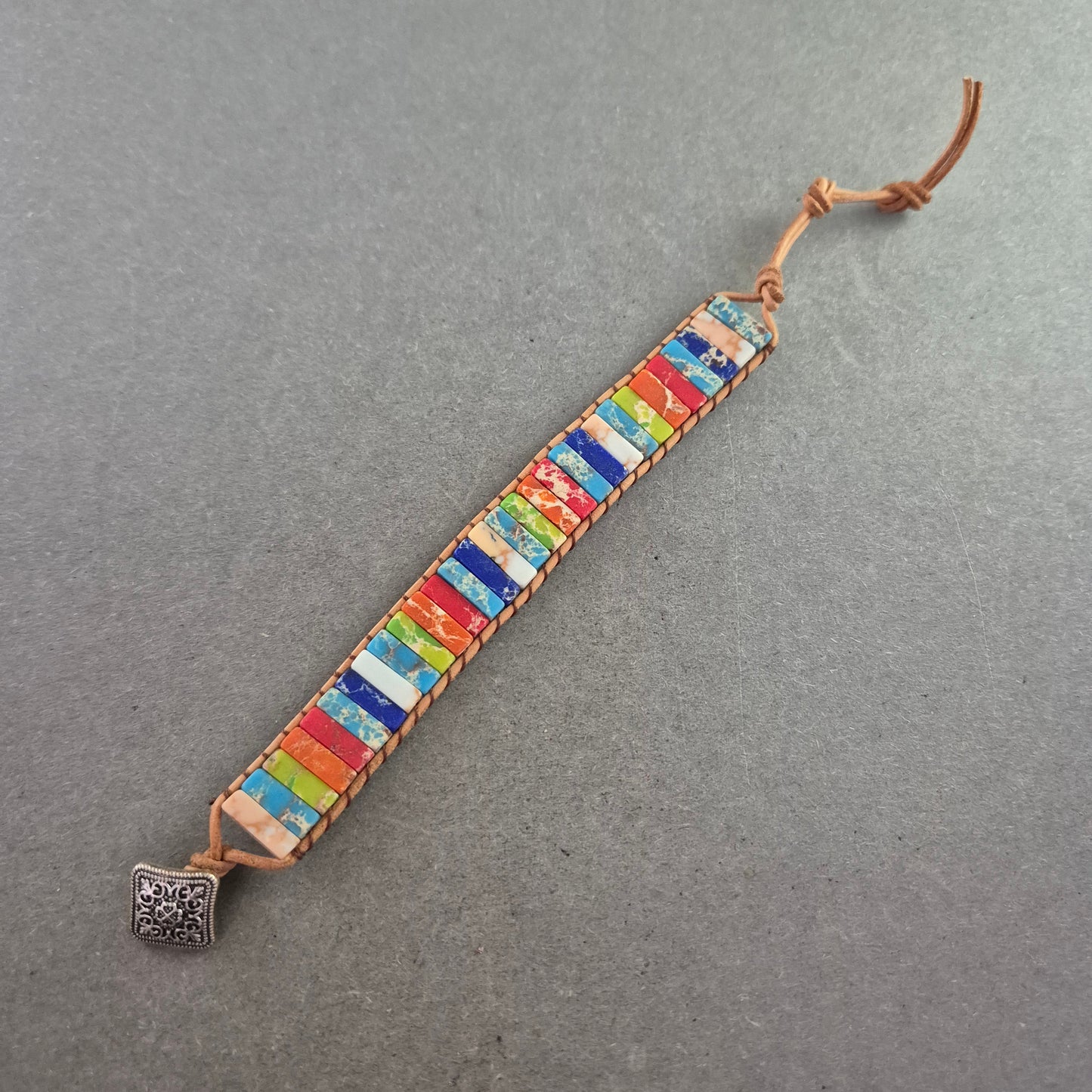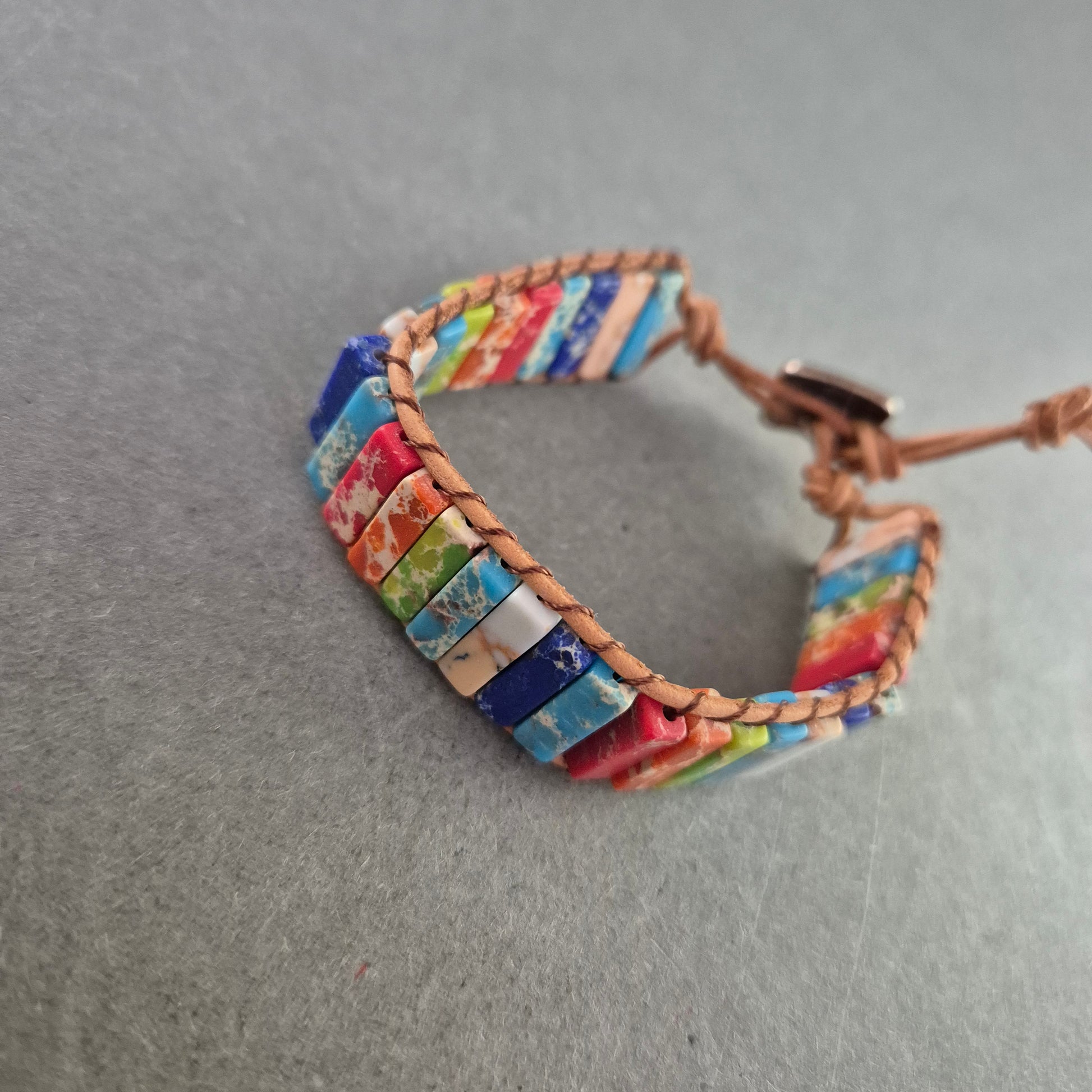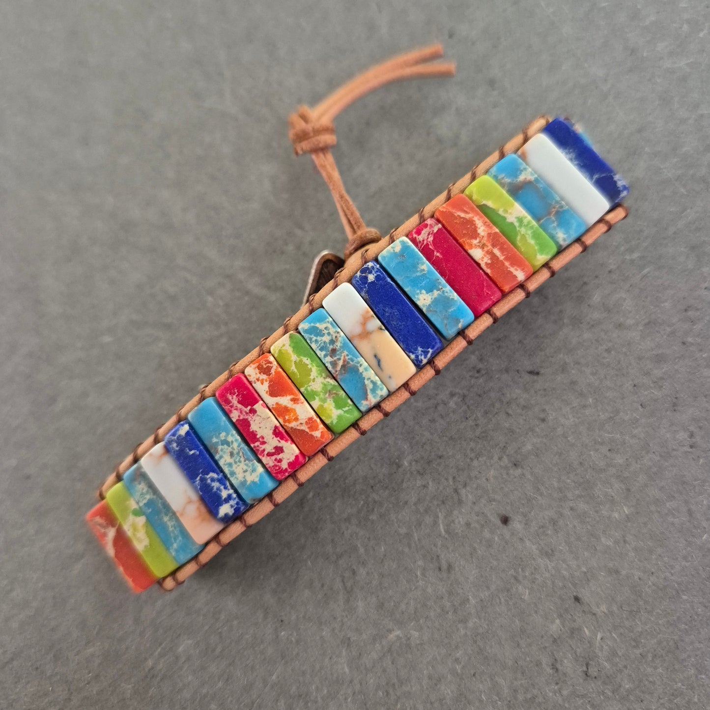 Dieses handgefertigte Armband bringt Farbe ins Spiel! Auf einem robusten Lederband sind rechteckige Perlen in lebendigen Regenbogenfarben aufgereiht – jede mit einer einzigartigen Maserung. Das Armband lässt sich über eine Schlaufe und einen geprägten Metallknopf schließen. Ein ideales Accessoire für Boho-Looks, Festival-Outfits oder als fröhlicher Alltagsbegleiter.