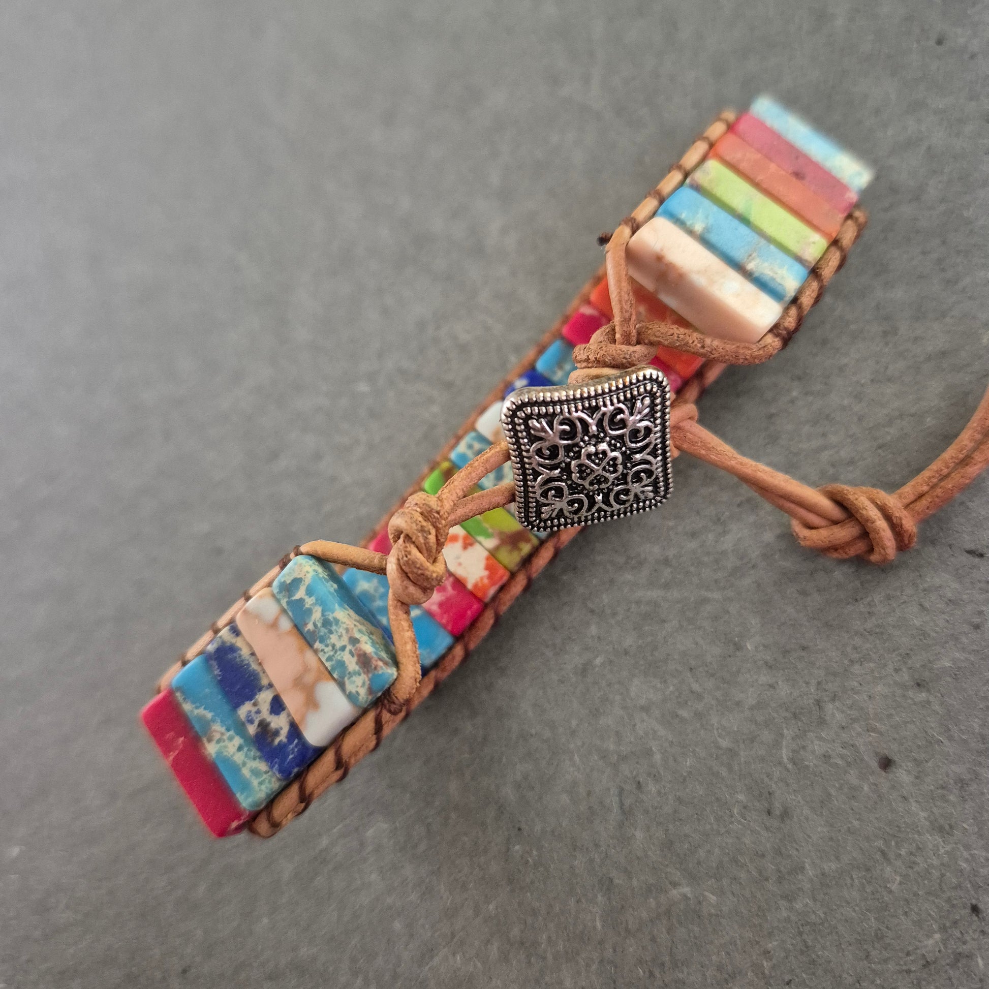 Farbenfrohes Armband mit Steindesign und Lederband