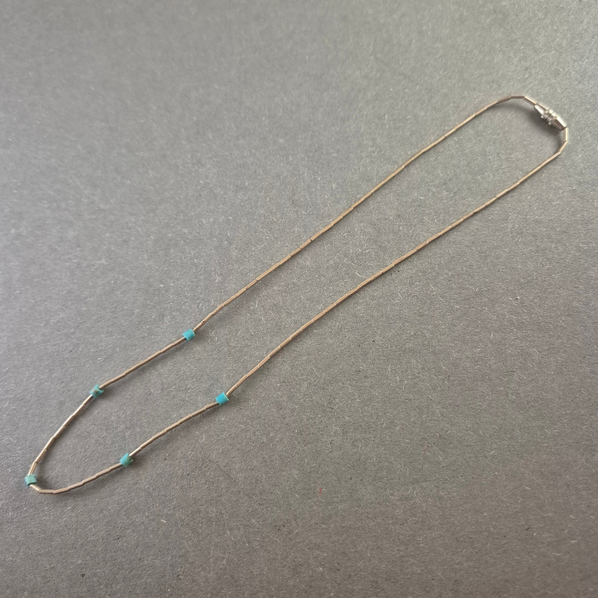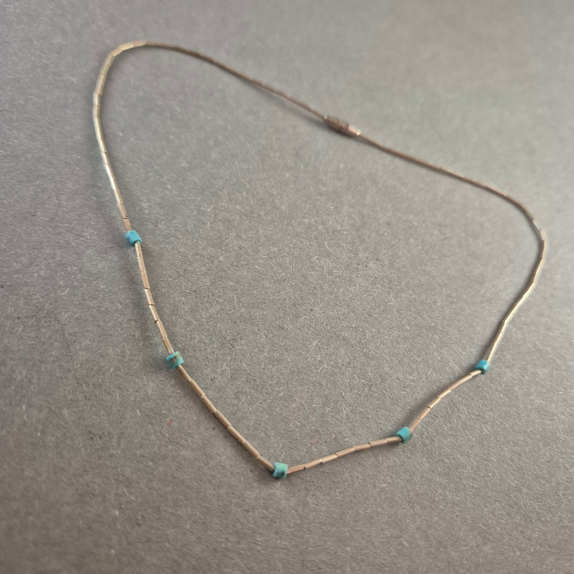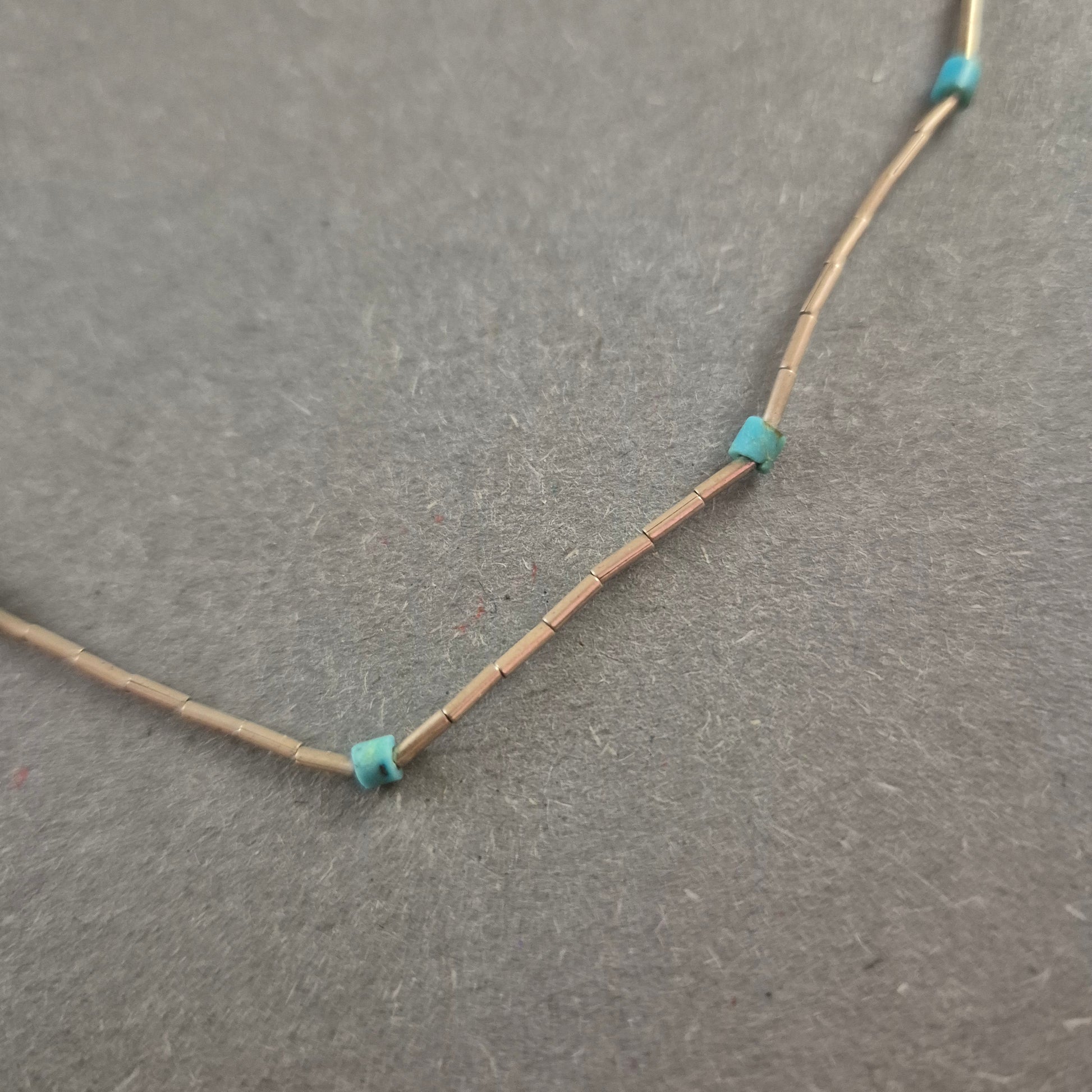 Diese zarte Vintage-Halskette besticht durch ihre filigrane Gestaltung und ihre dezenten türkisfarbenen Perlen. Die schmalen, goldfarbenen Röhrchen aus Metall sorgen für einen edlen Look, der durch die gleichmäßig platzierten Farbakzente aufgelockert wird. Ideal für den Alltag oder zum Layering mit anderen Ketten – dieses Stück verleiht jedem Outfit einen Hauch von Vintage-Charme.