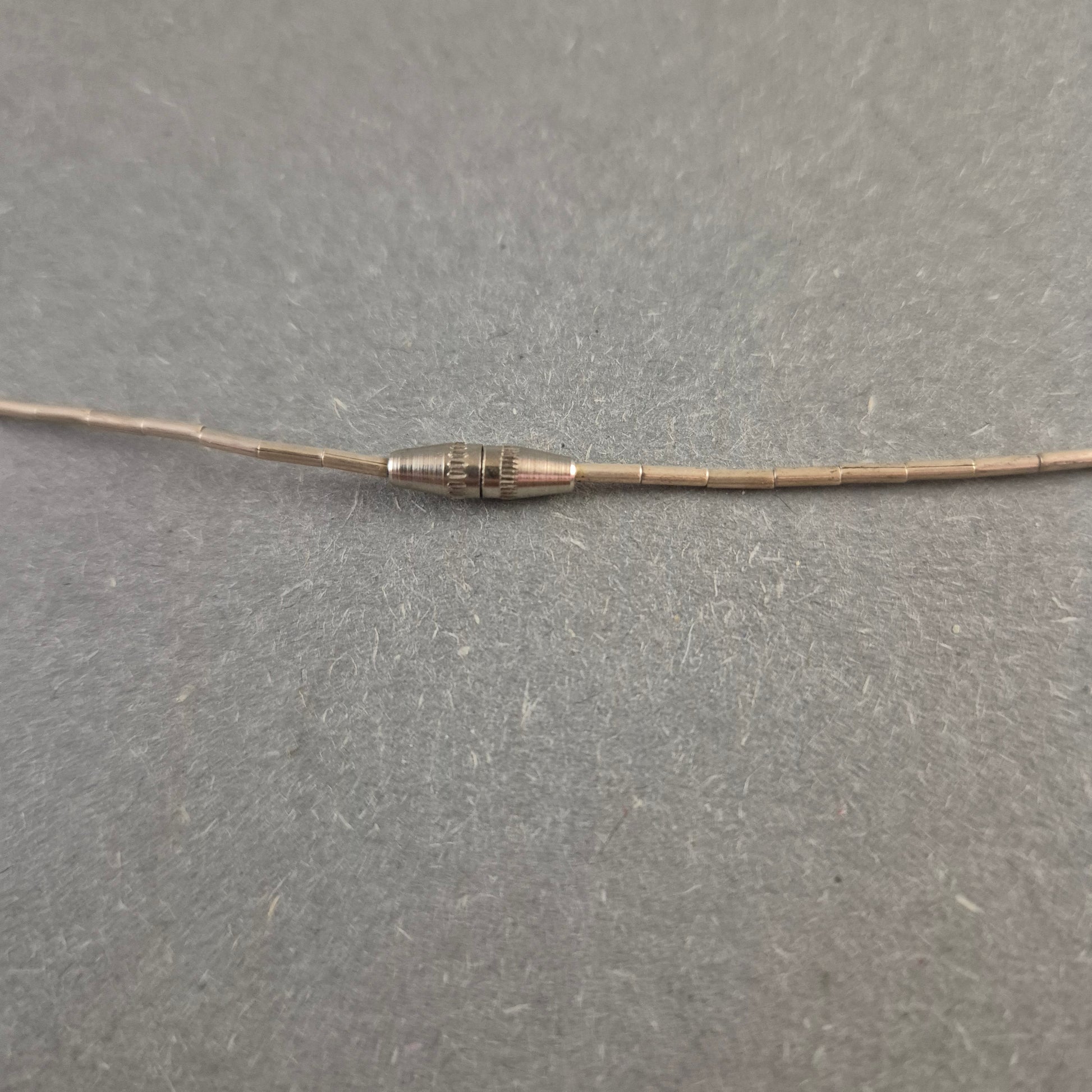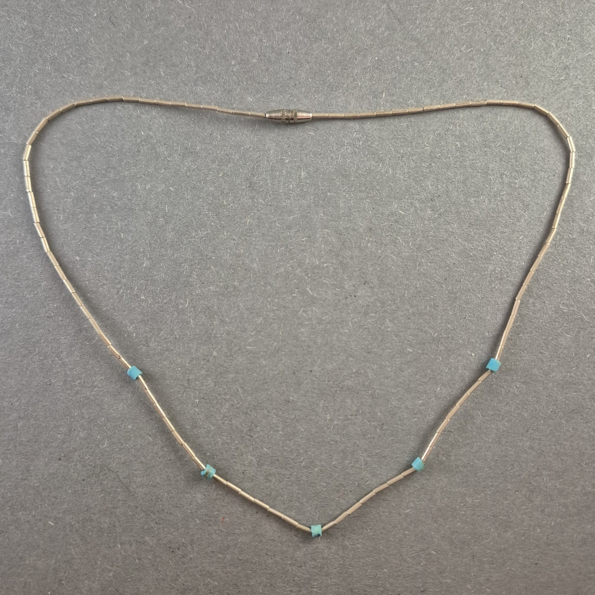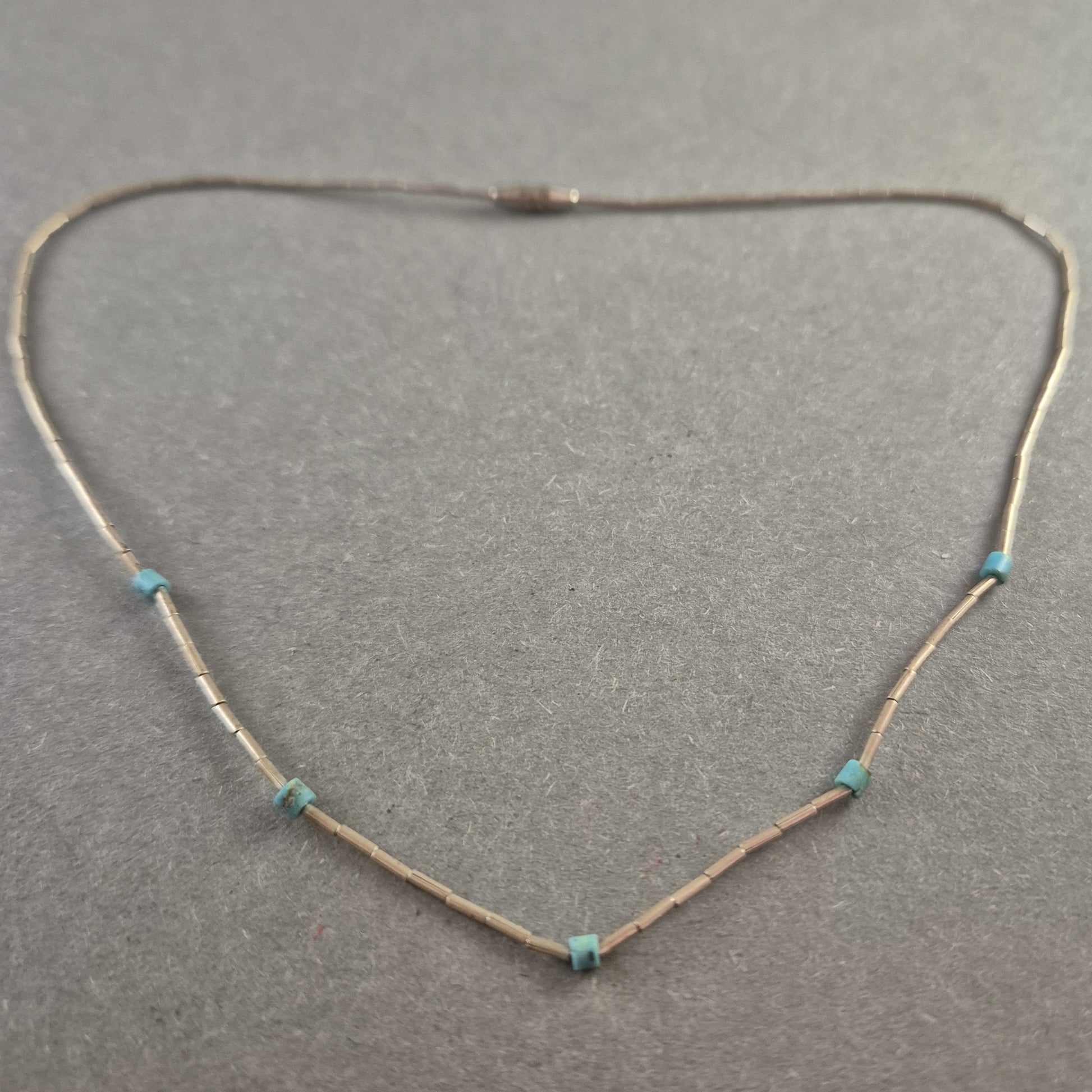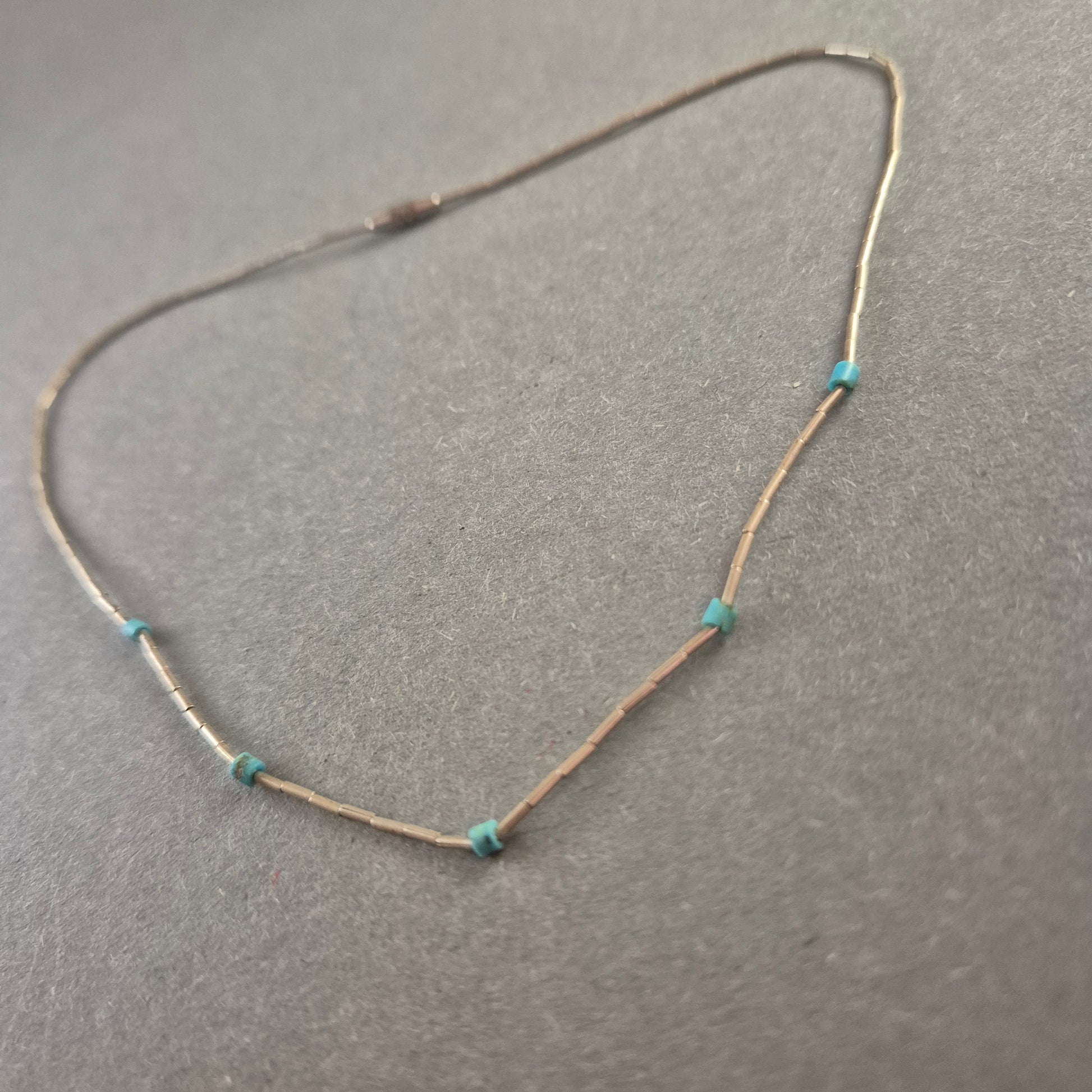 Diese zarte Vintage-Halskette besticht durch ihre filigrane Gestaltung und ihre dezenten türkisfarbenen Perlen. Die schmalen, goldfarbenen Röhrchen aus Metall sorgen für einen edlen Look, der durch die gleichmäßig platzierten Farbakzente aufgelockert wird. Ideal für den Alltag oder zum Layering mit anderen Ketten – dieses Stück verleiht jedem Outfit einen Hauch von Vintage-Charme.