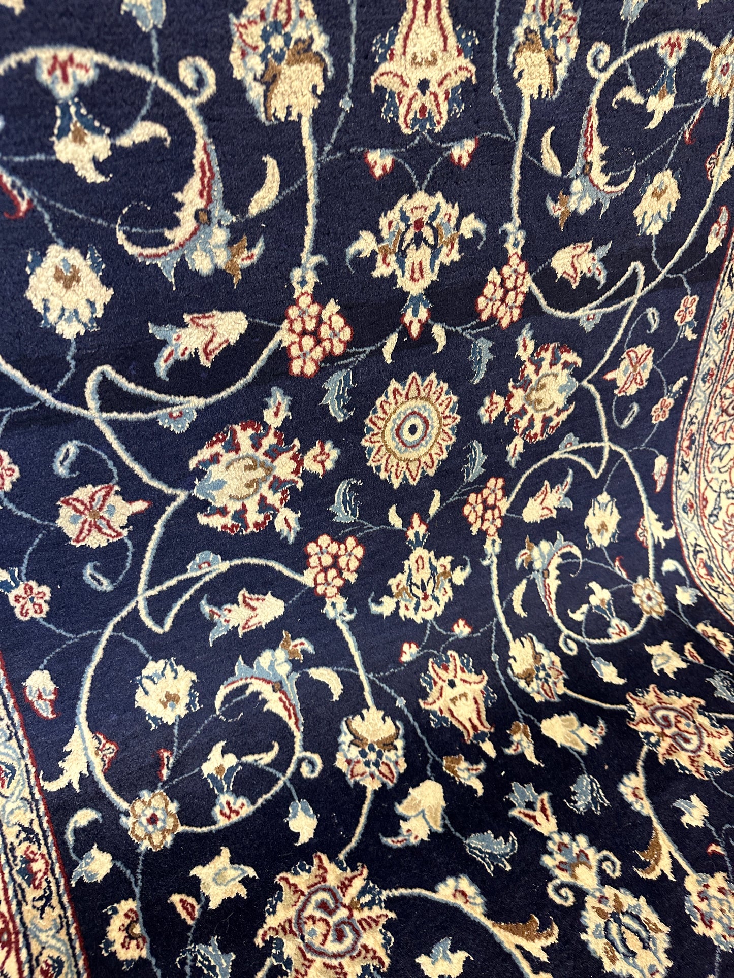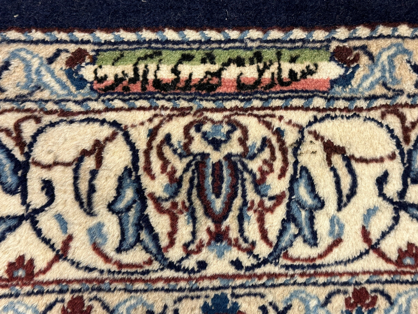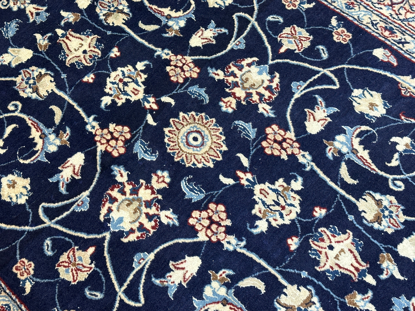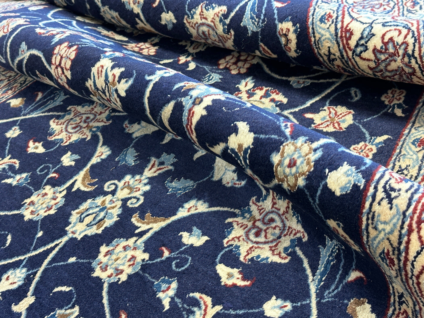 Dieser Teppich wurde sorgfältig gereinigt und präsentiert sich in einem erneuerten Zustand. Seine kunstvollen Details und subtilen Muster spiegeln die Handwerkskunst der Nain-Region wider.