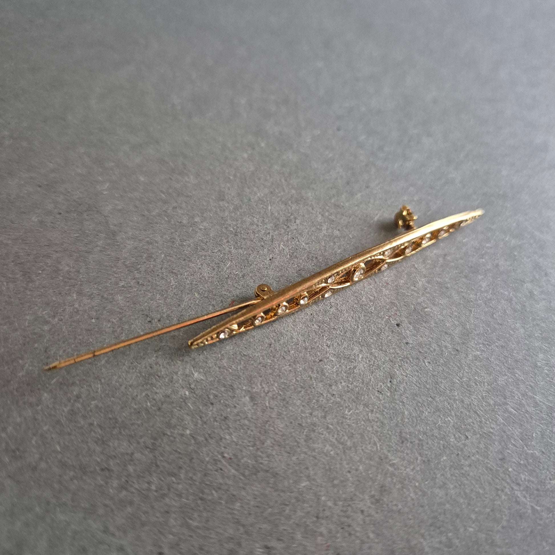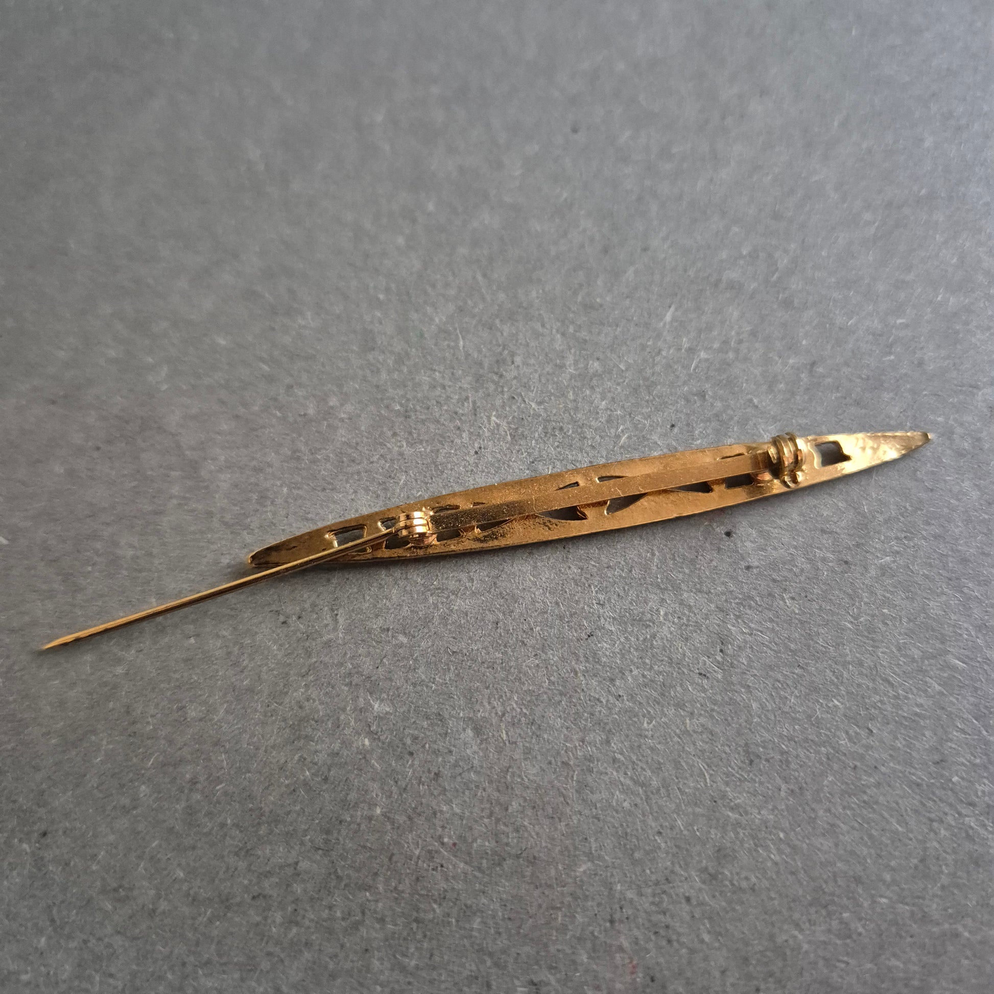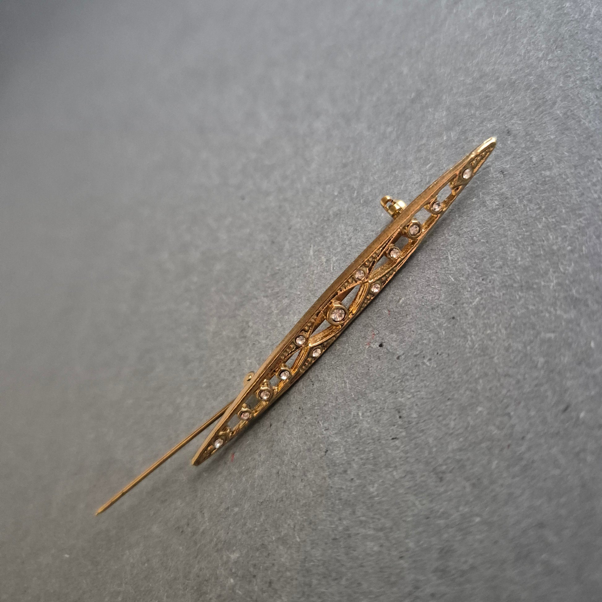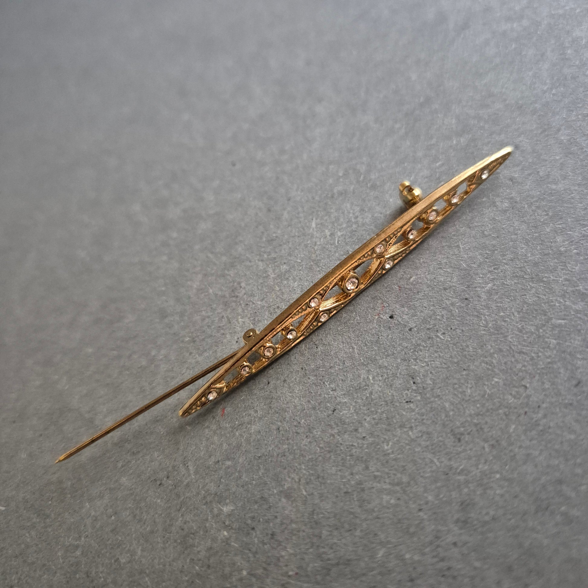Diese elegante, längliche Brosche im Stil des Jugendstils beeindruckt durch ihr feines, durchbrochenes Design und eine zarte Verzierung mit kleinen Strasssteinen. Die goldfarbene Oberfläche unterstreicht den edlen Charakter der Brosche und macht sie zu einem zeitlosen Accessoire für Blusen, Kleider oder Tücher.