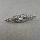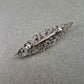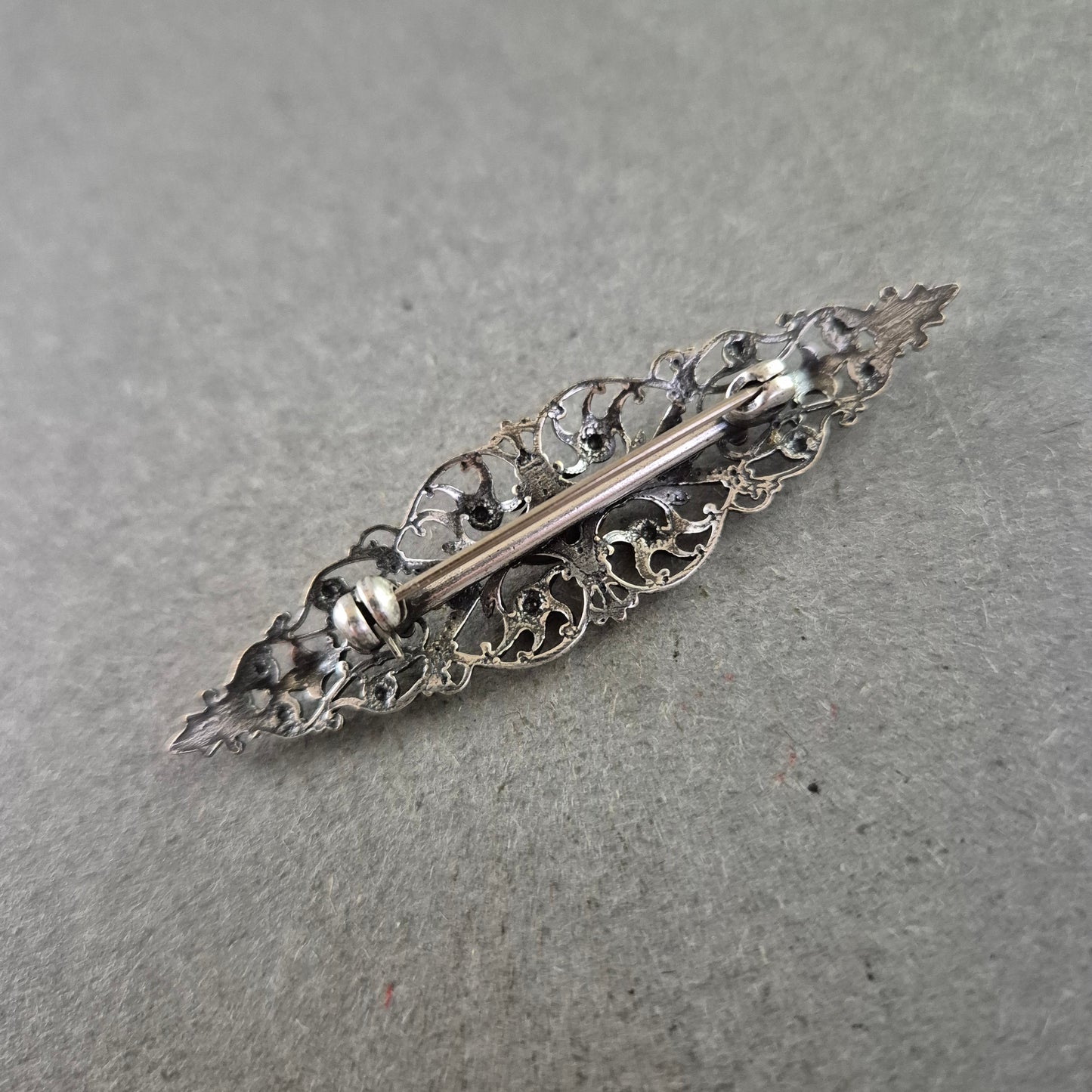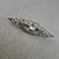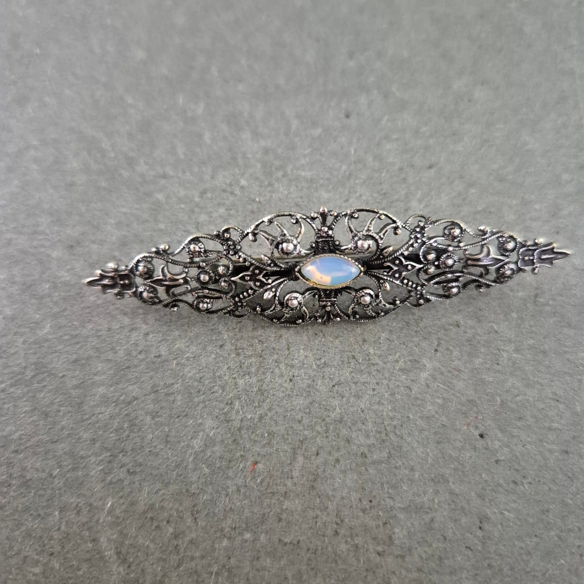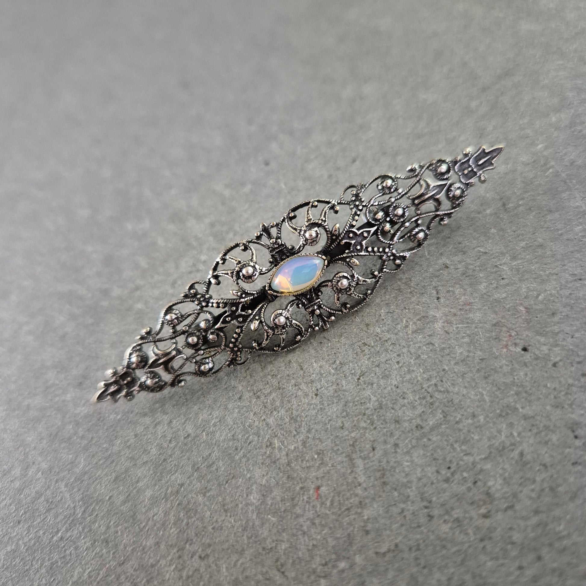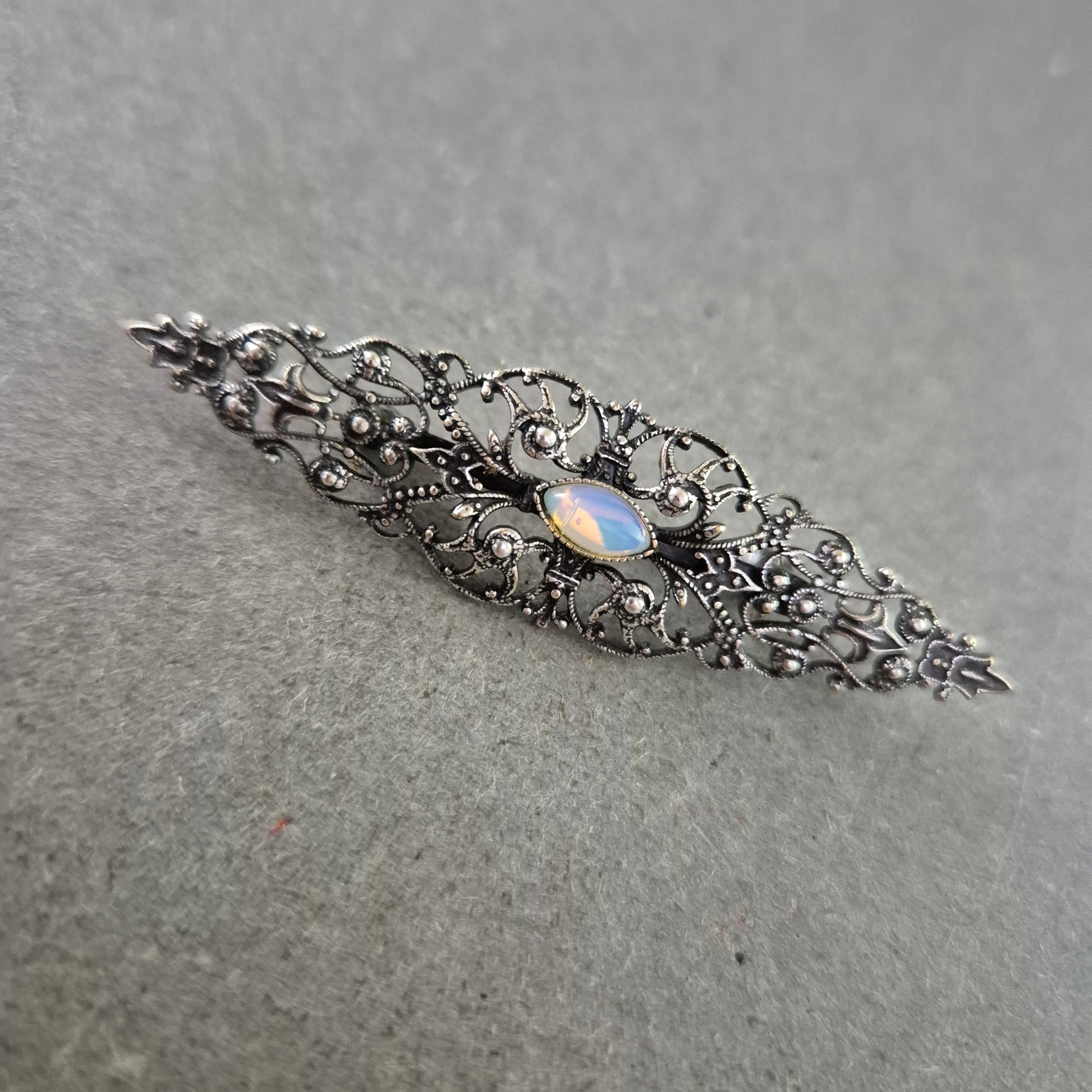 Diese elegante Vintage Brosche besticht durch ihr detailreiches filigranes Design in silberfarbenem Metall. Das langgezogene, navette-förmige Motiv wird von einem schimmernden Stein in Opal-Optik im Zentrum gekrönt. Ein kunstvolles Vintage-Accessoire, das klassischen Charme und Eleganz ausstrahlt und Blicke auf sich zieht.