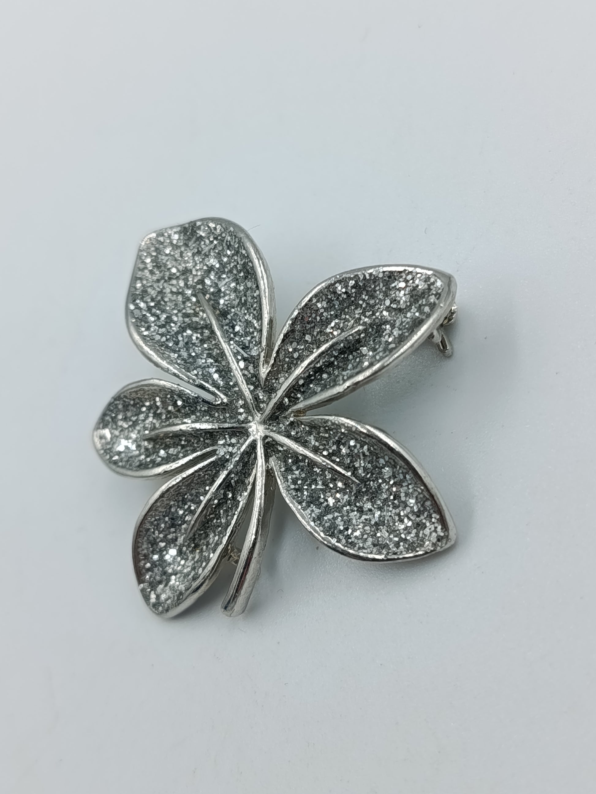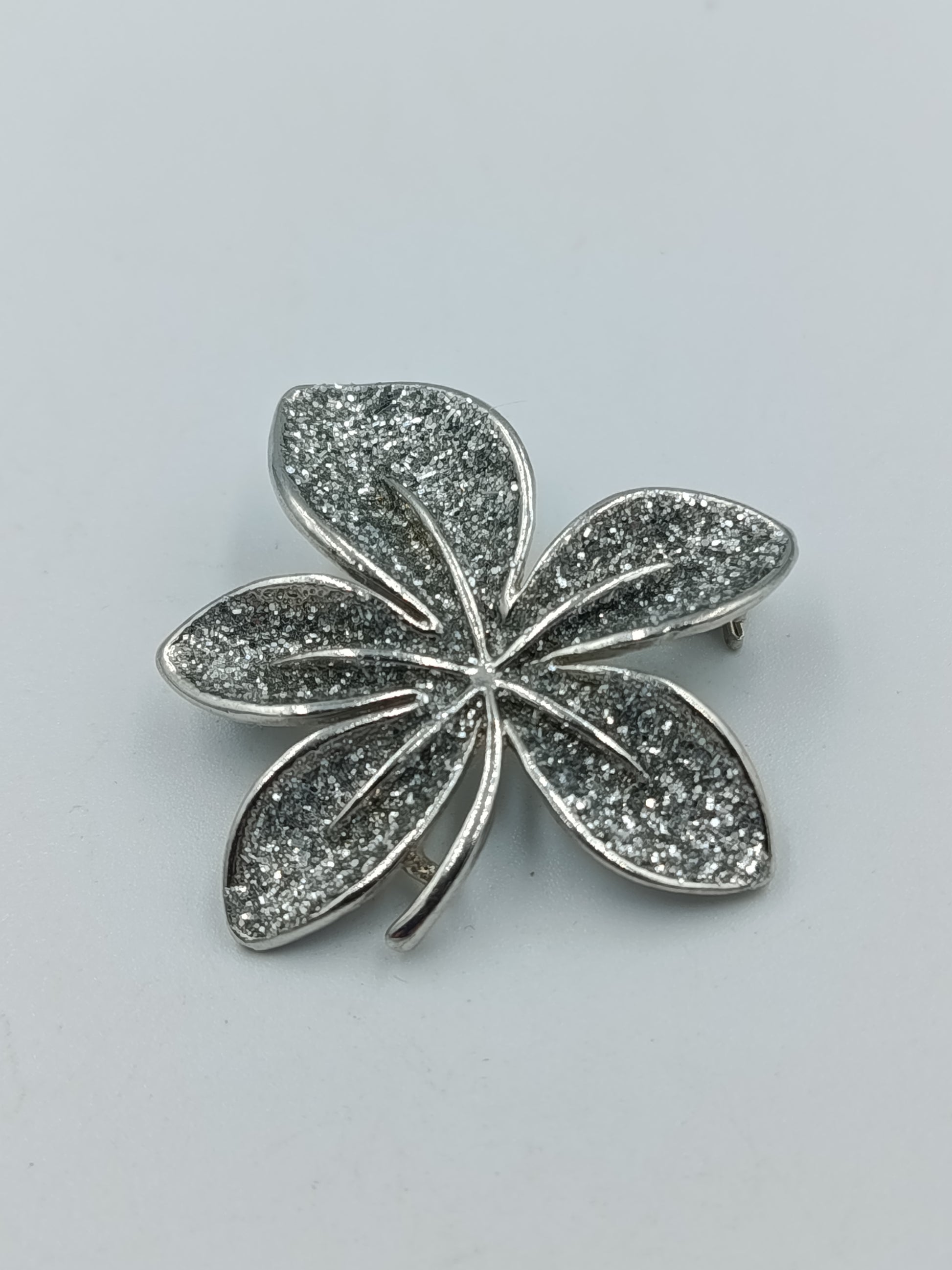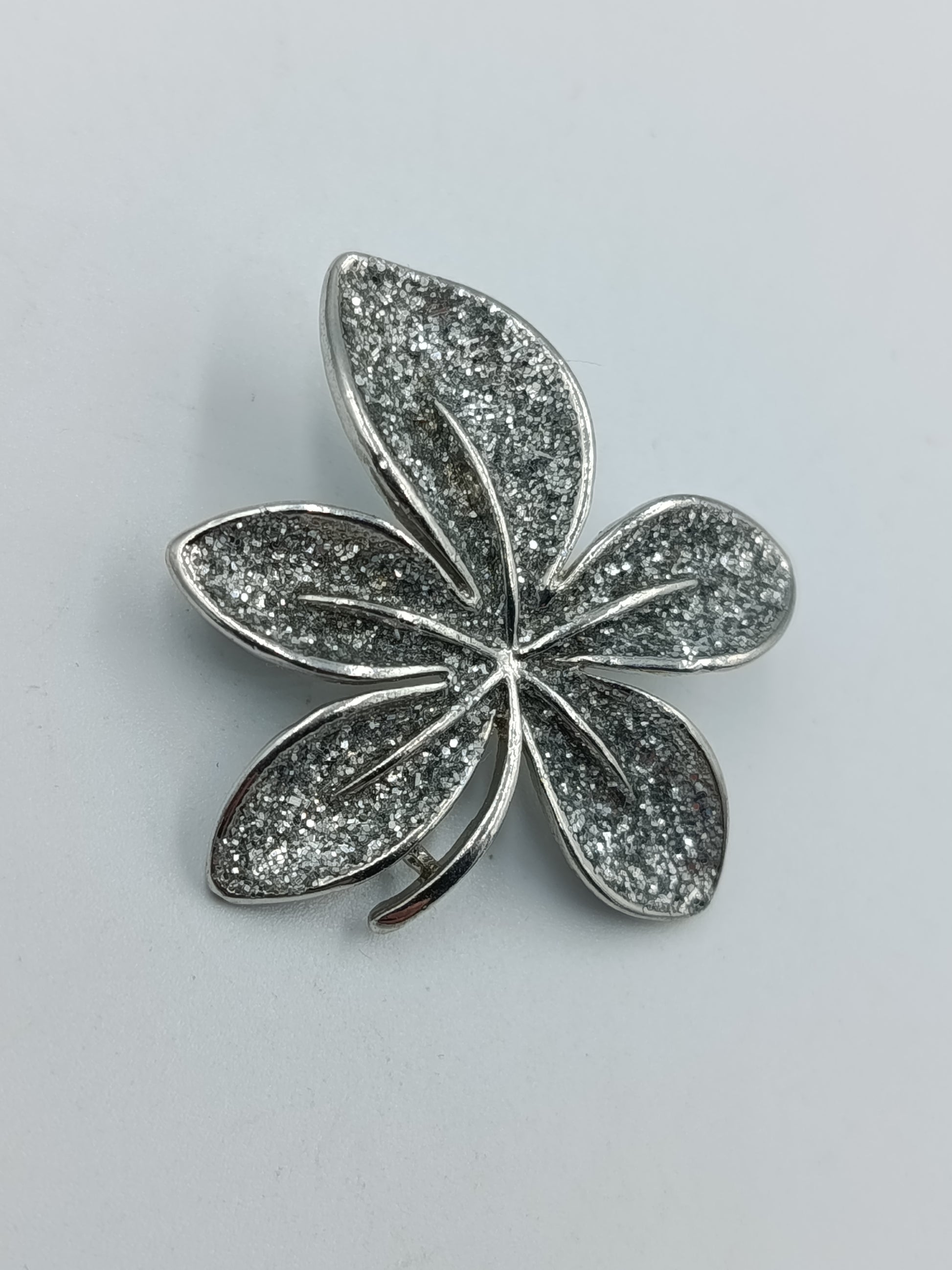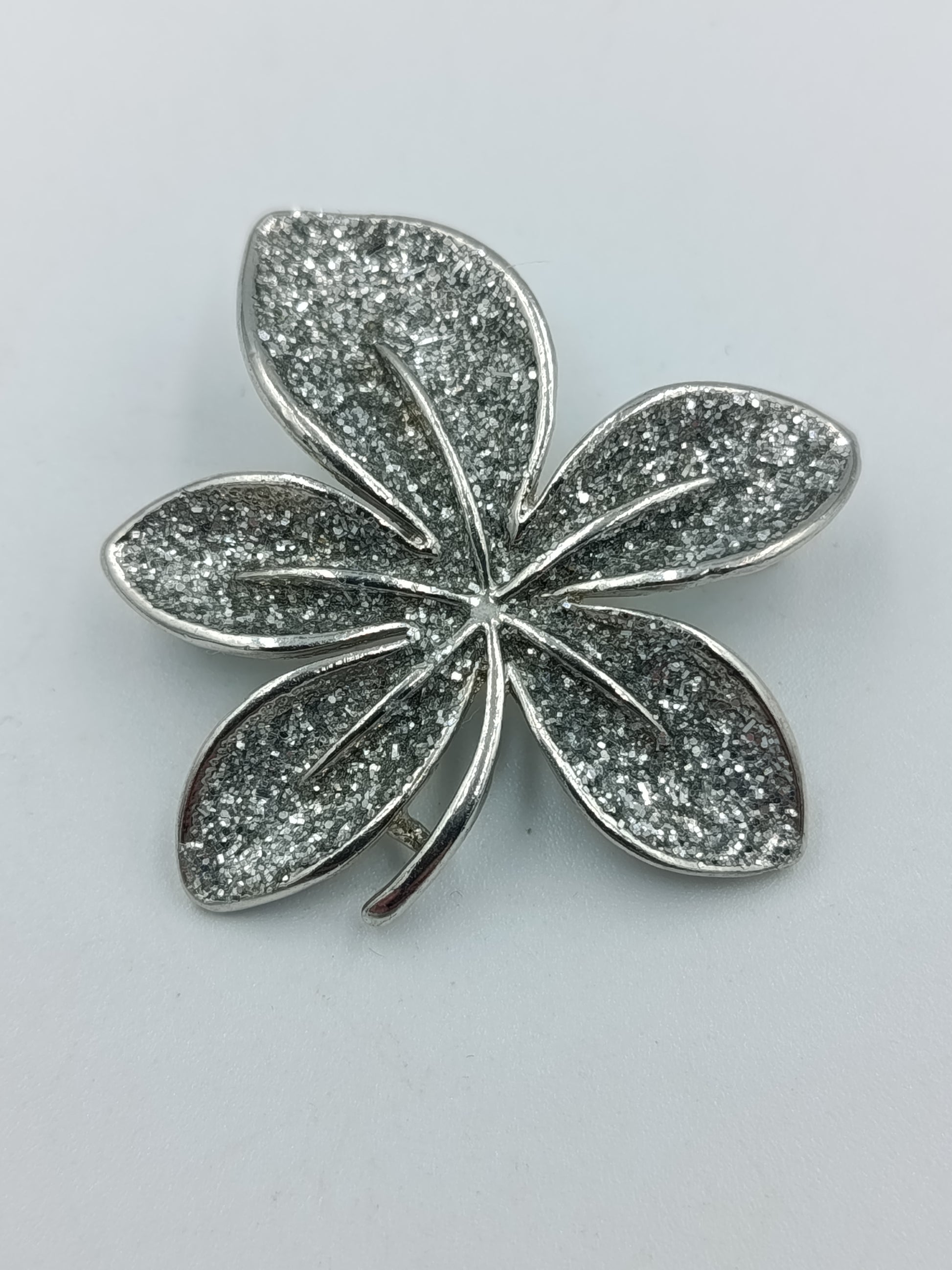 Elegante Brosche in Form eines fünfblättrigen Blattes, komplett in edler Silberoptik gestaltet. Die Blätter sind mit funkelndem Glitzer überzogen, was der Brosche einen glamourösen Look verleiht. Ideal als stilvolles Accessoire für Blusen, Jacken oder Schals und perfekt geeignet, um jedem Outfit einen Hauch von Eleganz zu verleihen.