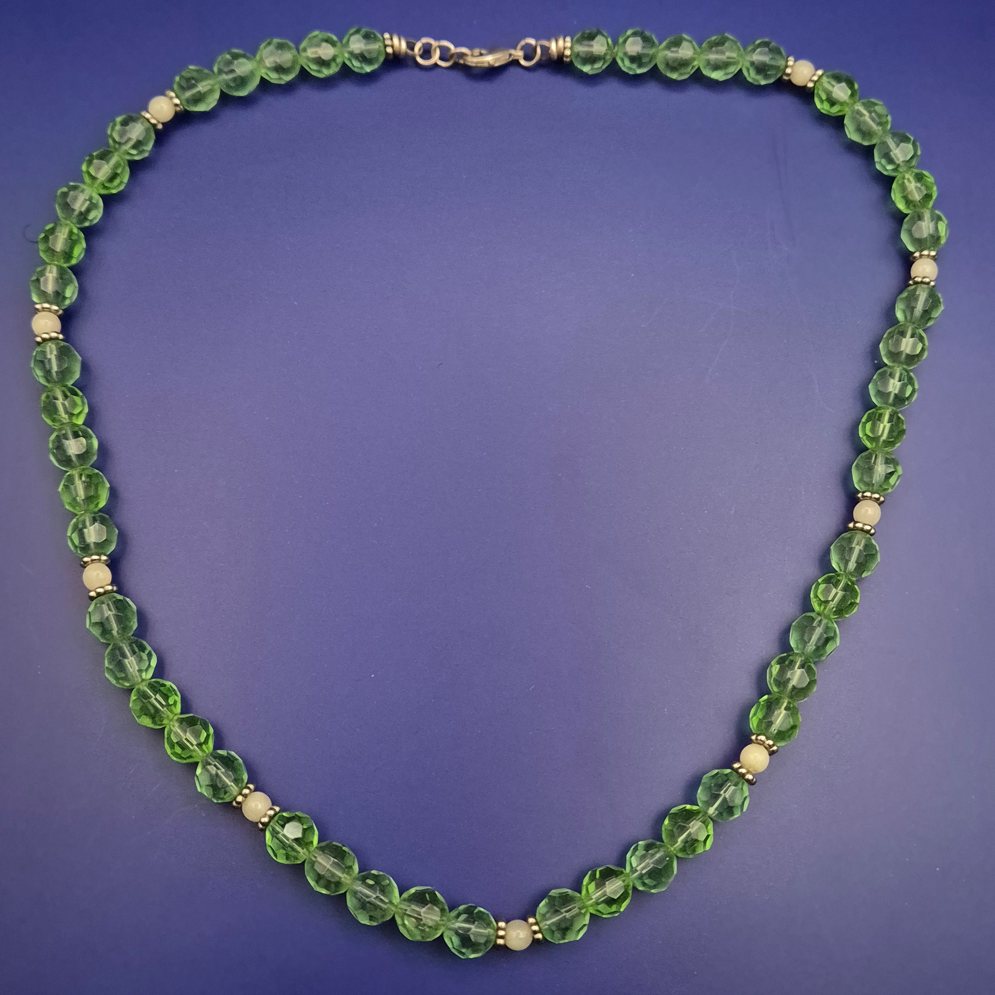 Diese elegante Halskette besteht aus zahlreichen facettierten, hellgrünen Glasperlen, die ein wunderschönes Funkeln erzeugen. Die runden Perlen sind gleichmäßig in Prinzessinnen-Länge aufgereiht und werden durch kleine, helle Perlmutt- oder Kunstperlen sowie zarte, silberfarbene Metall-Spacer akzentuiert. Die lebendige grüne Farbe und der feine Schliff machen diese Kette zu einem leichten und femininen Accessoire.